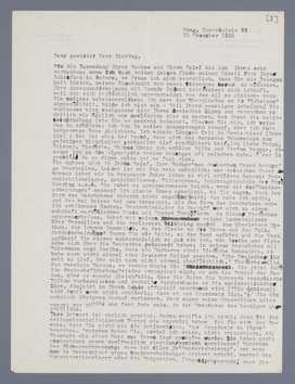 Sie mahnen mich in Ihrem Brief, Ihre Bücher ‘aus deutschem Wesen heraus’ zu beurteilen. Leider ist mir das rein unmöglich; aus deutschem Wesen heraus haben wir im vergangen Jahre schon zu viel erklären müssen: Konzentrationslager, [Antisemitismus], Hitlergruss, Reichtagskandale des Herrn Goering u.s.w. Sie haben es gewissermassen leicht, wenn sie das ‘Randerscheinungen’ nennen! Ich glaube Ihnen unbedingt, wo Sie sagen, das der Kern des Geschehens dadurch nicht angerührt wird; das habe ich nicht, und das hat keiner bei uns behauptet. Als den Kern des Geschehens sehe ich Schlimmere Sachen. Deutschland, das im Begriff war sich zu einem wahrhaft europäischen Staat mit ‘guten Europäern im Sinne Nietzsches emporzuarbeiten, kehrt mit seinem ewigen Lamentationen über Versailles und den verlorenen Weltkrieg zurück zum überlebten Mythus, zur lehren Romantik, zu dem Glaube an die Rasse und das Volk. Randerscheinungen? Sagen Sie mir bitte, wo der Rand aufhört und die Kern anfängt! Sie wissen wahrscheinlich so gut wie ich, wie Goethe und [Nietzsche] sich über die Deutschen geäussert haben; in seinen Gesprächen mit Eckermann sagt Goethe, dass sie Barbaren sind; Nietzsche behauptet, es habe noch nicht einmal eine deutsche Kultur gegeben. ‘Ihr Deutsche, ihr seit so tief, ihr seit noch nicht einmal oberflächlich.’ Nietzsche wollte das vereinte Europa, er verabscheute die!, die jetzt durch die deutsche ‘Erhebung’ wieder propagiert wird; er sah die fehler der Juden, aber er wusste gleichfalls, dass die Juden die kommende europäische Kultur vorbereiteteten und deshalb durchschaute er die [antisemitische] Lüge, die jetzt in Ihrem Lande offiziell anerkannt wird (‘Ein Antisemit wird damit noch nicht anständig, dass er aus Grundsatz lügt.’) Sie können sich übrigens darauf verlassen, dass sogar meine Grosseltern Arier waren; nur möchte man fast Jude sein, in den Umständen des heutigen Augenblicks.