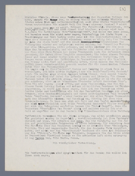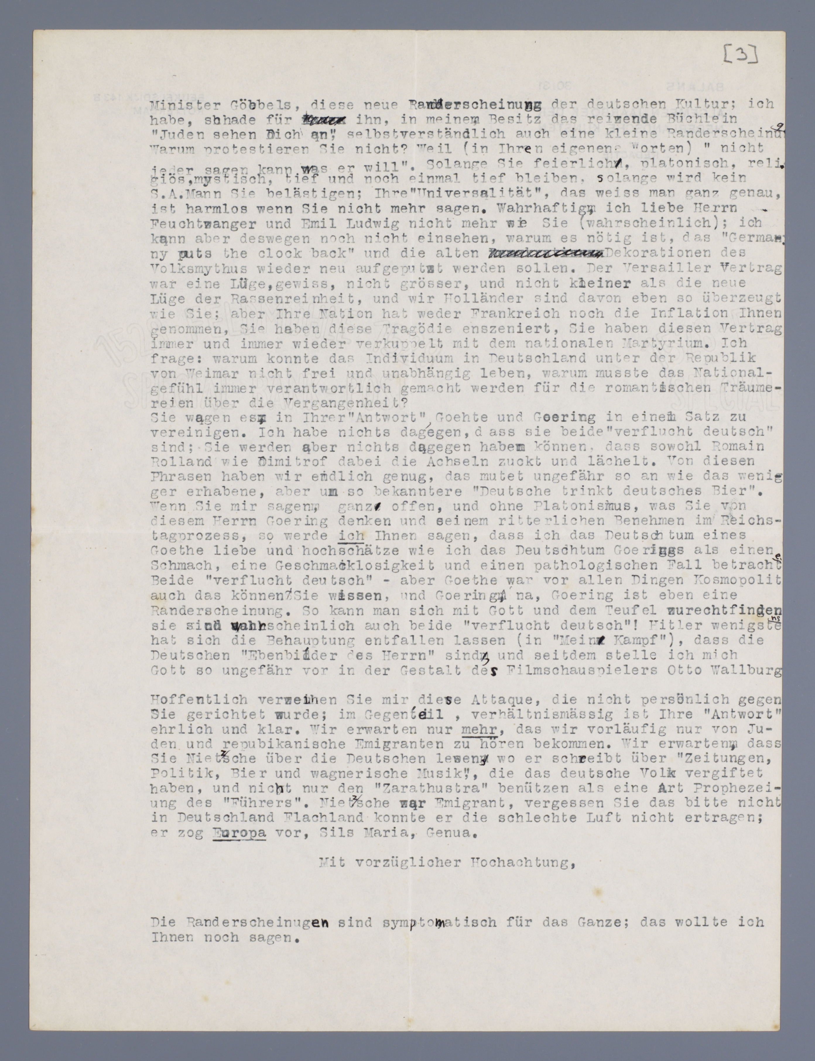 Hoffentlich verzeihen Sie mir diese Attaque, die nicht persönlich gegen Sie gerichtet wurde; im Gegenteil, verhältnismässig ist Ihre ‘Antwort’ ehrlich und klar. Wir erwarten nur mehr, das wir vorläufig nur von Juden und [republikanische] Emigranten zu hören bekommen. Wir erwarten, dass Sie Nietzsche über die Deutschen lesen, wo er schreibt über ‘Zeitungen, Politik, Bier und wagnerische Musik’, die das deutsche Volk vergiftet haben, und nicht nur den ‘Zarathustra’ benützen als eine Art Prophezeiung des ‘Führers’. Nietzsche war Emigrant, vergessen Sie das bitte nicht[;] in Deutschland Flachland konnte er die schlechte Luft nicht ertragen; er zog Europa vor, Sils Maria, Genua.