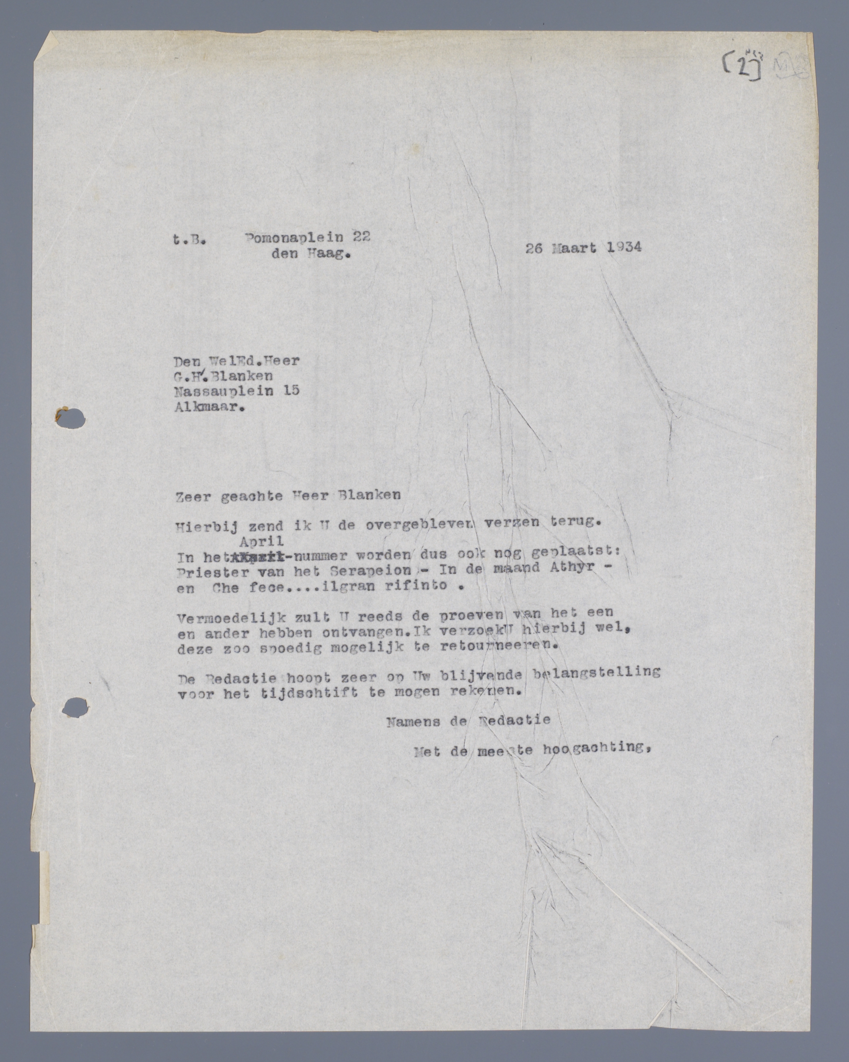 Vermoedelijk zult U reeds de proeven van het een en ander hebben ontvangen. Ik verzoek U hierbij wel, deze zoo spoedig mogelijk te retourneren.