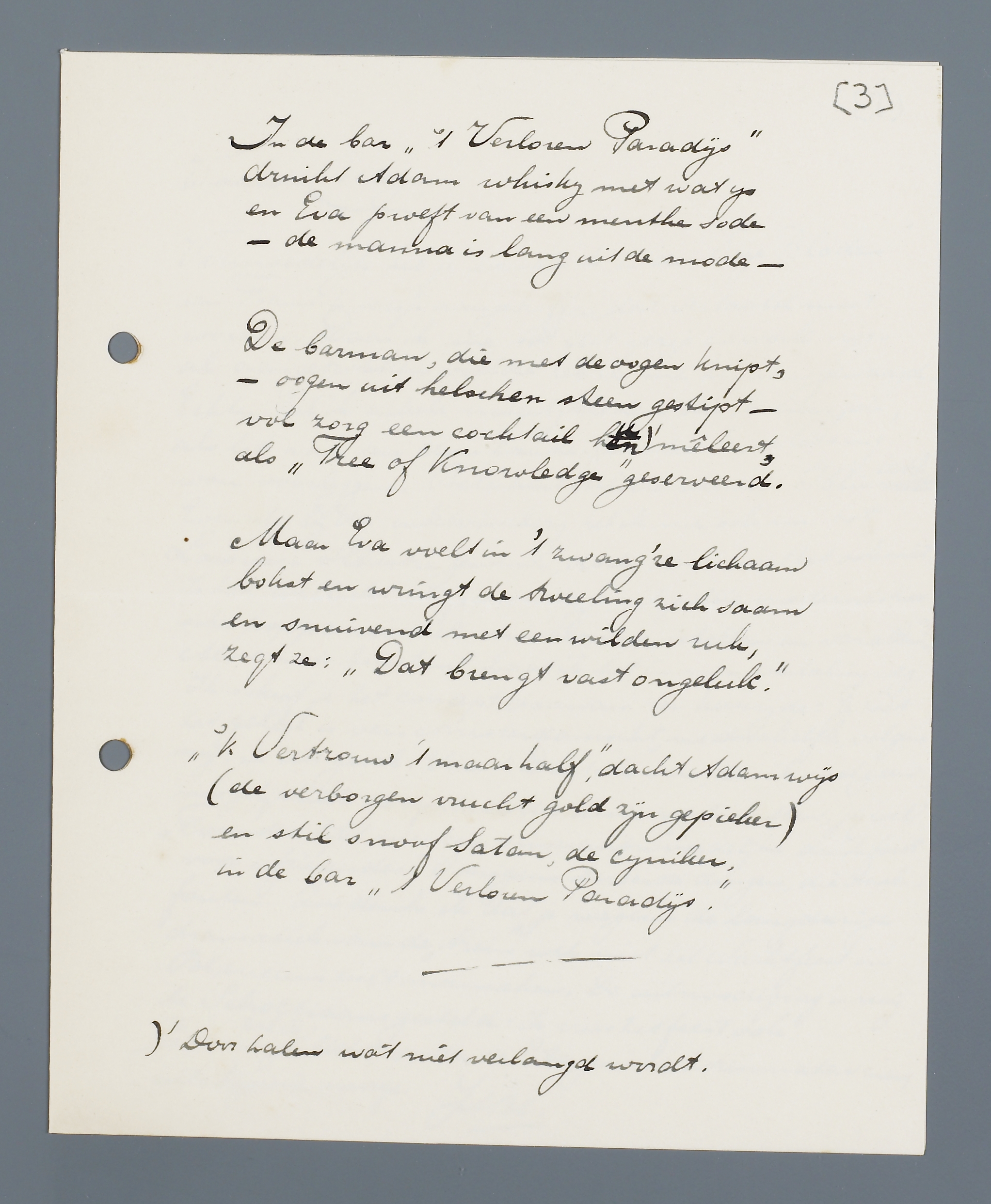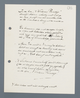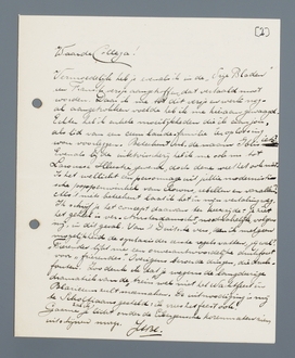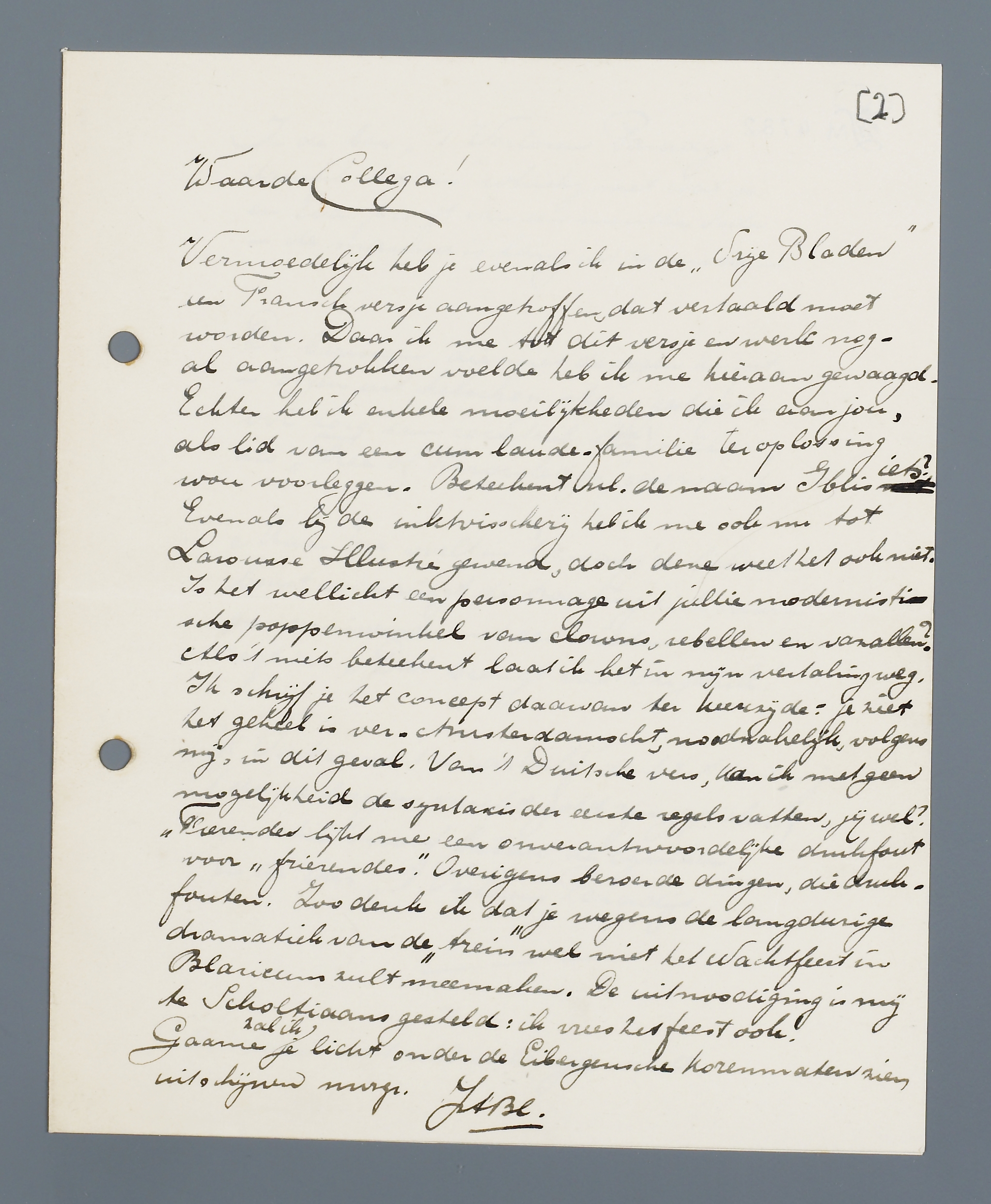 Vermoedelijk heb je evenals ik in de ‘Vrije Bladen’ een Fransch versje aangetroffen, dat vertaald moet worden. Daar ik me tot dit versje en werk nogal aangetrokken voelde heb ik me hieraan gewaagd. Echter heb ik enkele moeilijkheden die ik aan jou, als lid van een cum laude-familie ter oplossing wou voorleggen. Beteekent nl. de naam Iblis iets? Evenals bij de inktvisscherij heb ik me ook nu tot Larousse Illustré gewend, doch deze weet het ook niet. Is het wellicht een personage uit jullie modernistische poppenwinkel van clowns, rebellen en vazallen? Als 't niets beteekent laat ik het in mijn vertaling weg. Ik schrijf je het concept daarvan ter keerzijde - je ziet het geheel is ver-Amsterdamscht, noodzakelijk, volgens mij, in dit geval. Van 't Duitsche vers, kan ik met geen mogelijkheid de syntaxis der eerste regels vatten, jij wel? ‘Tierendes’ lijkt me een onverantwoordelijke drukfout voor ‘frierendes’. Overigens beroerde dingen, die drukfouten. Zoo denk ik dat je wegens de langdurige dramatiek van de ‘trein’ wel niet het Nachtfeest in Blaricum zult meemaken. De uitnoodiging is mij te Scholtiaans gesteld: ik vrees het feest ook.