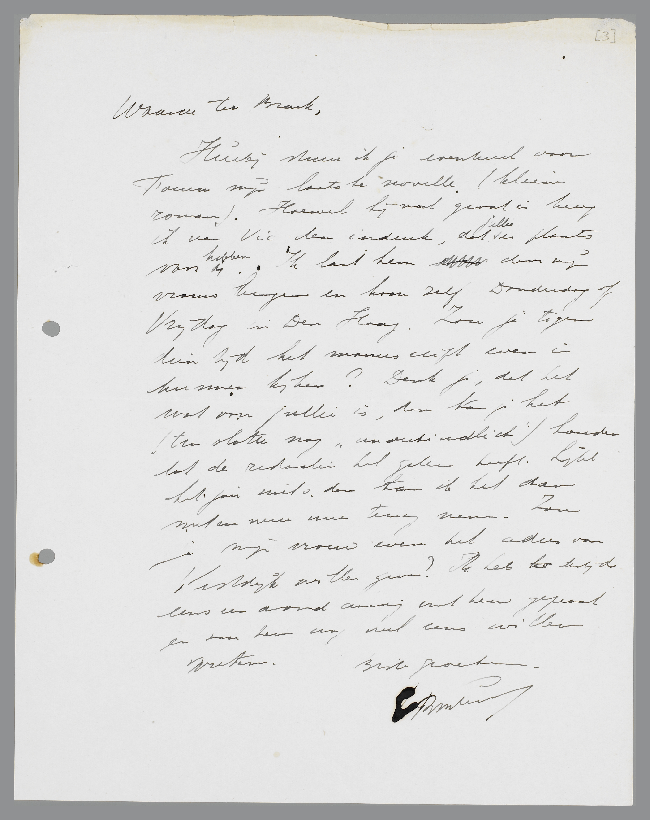 Hierbij stuur ik je eventueel voor Forum mijn laatste novelle (kleine roman). Hoewel hij wat groot is kreeg ik van Vic den indruk, dat jullie er plaats voor hebben. Ik laat hem door mijn vrouw brengen en kom zelf Donderdag of Vrijdag in Den Haag. Zou je tegen dien tijd het manuscript even in kunnen kijken? Denk je, dat het wat voor jullie is, dan kan je het (ten slotte nog ‘[woord onleesbaar]’) houden tot de redactie het gelezen heeft. Lijkt het jou niets kan ik het dan meteen weer mee terug nemen. Zou je mijn vrouw even het adres van Vestdijk willen geven? Ik heb destijds eens een avond aardig met hem gepraat en zou hem nog wel eens willen spreken.