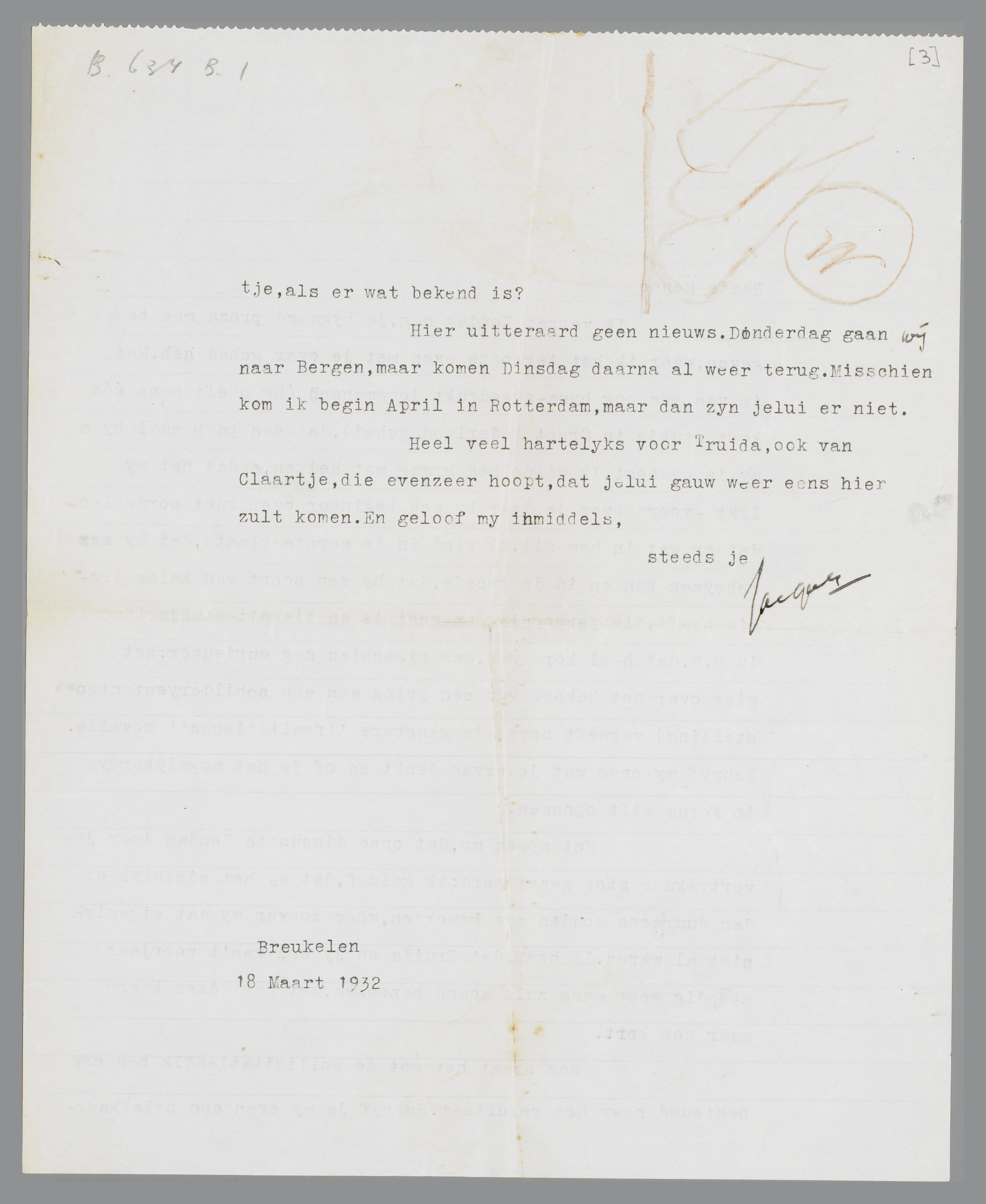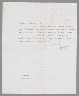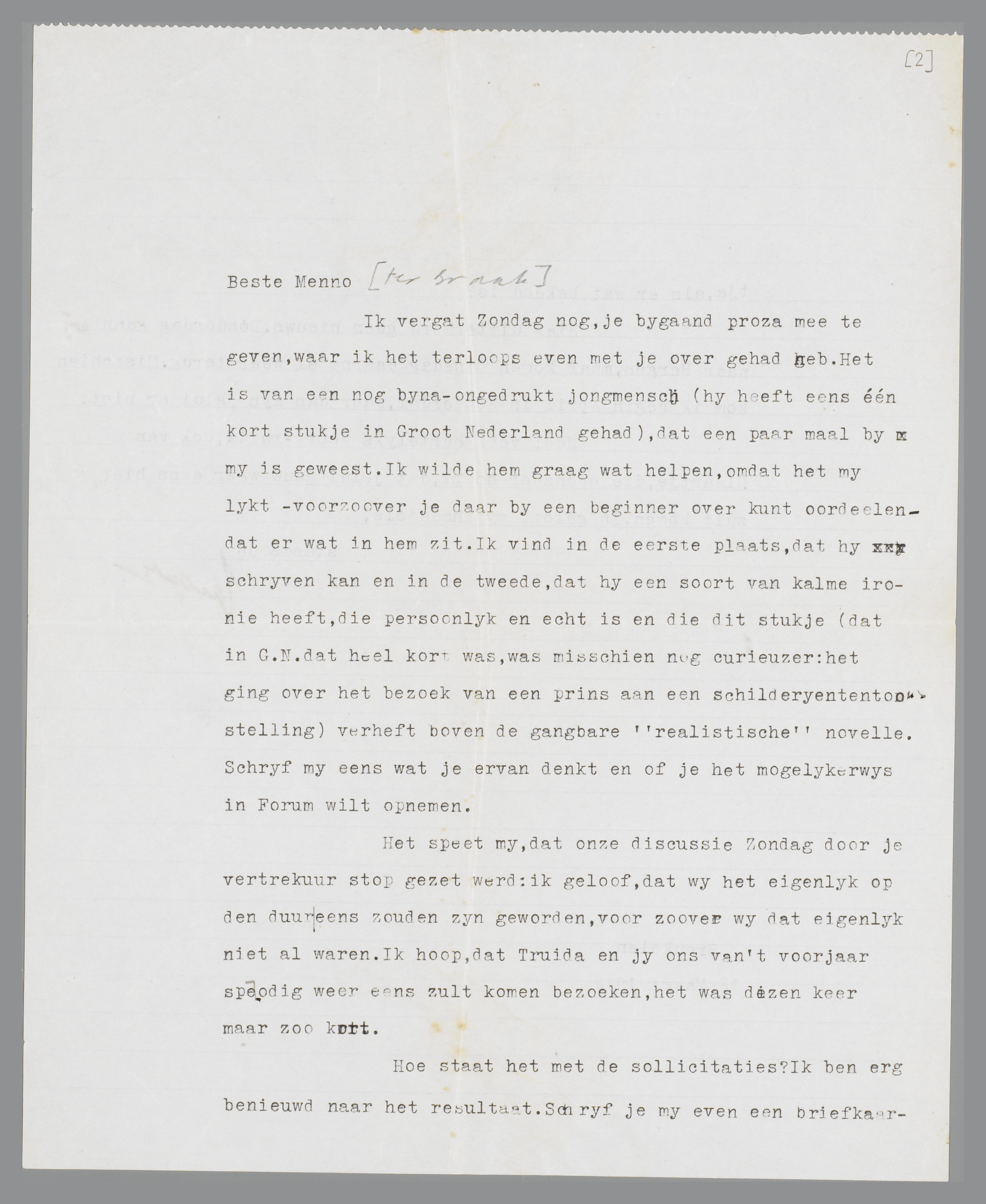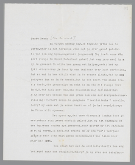 Ik vergat Zondag nog, je bijgaand proza mee te geven, waar ik het terloops even met je over gehad heb. Het is van een nog bijna-ongedrukt jongmensch (hij heeft eens één kort stukje in Groot Nederland gehad), dat een paar maal bij mij is geweest. Ik wilde hem graag wat helpen, omdat het mij lijkt - voorzoover je daar bij een beginner over kunt oordeelen - dat er wat in hem zit. Ik vind in de eerste plaats, dat hij schrijven kan en in de tweede, dat hij een soort van kalme ironie heeft, die persoonlijk en echt is en die in dit stukje (dat in G.N. dat heel kort was, was misschien nog curieuzer: het ging over het bezoek van een prins aan een schilderijtentoonstelling) verheft boven de gangbare ‘realistische’ novelle. Schrijf mij eens wat je ervan denkt en of je het mogelijkerwijs in Forum wilt opnemen.