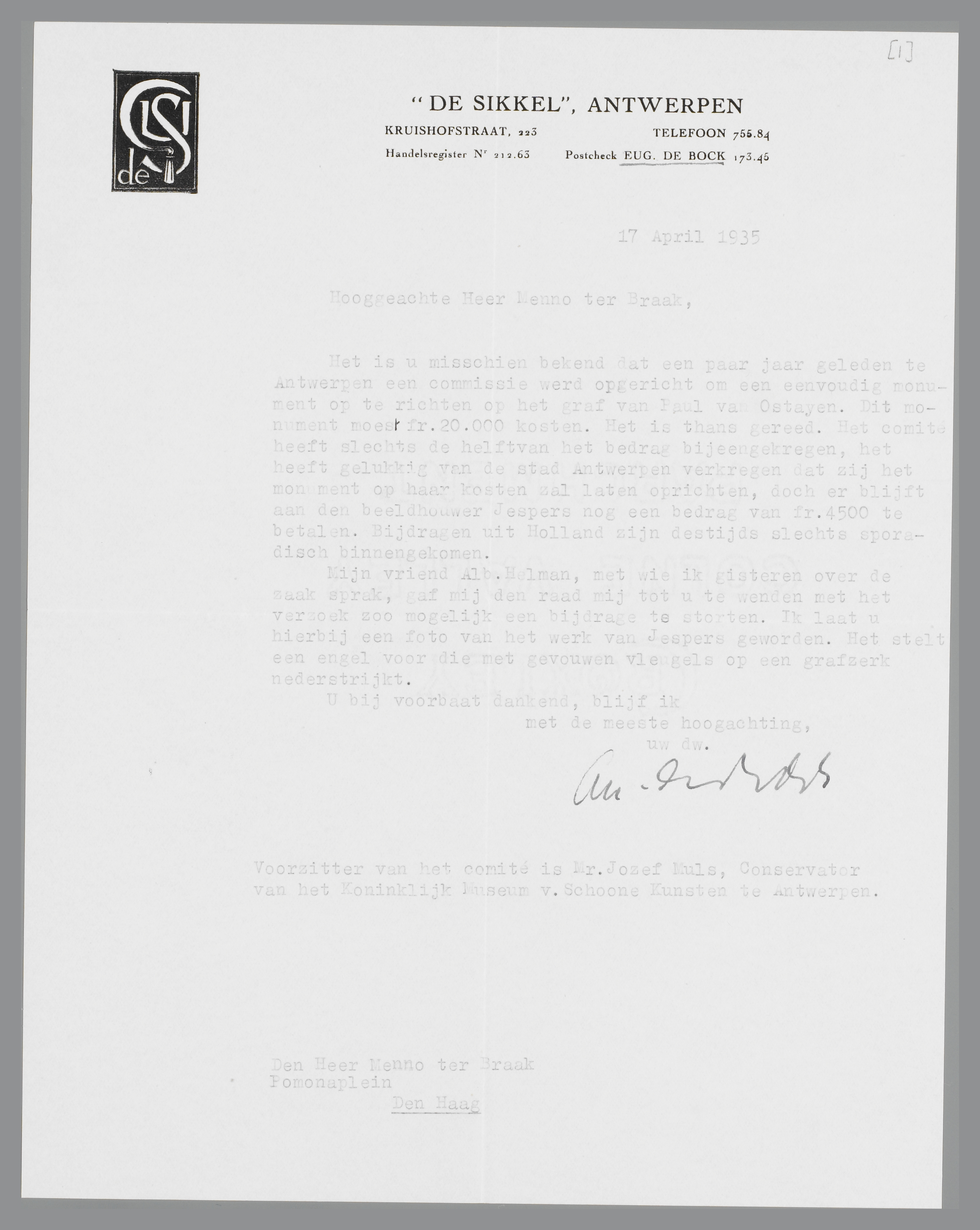 Het is u misschien bekend dat een paar jaar geleden te Antwerpen een commissie werd opgericht om een eenvoudig monument op te richten op het graf van Paul van Ostayen. Dit monument moest fr.20.000 kosten. Het is thans gereed. Het comité heeft slechts de helft van het bedrag bijeengekregen, het heeft gelukkig van de stad Antwerpen verkregen dat zij het monument op haar kosten zal laten oprichten, doch er blijft aan den beeldhouwer Jespers nog een bedrag van fr.4500 te betalen. Bijdragen uit Holland zijn destijds slechts sporadisch binnengekomen.