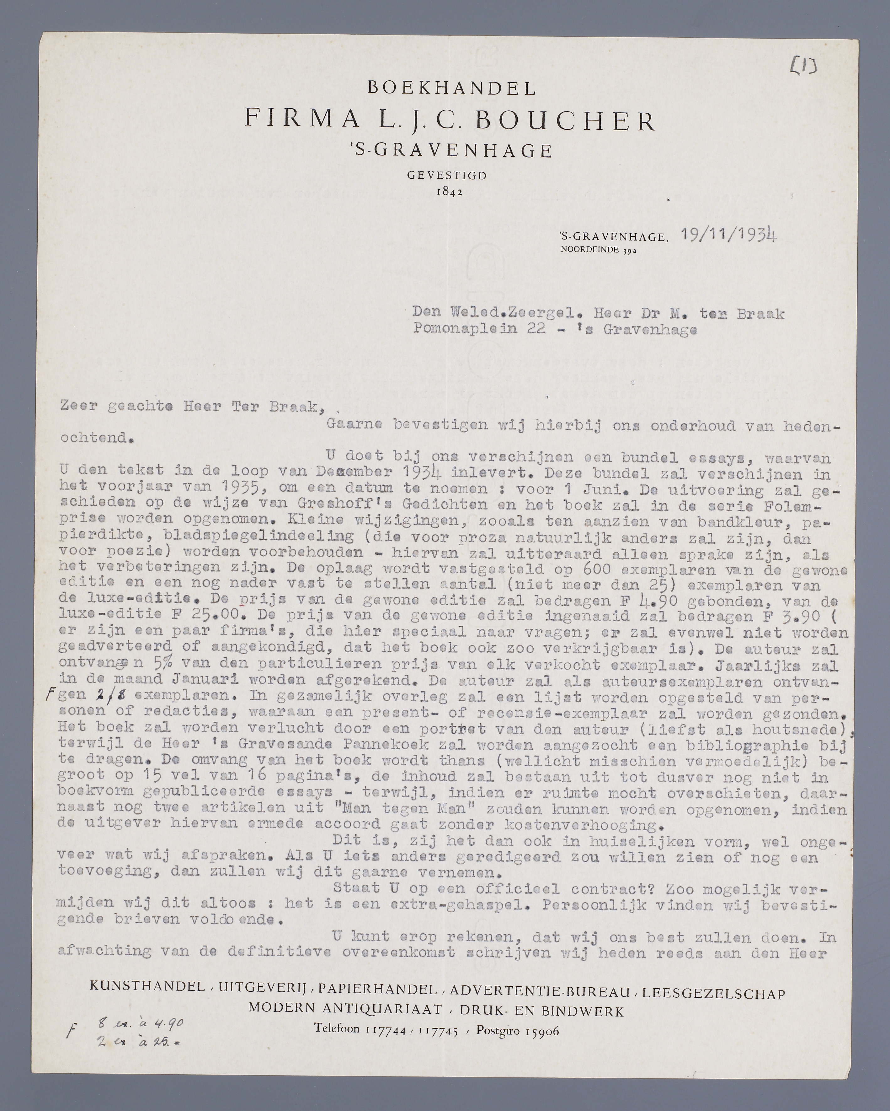 U doet bij ons verschijnen een bundel essays, waarvan U den tekst in de loop van December 1934 inlevert. Deze bundel zal verschijnen in het voorjaar van 1935, om een datum te noemen: voor 1 juni. De uitvoering zal geschieden op de wijze van Greshoff's Gedichten en het boek zal in de serie Folemprise worden opgenomen. Kleine wijzigingen, zooals ten aanzien van bandkleur, papierdikte, bladspiegelindeeling (die voor proza natuurlijk anders zal zijn, dan voor poezie) worden voorbehouden -hiervan zal uitteraard alleen sprake zijn, als het verbeteringen zijn. De oplaag wordt vastgesteld op 600 exemplaren van de gewone editie en een nog nader vast te stellen aantal (niet meer dan 25) exemplaren van de luxe-editie. De prijs van de gewone editie zal bedragen f 4.90 gebonden, van de luxe-editie f 25.00. De prijs van de gewone editie ingenaaid zal bedragen f 3.90 (er zijn een paar firma's, die hier speciaal naar vragen; er zal evenwel niet worden geadverteerd of aangekondigd, dat het boek ook zoo verkrijgbaar is). De auteur zal ontvangen 5% van den particulieren prijs van elk verkocht exemplaar. Jaarlijks zal in de maand Januari worden afgerekend. De auteur zal als auteursexemplaren ontvangen 2/8 exemplaren, 8 ex. à 4.90, 2 ex. à f 25.=. In gezamelijk overleg zal een lijst worden opgesteld van personen of redacties, waaraan een present- of recensie-exemplaar zal worden gezonden. Het boek zal worden verlucht door een portret van den auteur (liefst als houtsnede), terwijl de Heer 'sGravesande Pannekoek zal worden aangezocht een bibliographie bij te dragen. De omvang van het boek wordt thans (wellicht misschien vermoedelijk) begroot op 15 vel van 16 pagina's, de inhoud zal bestaan uit tot dusver nog niet in boekvorm gepubliceerde essays - terwijl, indien er ruimte mocht overschieten, daarnaast nog twee artikelen uit ‘Man tegen Man’ zouden kunnen worden opgenomen, indien de uitgever hiervan ermede accoord gaat zonder kostenverhoging.