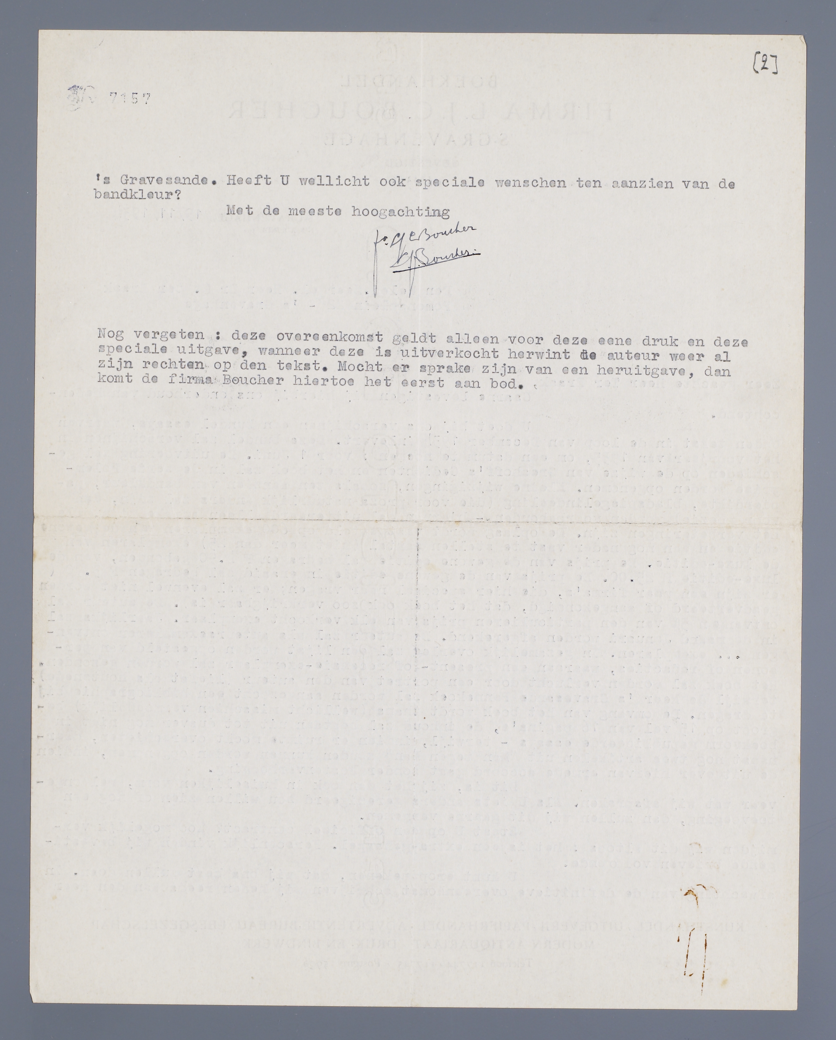 Nog vergeten: deze overeenkomst geldt alleen voor deze eene druk en deze speciale uitgave, wanneer deze is uitverkocht herwint de auteur weer al zijn rechten op den tekst. Mocht er sprake zijn van een heruitgave, dan komt de firma Boucher hiertoe het eerst aan bod.