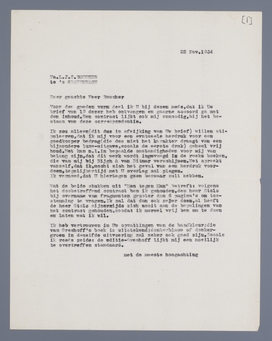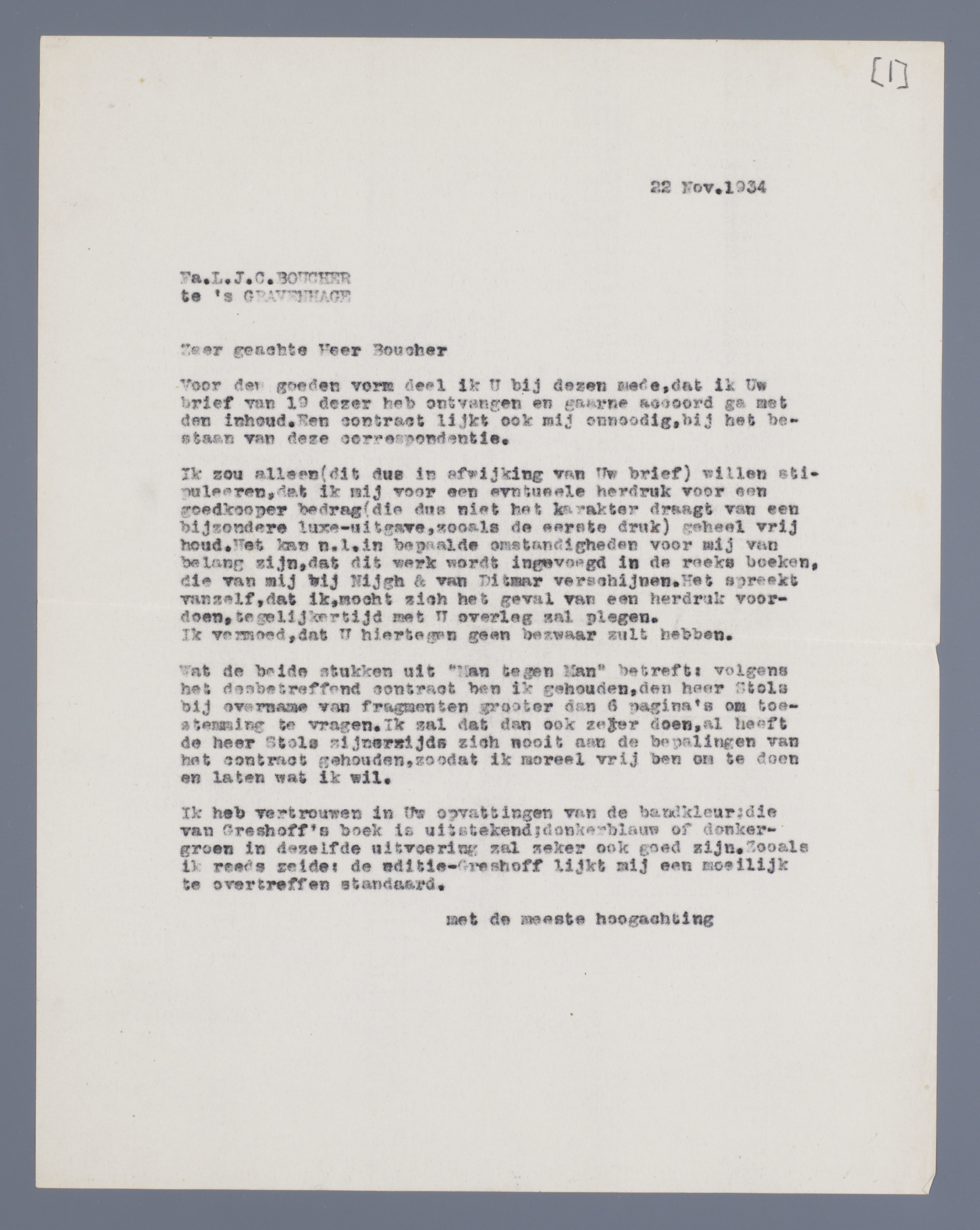 Ik zou alleen (dit dus in afwijking van uw brief) willen stipuleeren, dat ik mij voor een eventueele herdruk voor een goedkooper bedrag (die dus niet het karakter draagt van een bijzonder luxe-uitgave, zoals de eerste druk) geheel vrij houd. Het kan n.l. in bepaalde omstandigheden voor mij van belang zijn, dat dit werk wordt ingevoerd in de reeks boeken, die van mij bij Nijgh & van Ditmar verschijnen. Het spreekt vanzelf, dat ik, mocht zich het geval van een herdruk voordoen, tegelijkertijd met U overleg zal plegen.