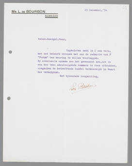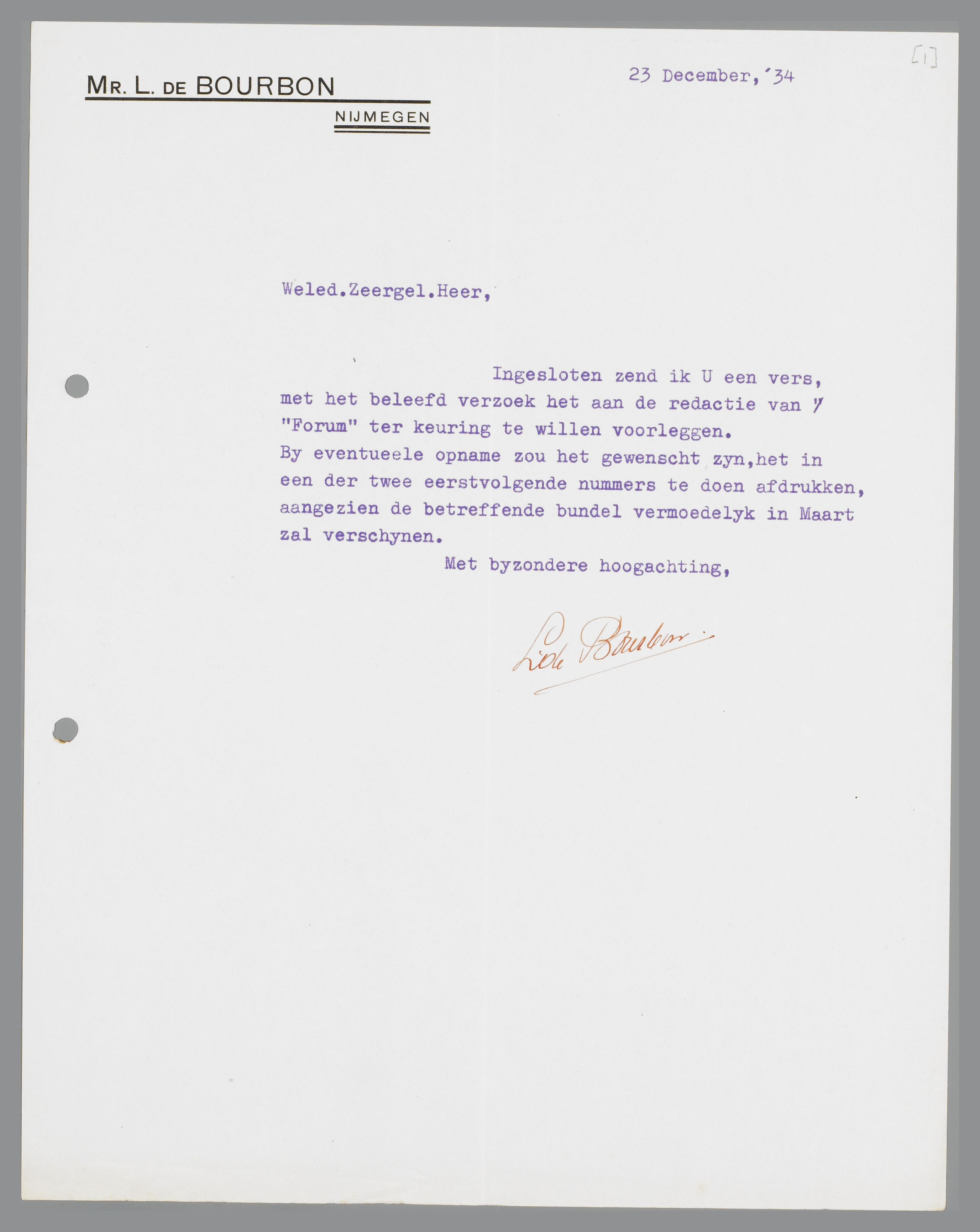 Ingesloten zend ik u een vers, met het beleefd verzoek het aan de redactie van ‘Forum’ ter keuring te willen voorleggen.