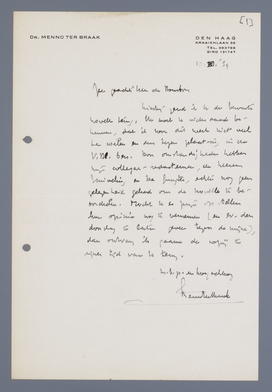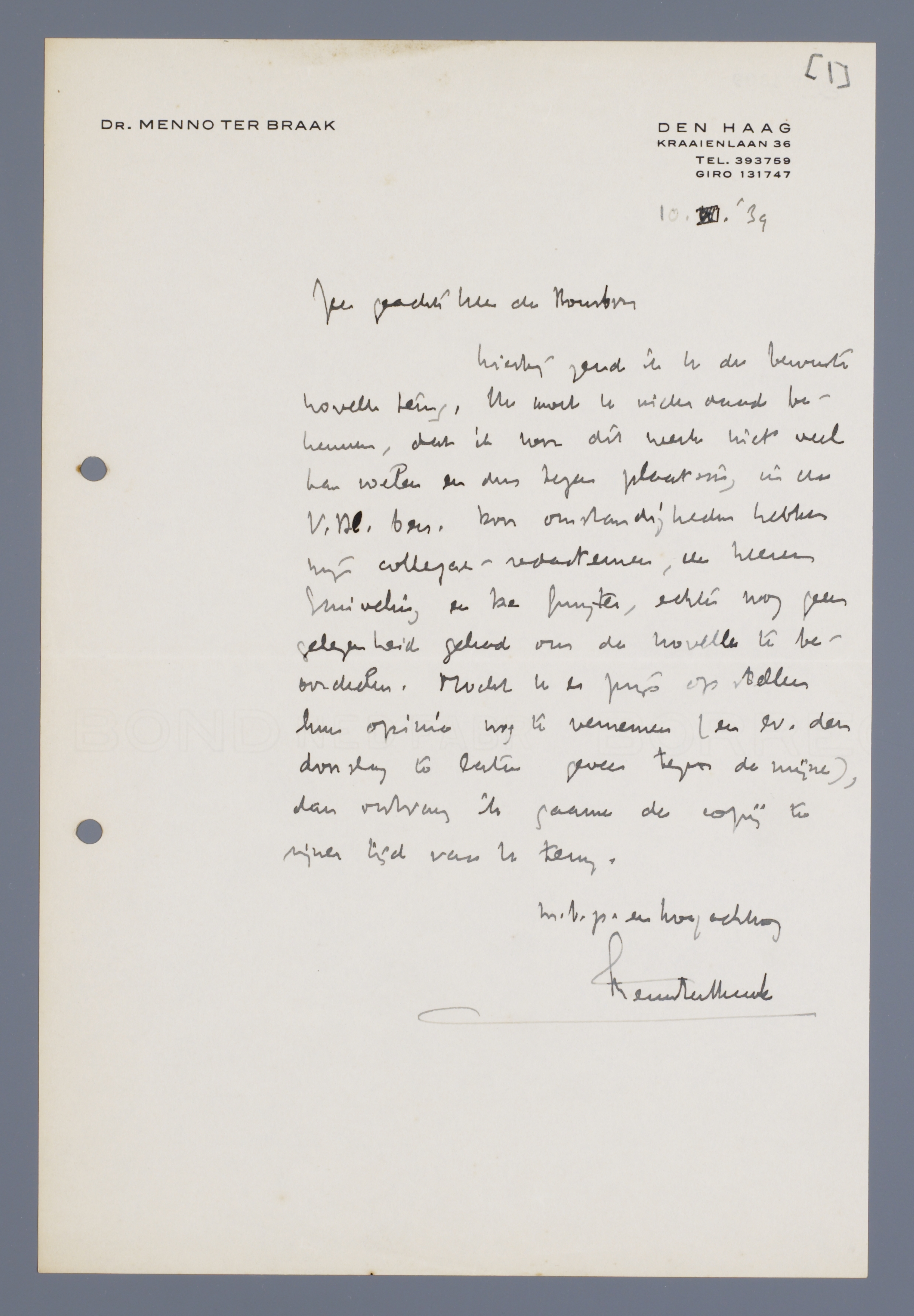 Hierbij zend ik u de bewuste novelle terug. Ik moet u inderdaad bekennen, dat ik [voor] dit werk niet veel kan [voelen] en dus tegen plaatsing in de V. Bl. ben. Door omstandigheden hebben mijn collega-redacteuren, de heeren Stuiveling en de Gruyter, echter nog geen gelegenheid gehad om de novelle te beoordeelen. Mocht u er prijs op stellen hun opinie nog te vernemen (en ev. den doorslag te laten geven tegen de mijne), dan ontvang ik gaarne de copij te zijner tijd van u terug.