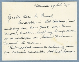 Uw artikel in ‘Het Vaderland’ naar aanleiding van ‘Vrouw Jacob’ door Ina Boudier-Bakker, noopt mij U mijn studie over de werkwijze van Mevrouw Bosboom-Toussaint te zenden.