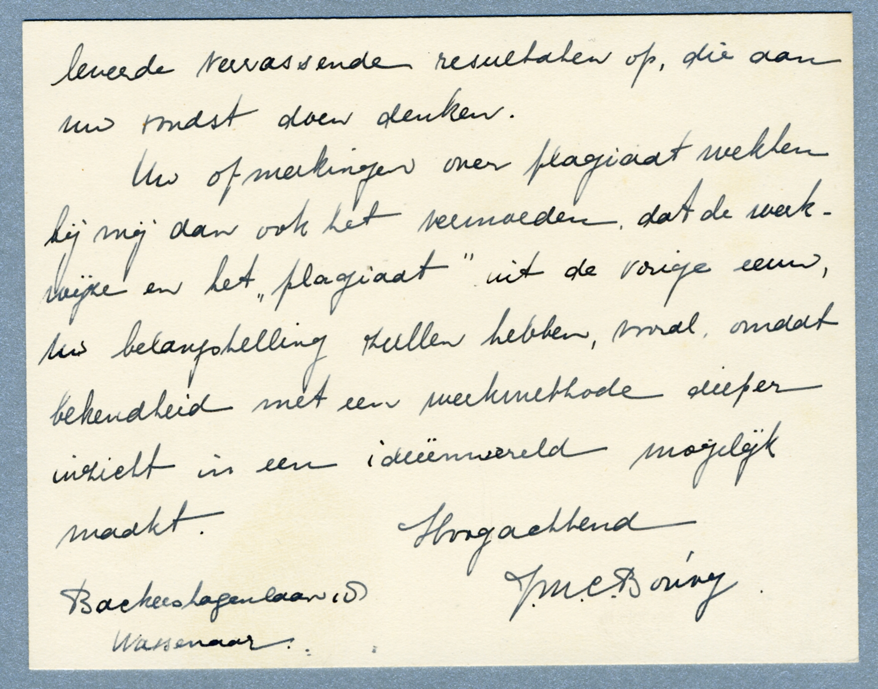 Uw opmerkingen over plagiaat wekken bij mij dan ook het vermoeden dat de werkwijze en het ‘plagiaat’ uit de vorige eeuw, uw belangstelling zullen hebben, vooral, omdat bekendheid met een werkmethode dieper inzicht in een ideeënwereld mogelijk maakt.