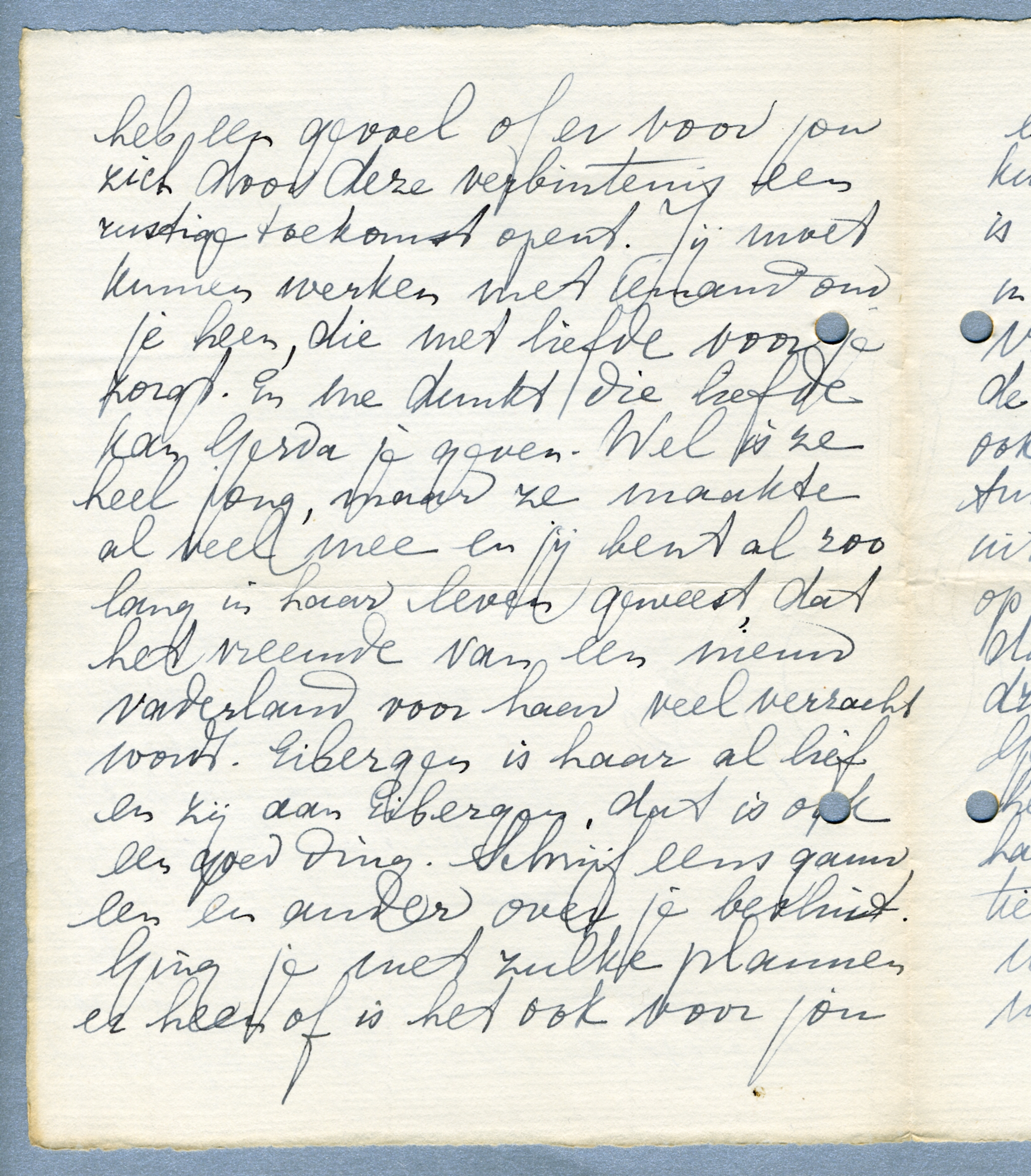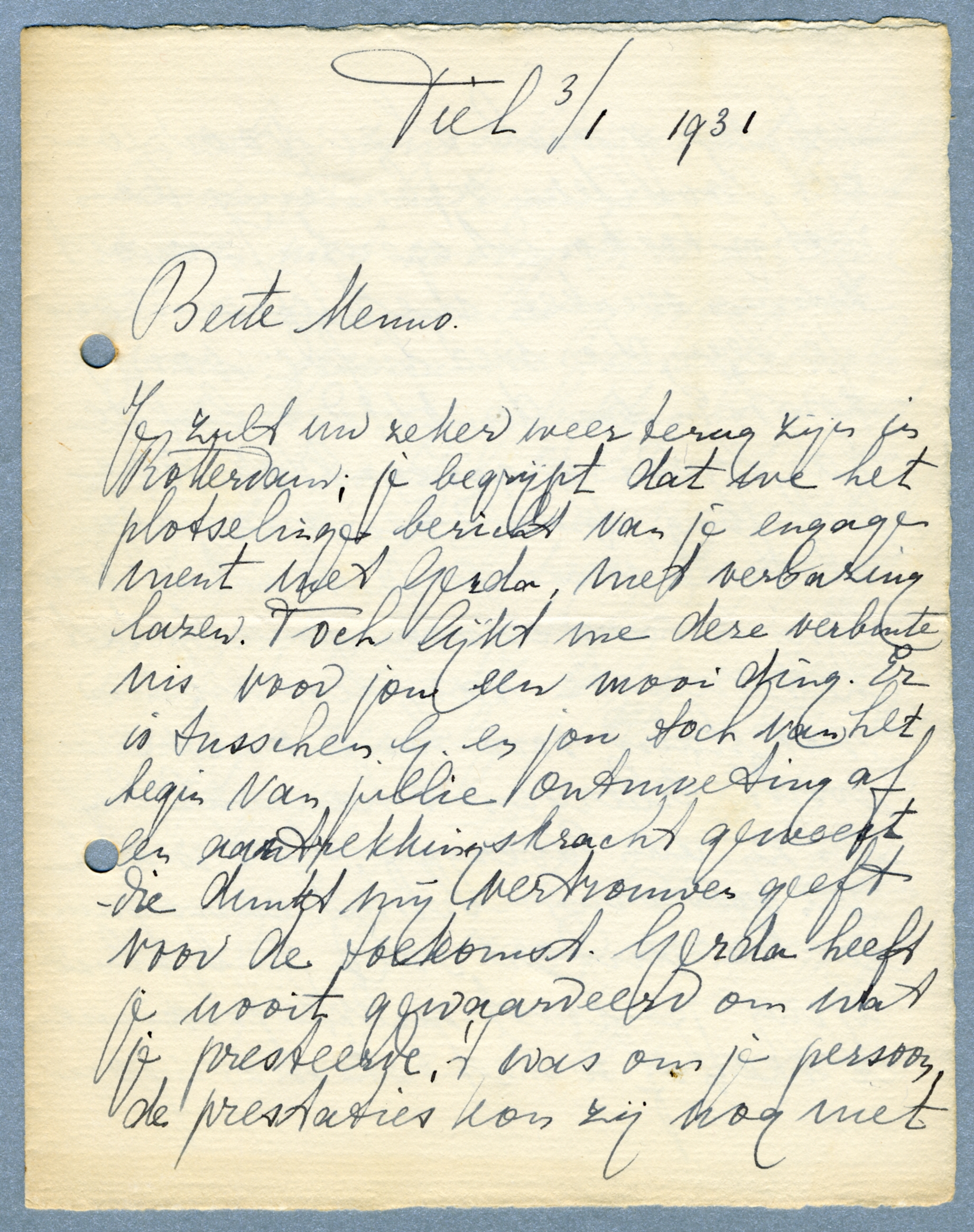 Je zult nu zeker weer terug zijn in Rotterdam; je begrijpt dat we het plotselinge bericht van je engagement met Gerda met verbazing lazen. Toch lijkt me deze verbintenis voor jou een mooi ding. Er is tusschen G. en jou toch van het begin van jullie ontmoeting af een aantrekkingskracht geweest die dunkt mij vertrouwen geeft voor de toekomst. Gerda heeft je nooit gewaardeerd om wat je presteerde, 't was om je persoon, de prestaties kon zij nog niet en zal zij misschien nooit geheel kunnen meebeleven, maar dat is ook niet noodig. Er is een deel in een mannenleven waar de vrouw geen aandeel in heeft en als de verhouding gelukkig is is dat ook niet noodig. Wel moet er natuurlijk van den man belangstelling uitgaan naar hetgeen de vrouw op haar gebied presteert. Ontbreekt dat dan wordt het vrouwenleven droog en vervelend. We hopen dat Gerda jou zal kunnen geven een heerlijk eigen thuis en dat jij haar zult geven de kleine attenties die een vrouw hooglijk waardeert en waar ze haast niet buiten kan. Ik voor mij heb een gevoel of er voor jou zich door deze verbintenis een rustige toekomst opent. Jij moet kunnen werken met iemand om je heen, die met liefde voor je zorgt. En me dunkt die liefde kan Gerda je geven. Wel is ze heel jong, maar ze maakte al veel mee en jij bent al zoo lang in haar leven geweest, dat het vreemde van een nieuw vaderland voor haar veel verzacht wordt. Eibergen is haar al lief en zij aan Eibergen, dat is ook een goed ding. Schrijf mij eens gauw een en ander over je besluit. Ging je met zulke plannen er heen of is het ook voor jou in eens tot dit besluit gekomen? Truida is de partij die zeker wel een teleurstelling zal ondervinden. Haar leven ligt echter nog open voor zoveel mogelijkheden, dat ze zich wel ergens anders in zal werken.