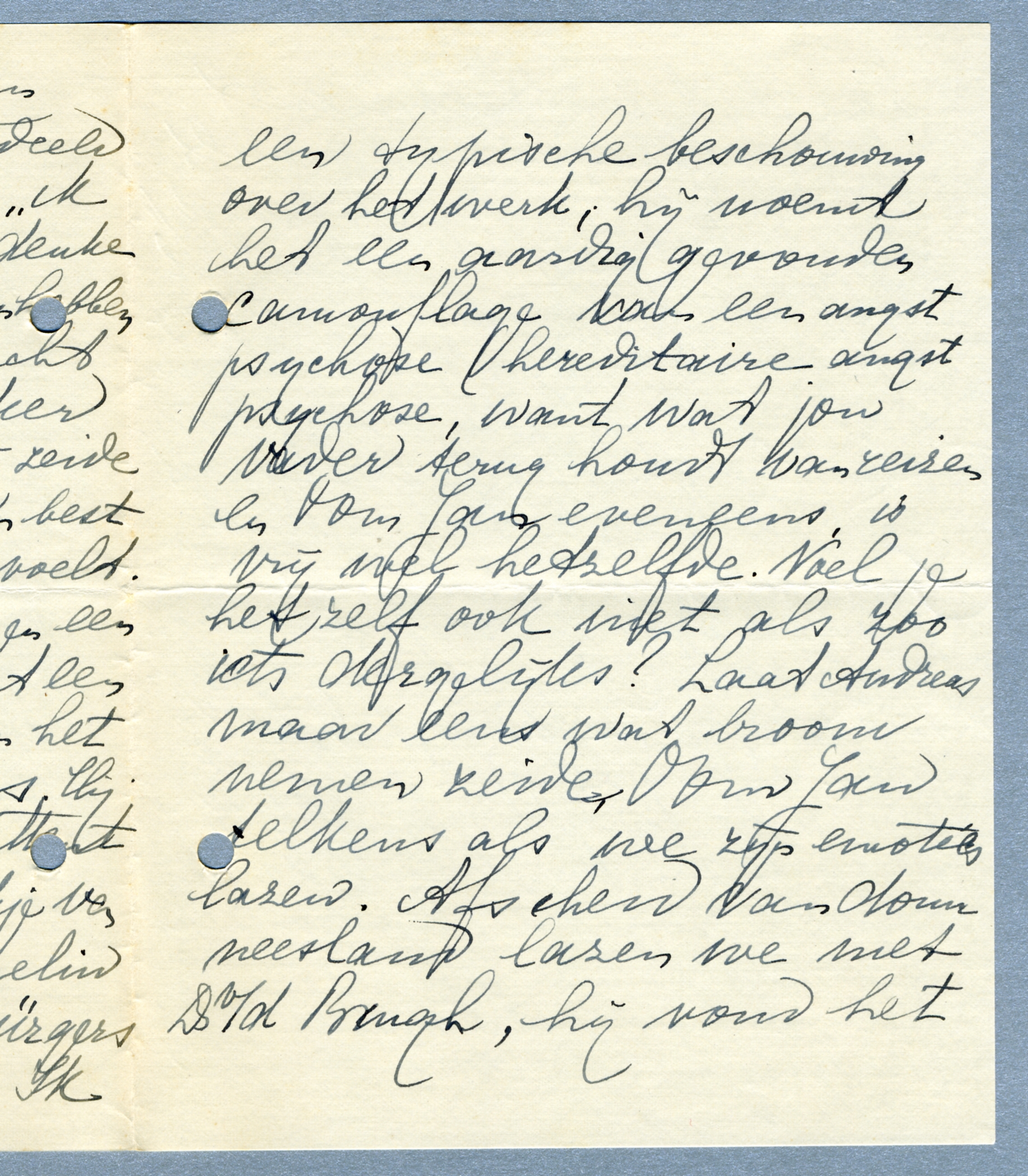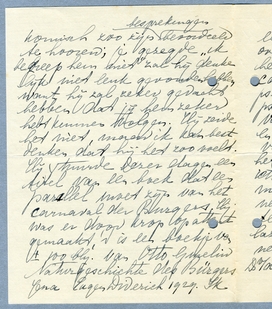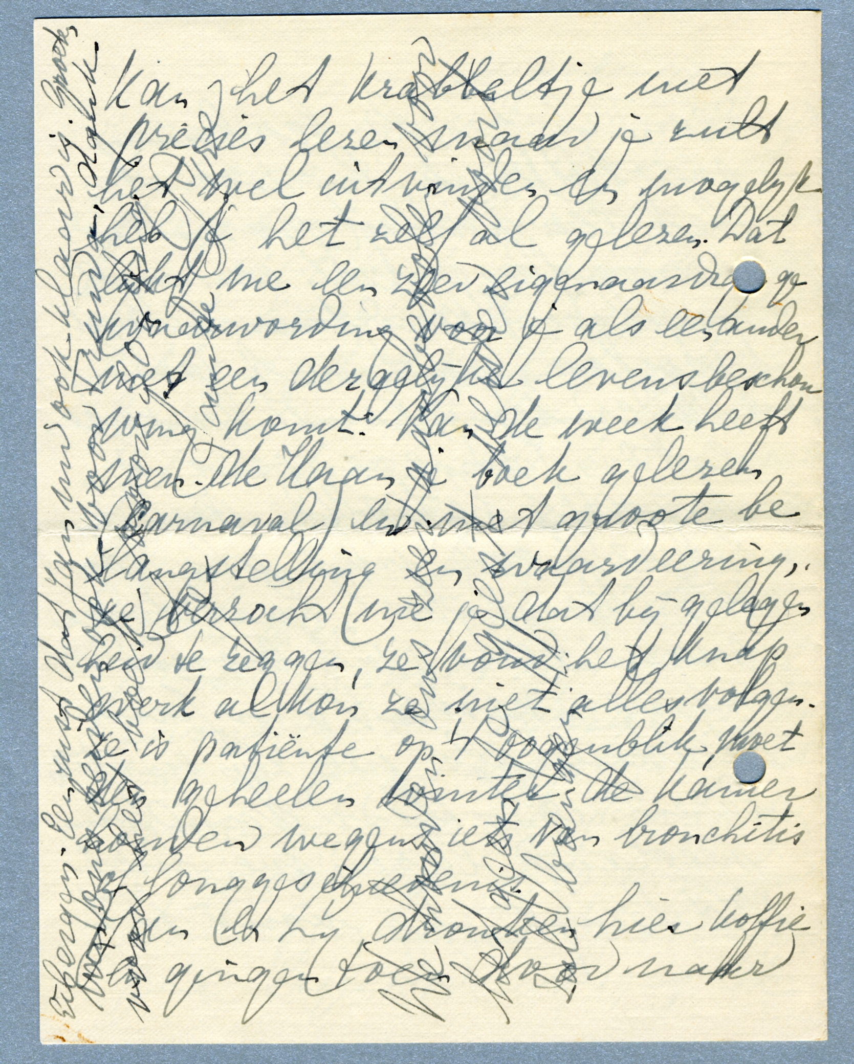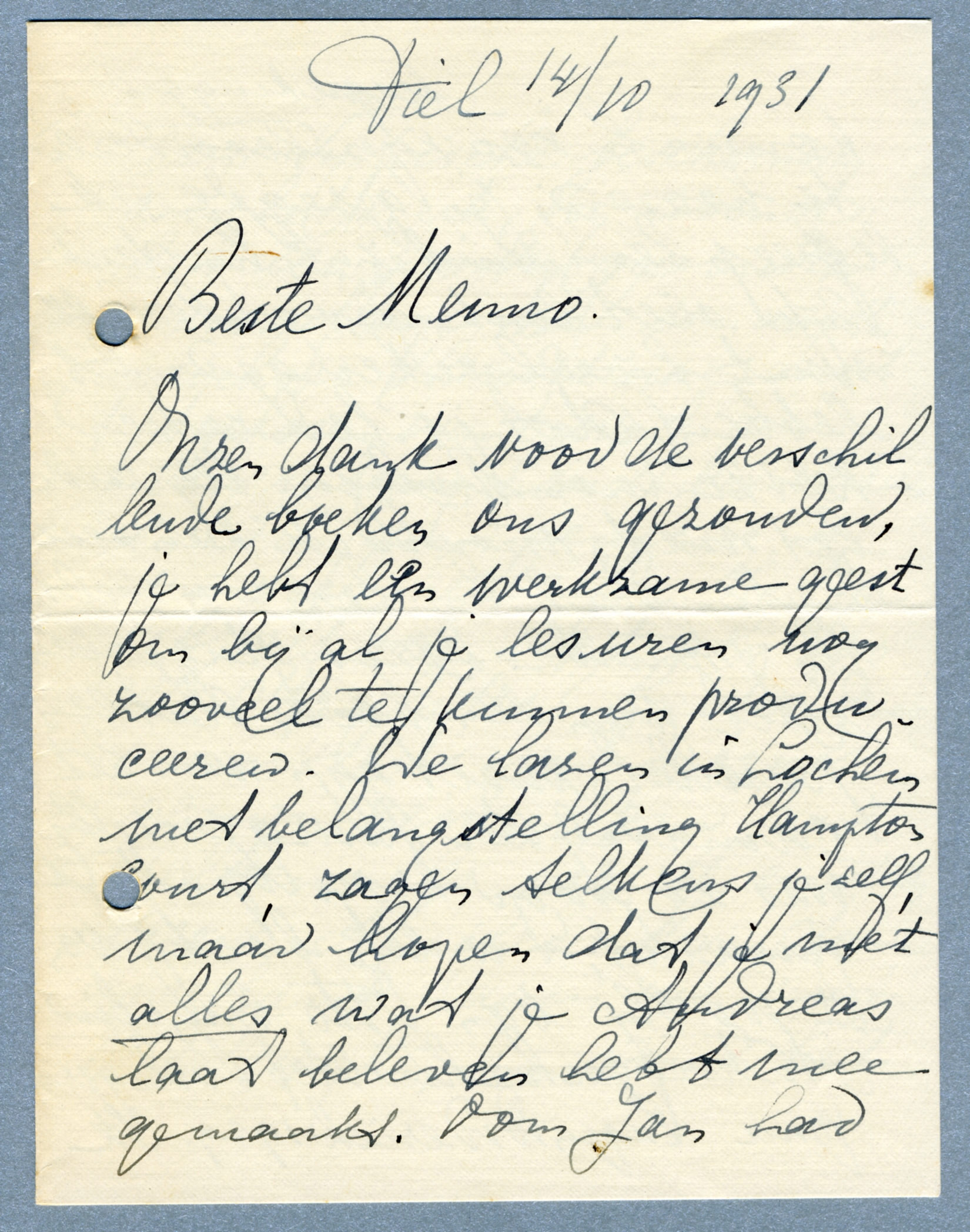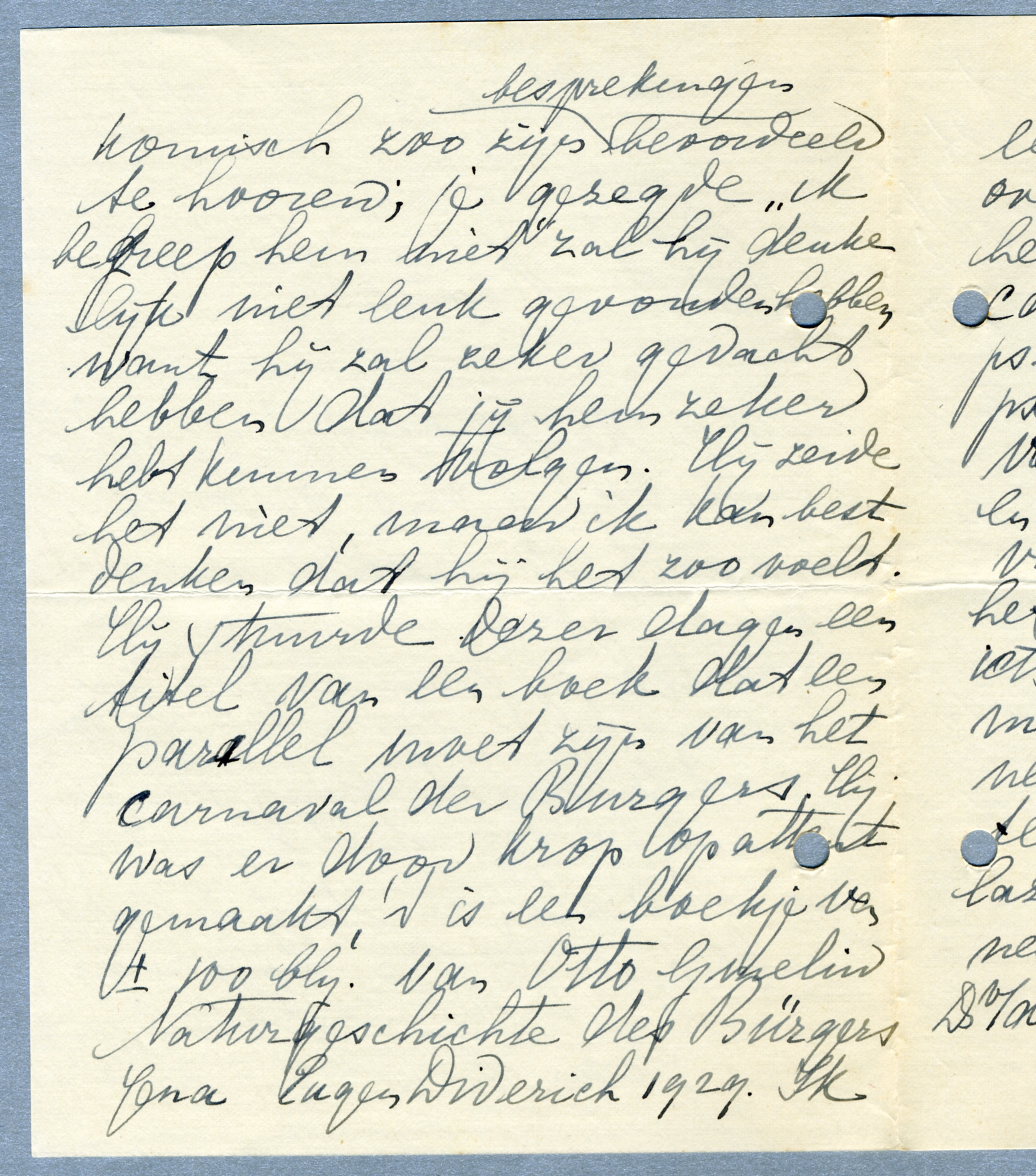 Onzen dank voor de verschillende boeken ons gezonden, je hebt een werkzame geest om bij al je lesuren nog zooveel te kunnen produceeren. We lazen in Lochem met belangstelling Hampton Court, zagen telkens jezelf, maar hopen dat je niet alles wat je Andreas laat beleven hebt meegemaakt. Oom Jan had een typische beschouwing over het werk; hij noemt het een aardig gevonden camouflage van een angst psychose (hereditaire angst psychose), want wat jou vader terug houdt van reizen en oom Jan eveneens, is vrij wel hetzelfde. Voel je het zelf ook niet als zoo iets dergelijks? Laat Andreas maar eens wat broom nemen zeide Oom Jan telkens als we zijn emoties lazen. Afscheid van domineesland lazen we met Ds v/d Brugh, hij vond het komisch zoo zijn besprekingen beoordeeld te hooren; je gezegde ‘ik begreep hem niet’ zal hij denkelijk niet leuk gevonden hebben want hij zal zeker gedacht hebben dat jij hem zeker hebt kunnen volgen. Hij zeide het niet, maar ik kan best denken dat hij het zoo voelt. Hij stuurde dezer dagen een titel van een boek dat een parallel moet zijn van het Carnaval der Burgers. Hij was er door Krop op attent gemaakt, 't is een boekje van ± 100 blz. van Otto Gmelin Naturgeschichte des Bürgers Jena Eugen Diderich 1929. Ik kan het krabbeltje niet precies lezen maar je zult het wel uitvinden en mogelijk heb je het zelf al gelezen. Dat lijkt me een zeer eigenaardige gewaarwording voor je als je een ander met een dergelijke levensbeschouwing komt. Van de week heeft mevr. De Haan je boek gelezen (Carnaval) en met groote belangstelling en waardeering, ze verzocht me je dat bij gelegenheid te zeggen, ze vond het knap werk al kon ze niet alles volgen. Ze is patiënte op 't oogenblik, moet den geheelen winter de kamer houden wegens iets van bronchitis of longgeschiedenis.