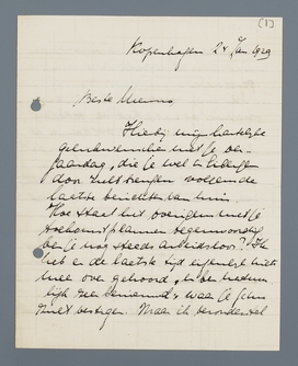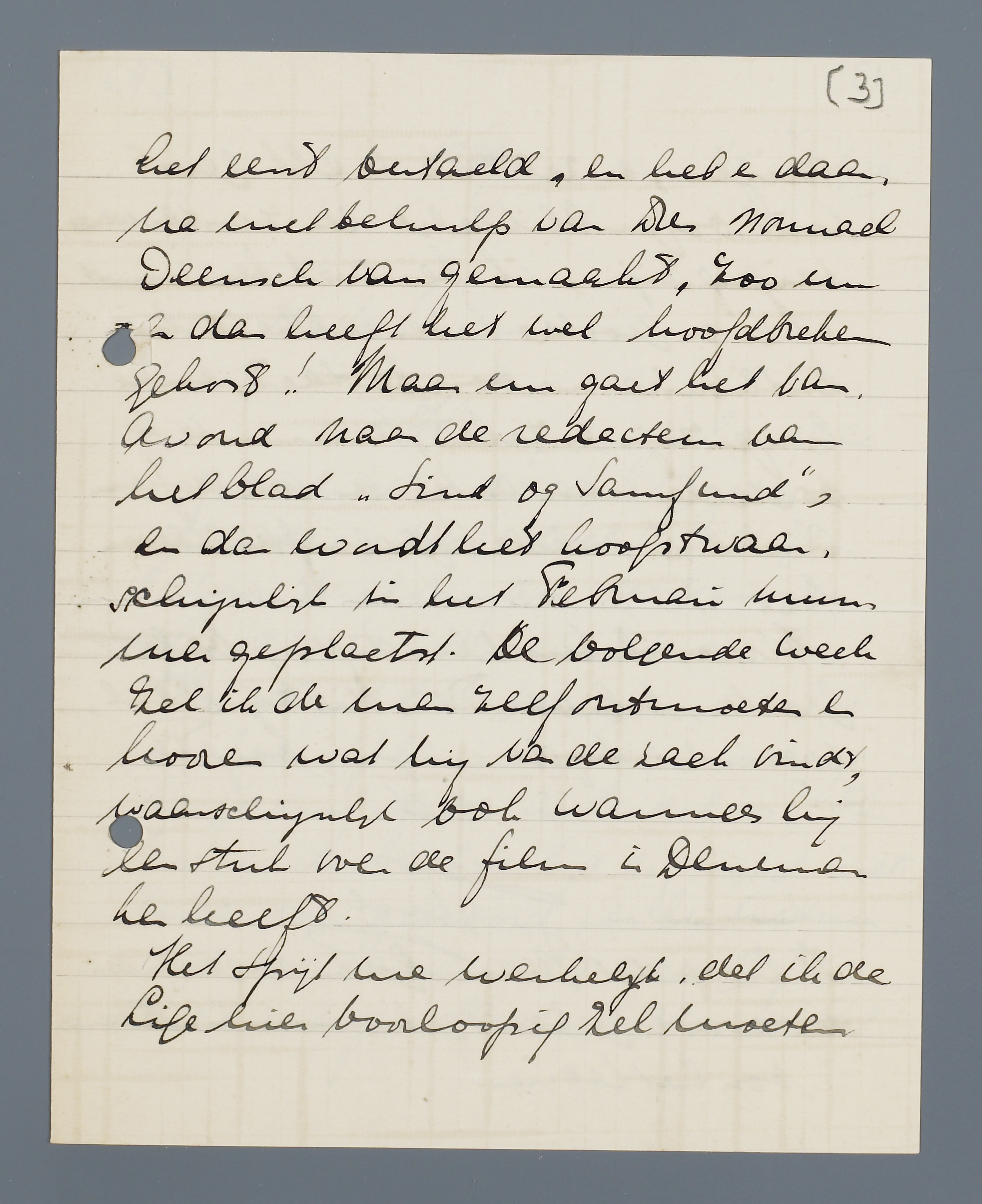 Je stuk over de Filmliga is nu zoo goed als klaar, d.w.z. ik heb het eerst vertaald, en heb er daarna met behulp van Dres normaal Deensch van gemaakt, zoo nu en dan heeft het wel hoofdbrekers gekost! Maar nu gaat het vanavond naar de redacteur van het blad ‘Sind og Samfund’, en dan wordt het hoogstwaarschijnlijk in het Februari nummer geplaatst. De volgende week zal ik de man zelf ontmoeten en hooren wat hij van de zaak vindt, waarschijnlijk ook wanneer hij een stuk over de film in Denemarken heeft.