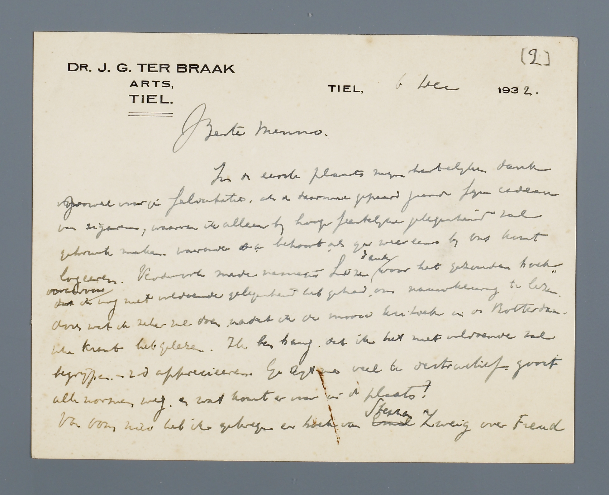 In de eerste plaats mijn hartelijken dank zoowel voor je felicitatie, als 't daarmee gepaard gaand fijn cadeau van sigaren, waarvan ik alleen bij hooge feestelijke gelegenheid zal gebruik maken waaronder o.a. behoort als ge weer eens bij ons komt logeeren. Verder ook mede namens Lize dank voor het gezonden boek waarvan ik nog niet voldoende gelegenheid heb gehad om nauwkeurig te lezen, doch wat ik zeker zal doen, nadat ik de mooie kritiek in de Rotterdamsche krant heb gelezen. Ik ben bang dat ik het niet voldoende zal begrijpen, - zal apprecieeren. Ge zijt me veel te destructief, gooit alle normen weg, en wat komt er voor in de plaats?