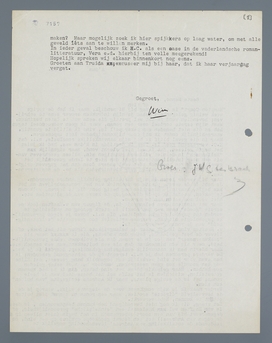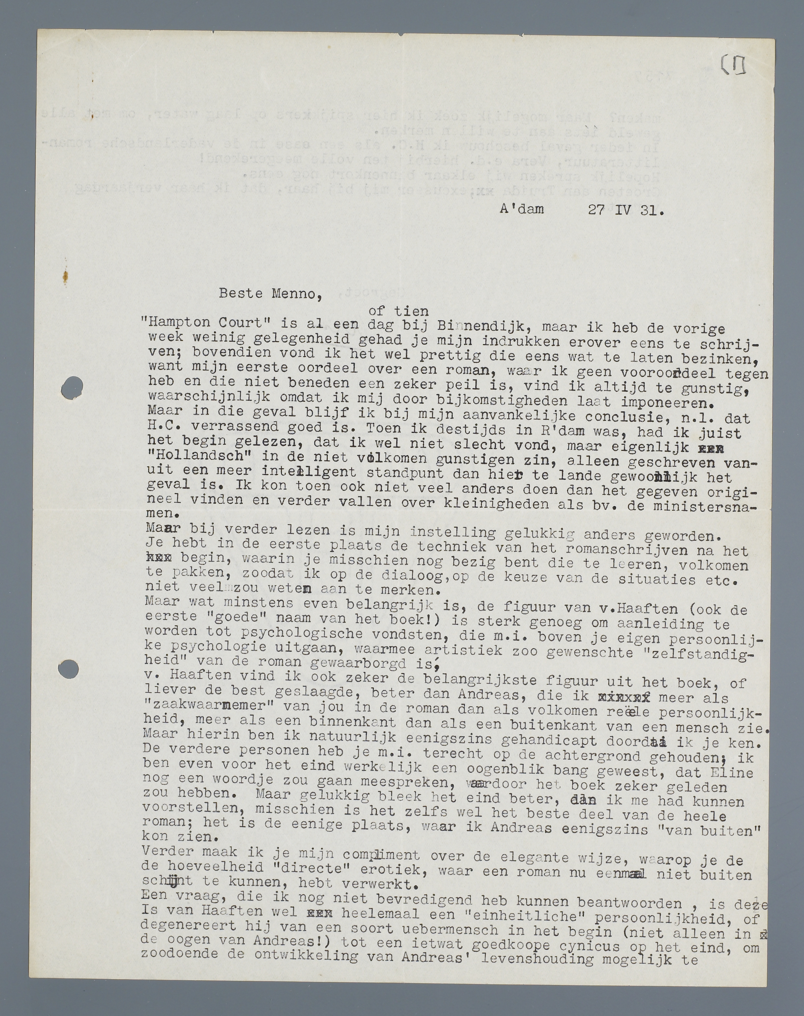 v. Haaften vind ik ook zeker de belangrijkste figuur uit het boek, of liever de best geslaagde, beter dan Andreas, die ik meer als ‘zaakwaarnemer’ van jou in de roman dan als volkomen reële persoonlijkheid, meer als de binnenkant dan als de buitenkant van een mensch zie. Maar hierin ben ik natuurlijk eenigzins gehandicapt doordat ik je ken. De verdere personen heb je m.i. terecht op de achtergrond gehouden; ik ben even voor het eind werkelijk bang geweest, dat Eline nog een woordje zou gaan meespreken, waardoor het boek zeker geleden zou hebben. Maar gelukkig bleek het eind beter, dan ik me had kunnen vorstellen, misschien is het zelfs wel het beste deel van de heele roman; het is de eenige plaats, waar ik Andreas eenigzins ‘van buiten’ kon zien.