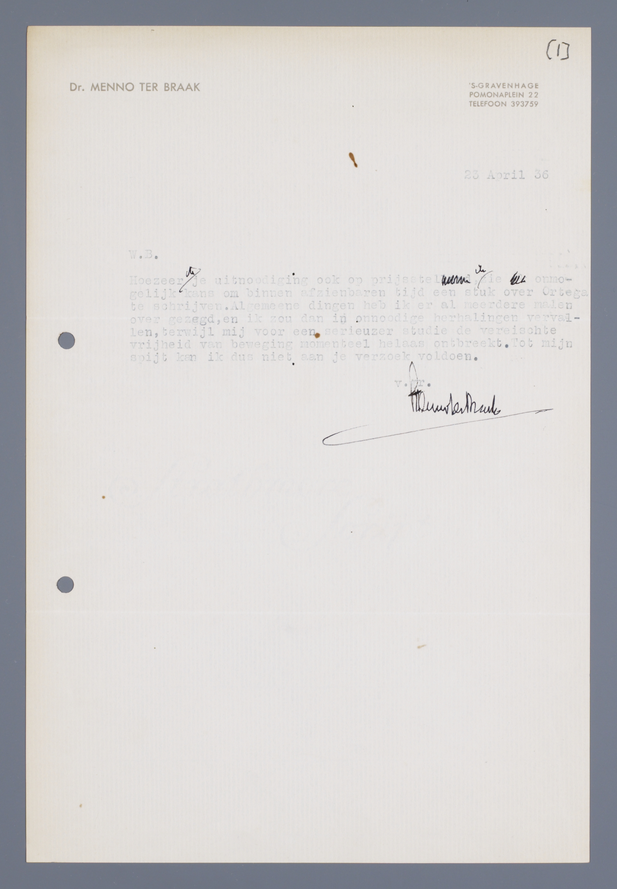 Hoezeer ik je uitnoodiging ook op prijs stel, ik zie onmogelijk kans om binnen afzienbaren tijd een stuk over Ortega te schrijven. Algemeene dingen heb ik er al meerdere malen over gezegd, en ik zou dan in onnoodige herhalingen vervallen, terwijl mij voor een serieuzer studie de vereischte vrijheid van beweging momenteel helaas ontbreekt. Tot mijn spijt kan ik dus niet aan je verzoek voldoen.