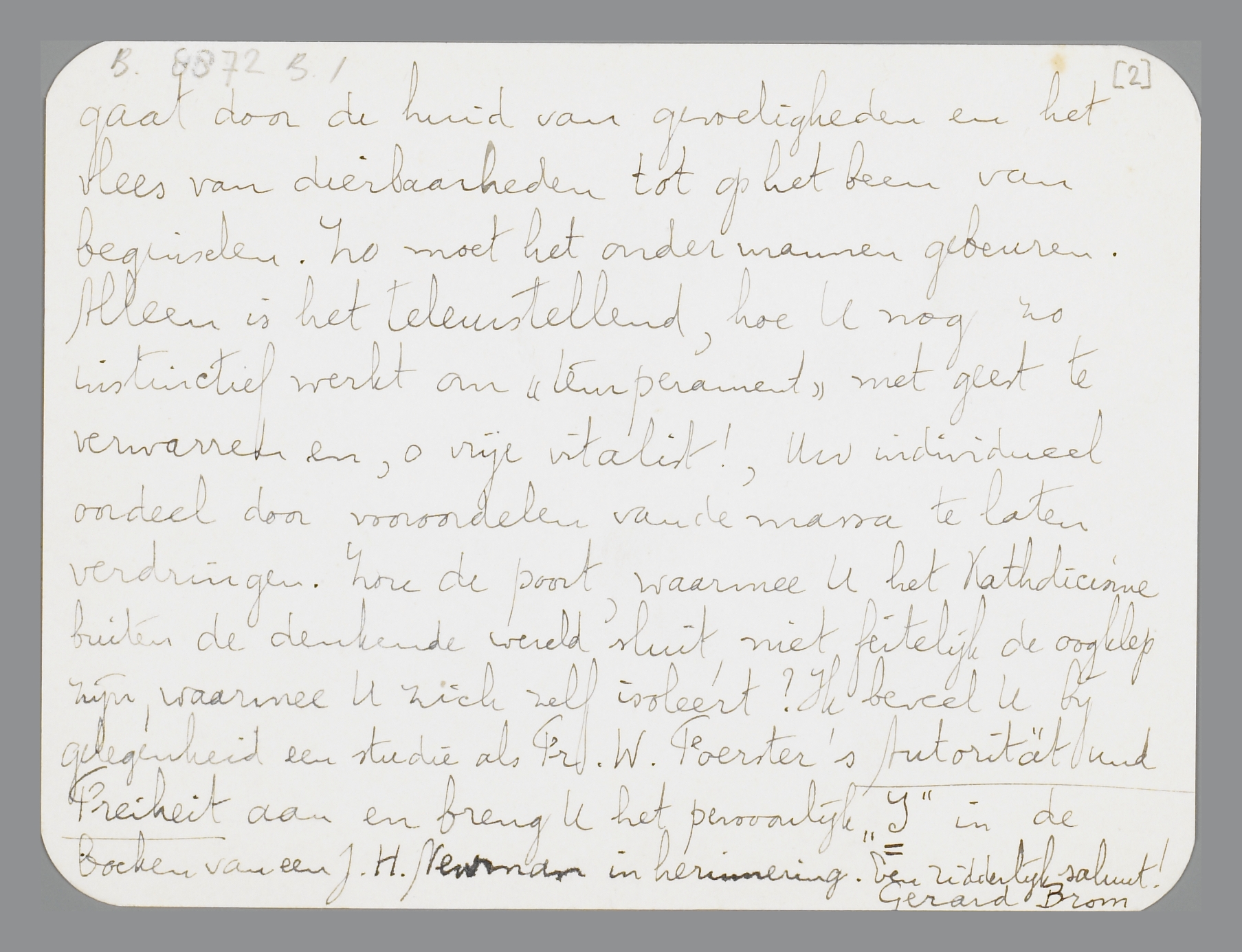 Veel dank voor de vriendelijke toezending van Uw kritiek en nog meer voor de ernstige belangstelling in mijn werk. Dat U deze gedachtenwisseling op het gehalte van Vondels en mijn Kerk toespitst lijkt me volkomen redelijk, zoals het me ook voldoening geeft dat U het intellect aan het woord laat komen. Uw zwaard gaat door de huid van gevoeligheden en het vlees van dierbaarheden tot op het been van beginselen. Zo moet het onder mannen gebeuren. Alleen is het teleurstellend, hoe U nog zo instinctief werkt om ‘temperament’ met geest te verwarren, en, o vrije vitalist!, Uw individueel oordeel door vooroordelen van de massa te laten verdringen. Zou de poort, waarmee U het Katholicisme buiten de wereld sluit, niet feitelijk de oogklep zijn waarmee u zich zelf isoleert? Ik beveel U bij gelegenheid een studie als Fr. W. Foerster's Autorität und Freiheit aan en breng U het persoonlijk ‘I’ in de boeken van J.H. Neuman in herinnering. Een ridderlijk saluut!