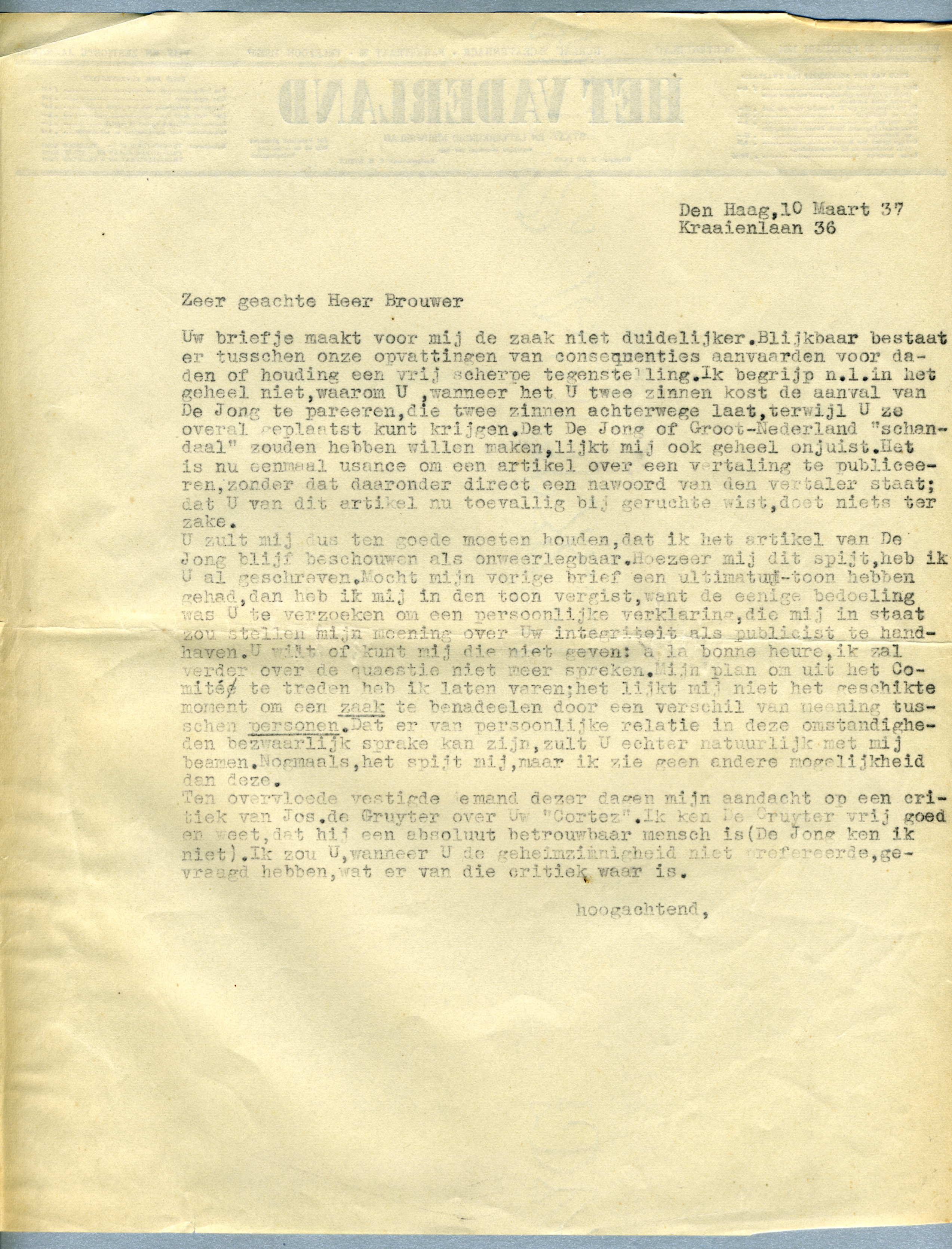 U zult mij dus ten goede moeten houden, dat ik het artikel van De Jong blijf beschouwen als onweerlegbaar. Hoezeer mij dit spijt, heb ik U al geschreven. Mocht mijn vorige brief een ultimatum-toon hebben gehad, dan heb ik mij in den toon vergist, want de eenige bedoeling was U te verzoeken om een persoonlijke verklaring, die mij in staat zou stellen mijn meening over Uw integriteit als publicist te hand-haven. U wilt of kunt mij die niet geven: a la bonne heure, ik zal verder over de quaestie niet meer spreken. Mijn plan om uit het Comité te treden heb ik laten varen; het lijkt mij niet het geschikte moment om een zaak te benadeelen door een verschil van meening tusschen personen. Dat er van persoonlijke relatie in deze omstandigheden bezwaarlijk sprake kan zijn, zult U echter natuurlijk met mij beamen. Nogmaals, het spijt mij, maar ik zie geen andere mogelijkheid dan deze.