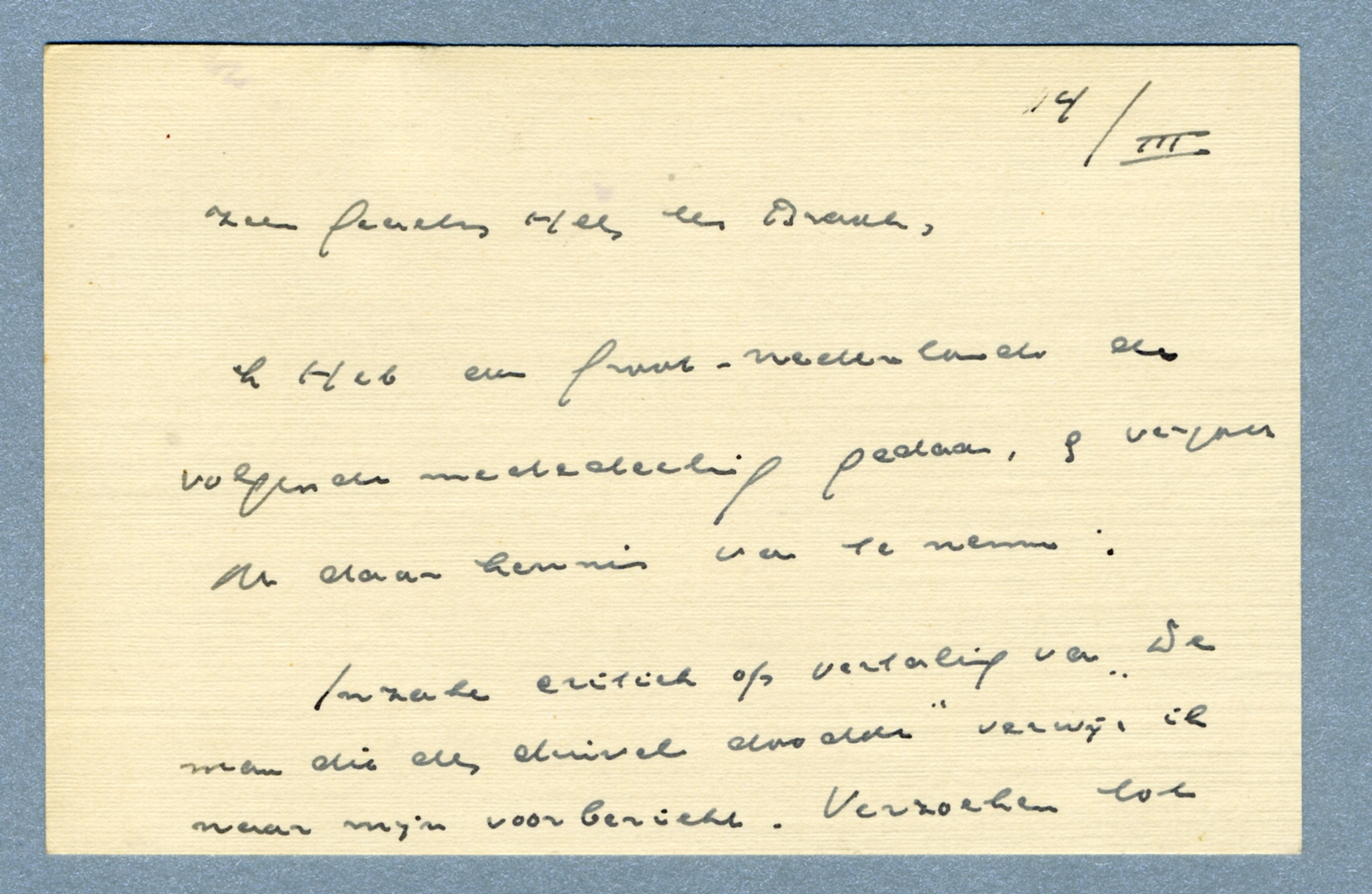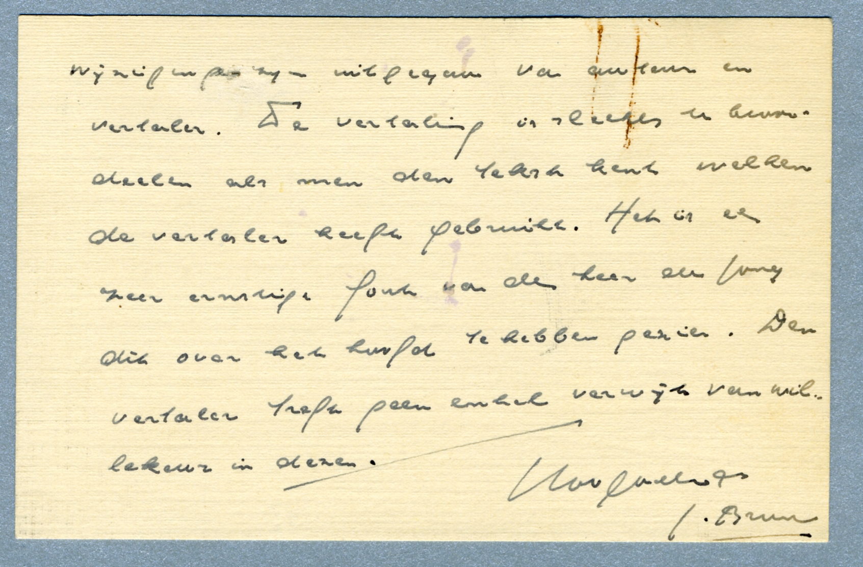 Inzake critiek op vertaling van ‘De man die den duivel doodde’ verwijs ik naar mijn voorbericht. Verzoeken tot wijzigingen zijn uitgegaan van auteur en vertaler. De vertaling is slechts te beoordeelen als men den tekst kent welken de vertaler heeft gebruikt. Het is een zeer ernstige fout van den heer de Jong dit over het hoofd te hebben gezien. Den vertaler treft geen enkel verwijt van willlekeur in dezen.
