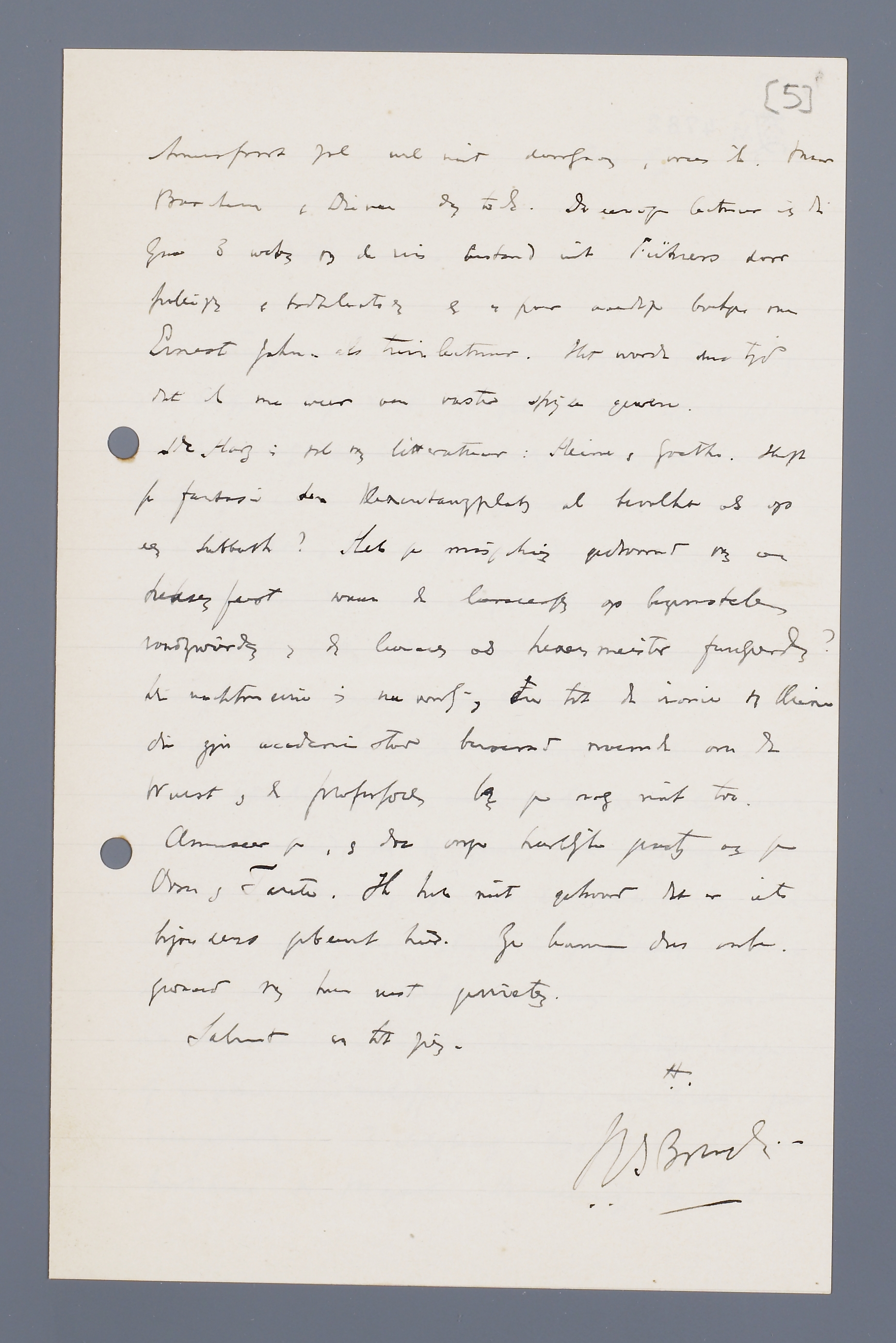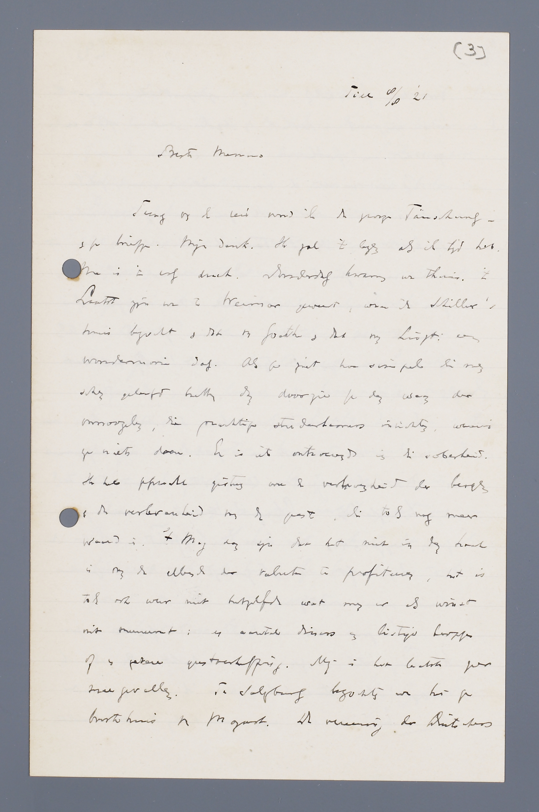 Terug van de reis vond ik de grosze Täuschung - en je briefje. Mijn dank. Ik zal 't lezen als ik tijd heb. Nu is 't erg druk. Donderdag kwamen we thuis. 't Laatst zijn we te Weimar geweest, waar ik Schiller's huis bezocht en dat van Goethe en dat van Liszt: een wondermooie dag. Als je ziet hoe simpel die menschen geleefd hebben dan doorzie je den waan der onnoozelen, die prachtige studeerkamers inrichten, waarin ze niets doen. Er is iets ontroerends in die soberheid. Ik heb geproeft gisting over de verhevenheid der bergen en de verhevenheid van de geest, die toch nog meer waard is. 't Mag dan zijn dat het niet in den haak is van de ellende der valuta te profiteeren, dat is toch ook weer niet hetzelfde wat men er als winst uit meeneemt: een aantal diners en listige koopjes of een zekere geestverheffing. Mij is het laatste zeer meegevallen. Te Salzburg bezochten we het geboortehuis van Mozart. De vereering der Duitschers voor hun Geisteshelden is mij sympathiek. In Goethe's huis hing ook een portret van Hegel, met een speciale opdracht van Goethe...