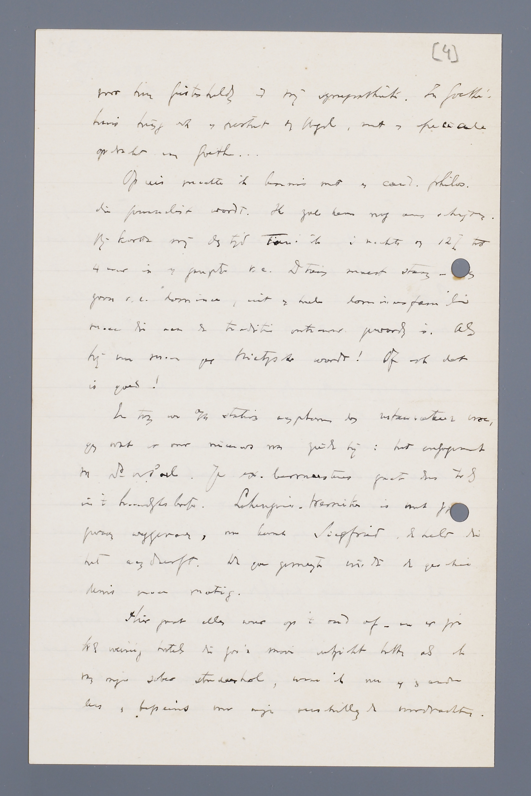 Op reis maakte ik kennis met een cand. philos. die journalist wordt. Ik zal hem nog eens schrijven. Hij kortte mij de tijd toen ik 's nachts van 12 tot 4 uur in een gangpad v.e. D trein moest staan - een zoon v.e. dominee, uit een heele domineesfamilie maar die aan de traditie ontrouw geworden is. Als hij nu maar geen Nietzsche wordt! Of ook dat is goed!