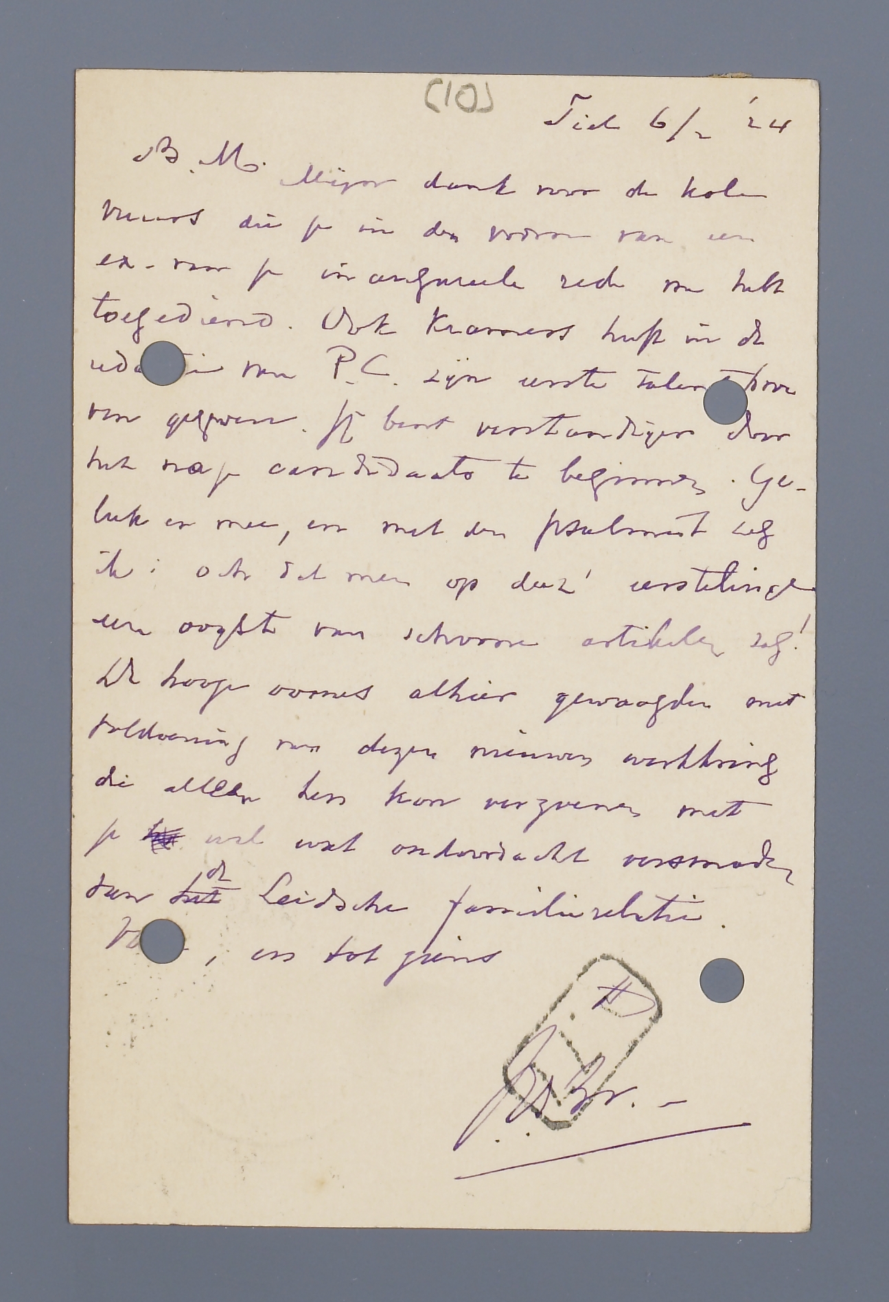 Mijn dank voor de kolen vuurs die je in den vorm van een ex. van je inaugureele rede ons hebt toegediend. Ook Kramers heeft in de redactie van P.C. zijn eerste talent daarvoor gegeven. Jij bent verstandiger door het na je candidaats te beginnen. Geluk er mee, en met den psalmist zeg ik: och dat men op deez' eerstelinge een oogst van schoone artikelen zag! De hooge oomes alhier gewaagden met voldoening van dezen nieuwen werkkring die alleen hen kon verzoenen met je wel wat ondoordacht versmaden van de Leidsche familierelatie.