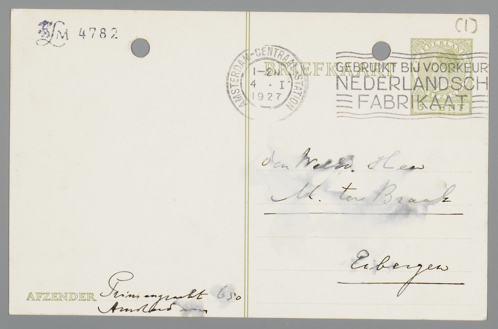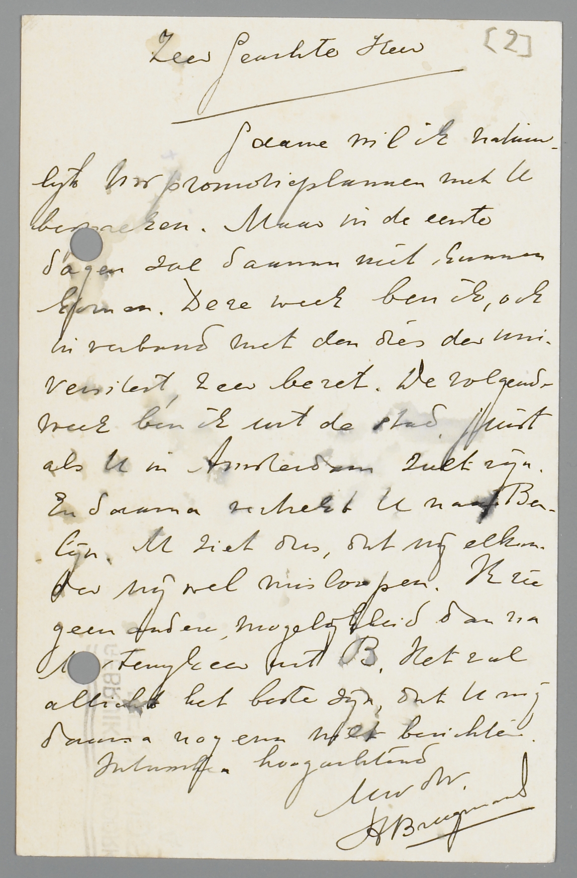Gaarne wil ik natuurlijk Uw promotieplannen met U bespreken. Maar in de eerste dagen zal daarvan niet kunnen komen. Deze week ben ik, ook in verband met den dies der universiteit, zeer bezet. De volgende week ben ik uit de stad, juist als U in Amsterdam zult zijn. En daarna vertrekt U naar Berlijn. U ziet dus, dat wij elkaar dan[?] vrij wel [?] misloopen. Ik zie geen andere mogelijkheid dan na Uw terugkeer uit B. Het zal allicht het beste zijn, dat U mij daarvan nog even wilt berichten.