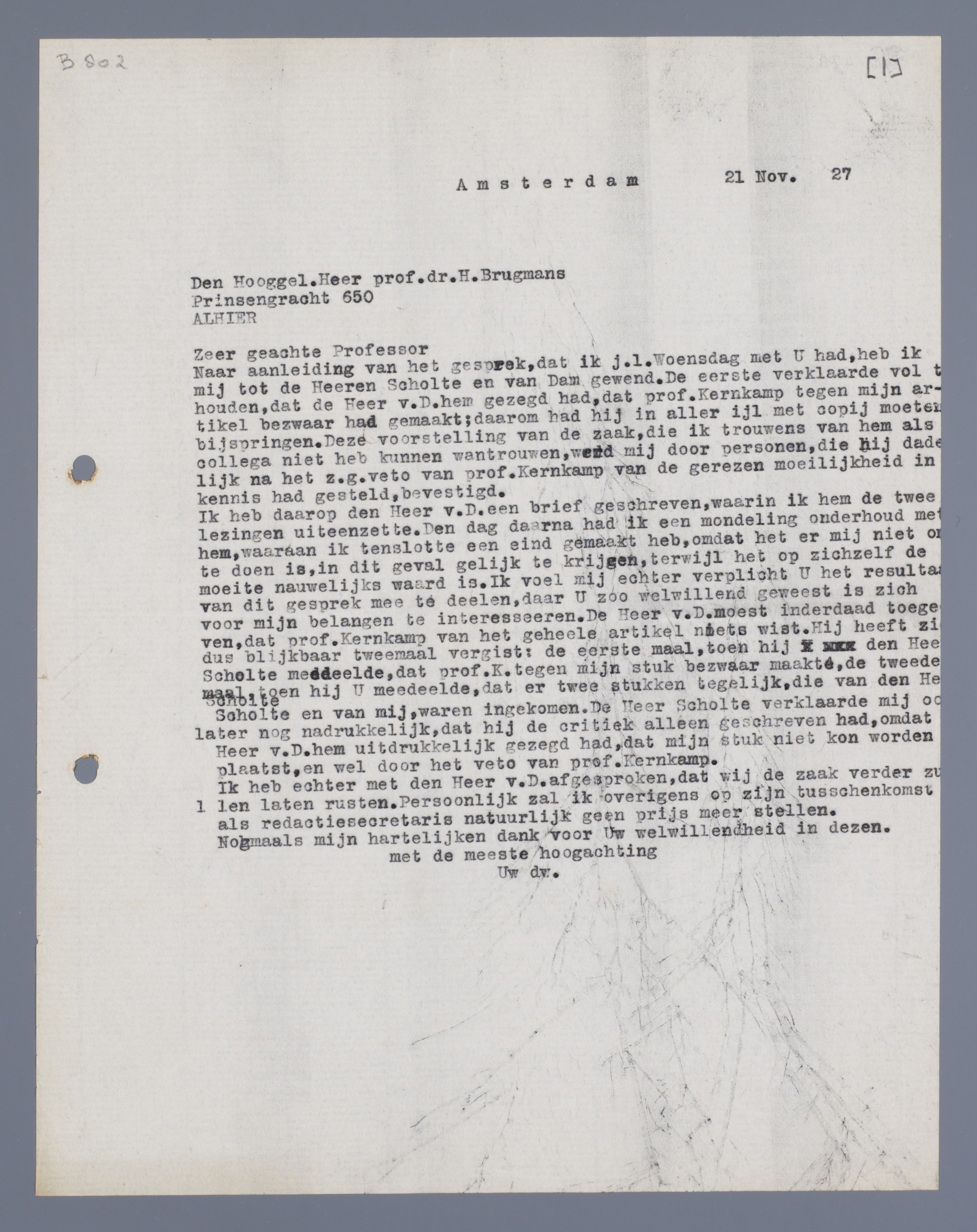 Naar aanleiding van het gesprek, dat ik j.l. Woensdag met U had, heb ik mij tot de Heeren Scholte en van Dam gewend. De eerste verklaarde vol te houden, dat de Heer v.D. hem gezegd had, dat prof. Kernkamp tegen mijn artikel bezwaar had gemaakt; daarom had hij in aller ijl met copij moeten bijspringen. Deze voorstelling van de zaak, die ik trouwens van hem als collega niet heb kunnen wantrouwen, werd mij door personen, die hij dadelijk na het z.g. veto van prof. Kernkamp van de gerezen moeilijkheid in kennis had gesteld, bevestigd.
