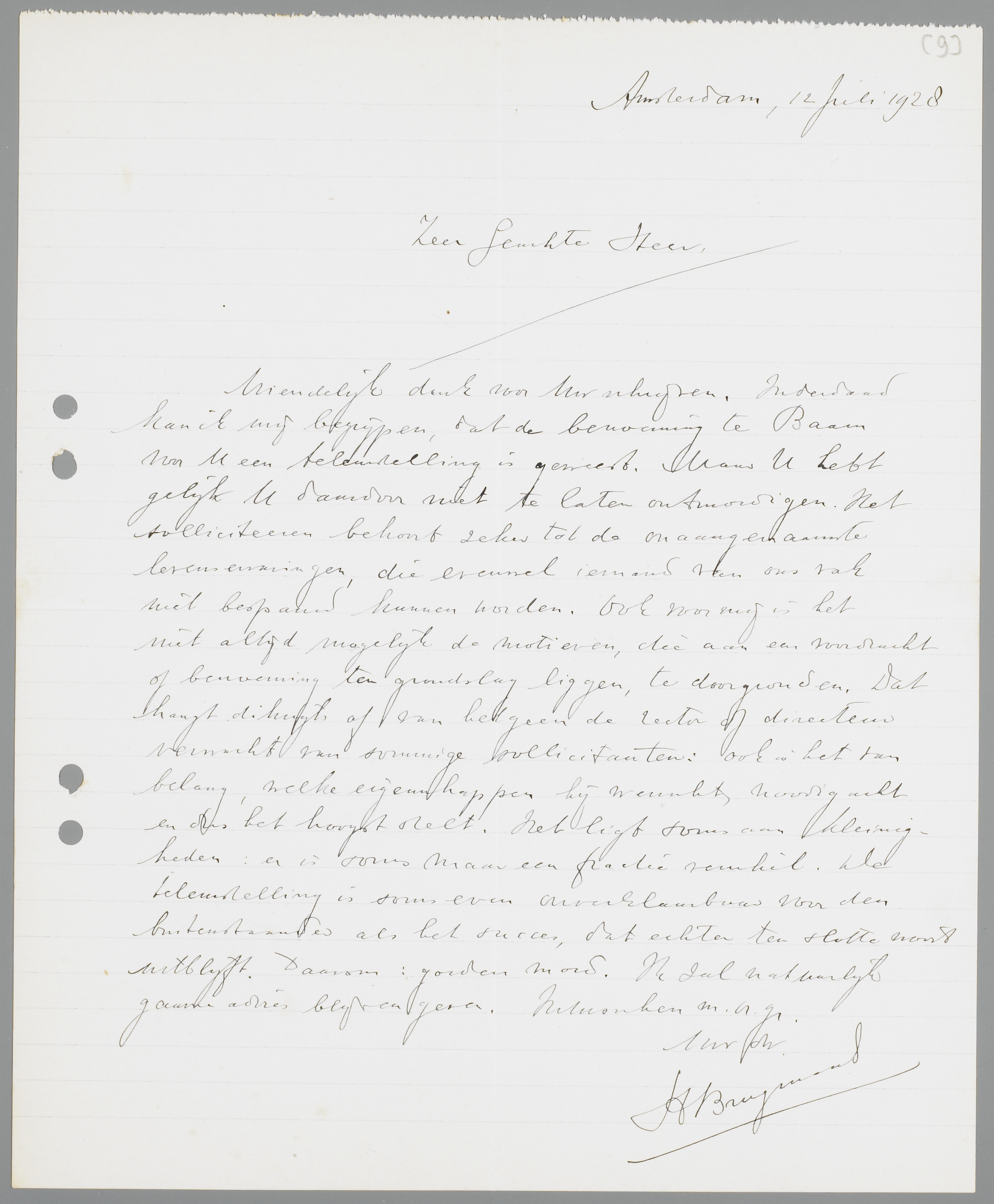 Vriendelijk dank voor Uw schrijven. Inderdaad kan ik mij begrijpen, dat de benoeming te Baarn voor U een teleurstelling is geweest. Maar U hebt gelijk U daardoor niet te laten ontmoedigen. Het solliciteeren behoort zeker tot de onaangenaamste levenservaringen, die evenwel iemand van ons vak niet bespaard kunnen worden. Ook voor mij is het niet altijd mogelijk de motieven, die aan een voordracht of benoeming ten grondslag liggen, te doorgronden. Dat hangt dikwijls af van hetgeen de rector of directeur verwacht van sommige sollicitanten: ook is het van belang, welke eigenschappen hij wenscht, noodig acht en dus het hoogst stelt. Het ligt soms aan kleinigheden: er is soms maar een fractie verschil. De teleurstelling is soms even onverklaarbaar voor den buitenstaander als het succes, dat echter ten slotte nooit uitblijft. Daarom: goeden moed. Ik zal natuurlijk gaarne advies blijven geven.