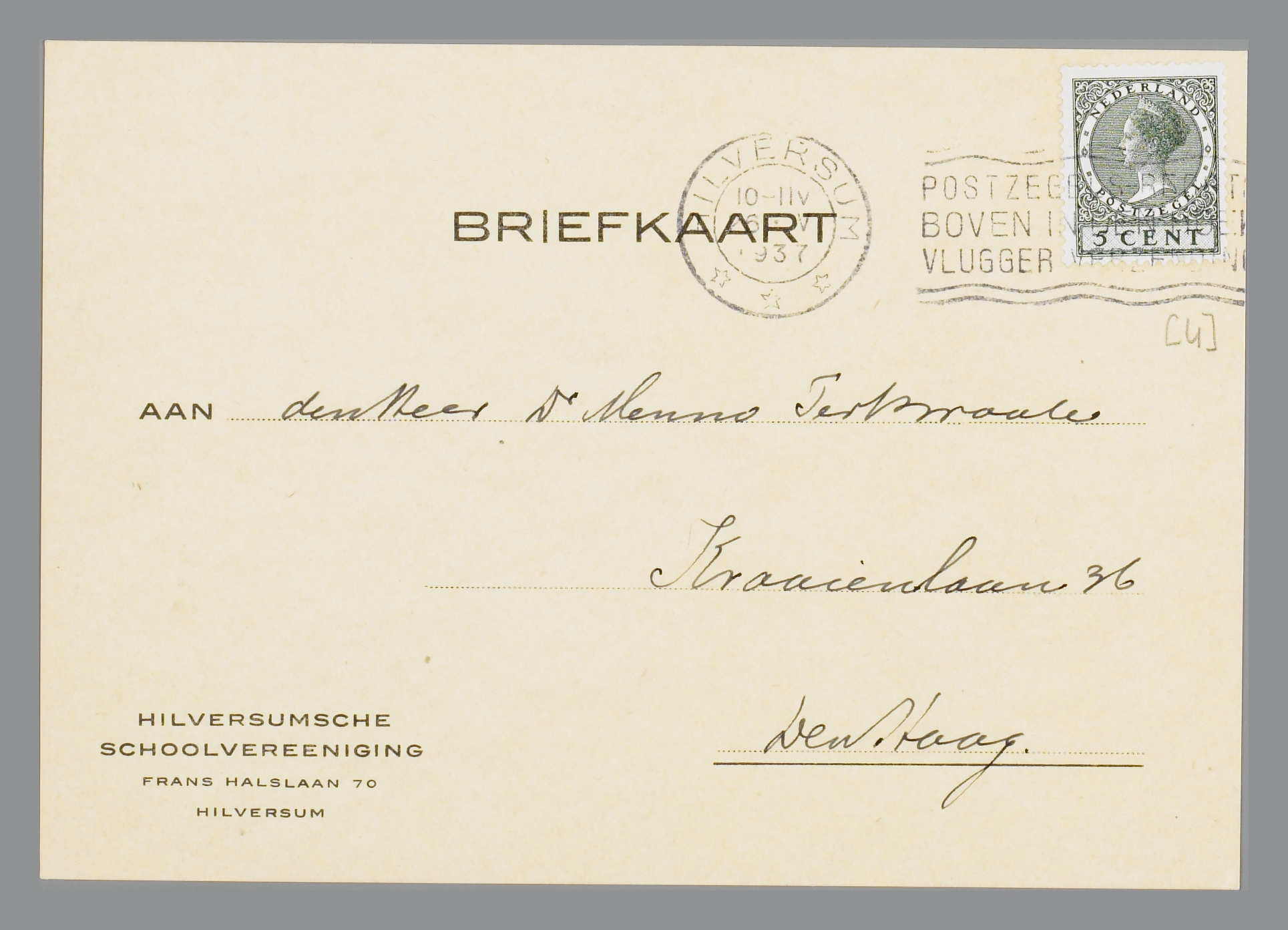 Daar ben ik nog eens. Ik bedenk daar, dat er bij m'n aantekeeningen een onjuiste mededeling van den hr. v/d Hoeven niet doorgehaald is. Dit betreft het Museum Boymans. Daar was dat Museum (pje?) v. v/dHoeven geen onderafdeling van. De oude mevrouw heeft deze mededeling later gecorrigeerd. Daar 't mogelijk zou kunnen zijn, dat U iets derg. overnam, schrijf ik U nog maar even.