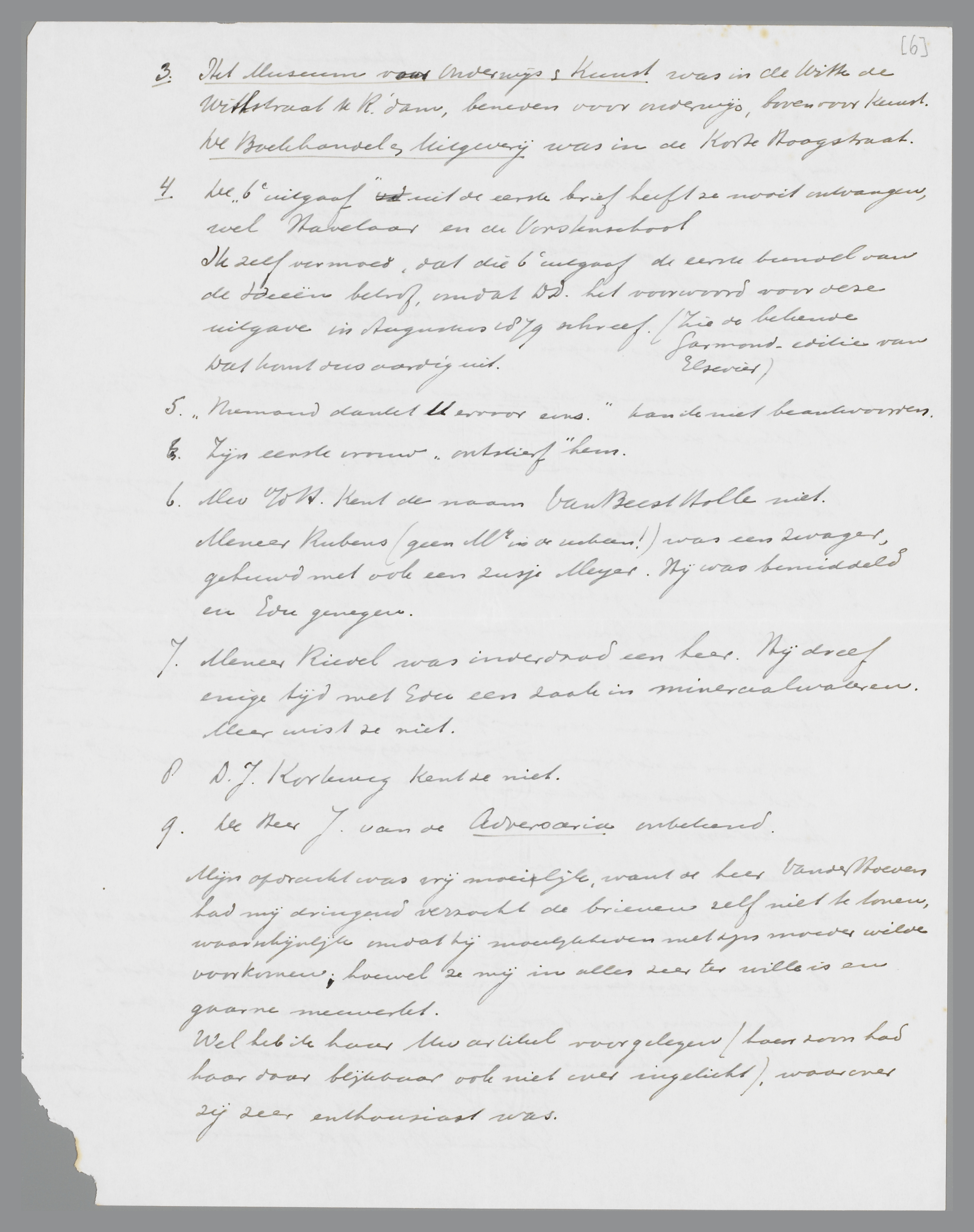| 9. | De Heer J. van de Adversaria onbekend. Mijn opdracht was vrij moeilijk, want de heer VanderHoeven had mij dringend verzocht de brieven zelf niet te tonen, waarschijnlijk omdat hij moeilijkheden met zijn moeder wilde voorkomen; hoewel ze mij in alles zeer ter wille is en gaarne meewerkt. Wel heb ik haar Uw artikel voorgelezen (haar zoon had haar daar blijkbaar ook niet over ingelicht), waarover zij zeer enthousiast was. |