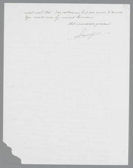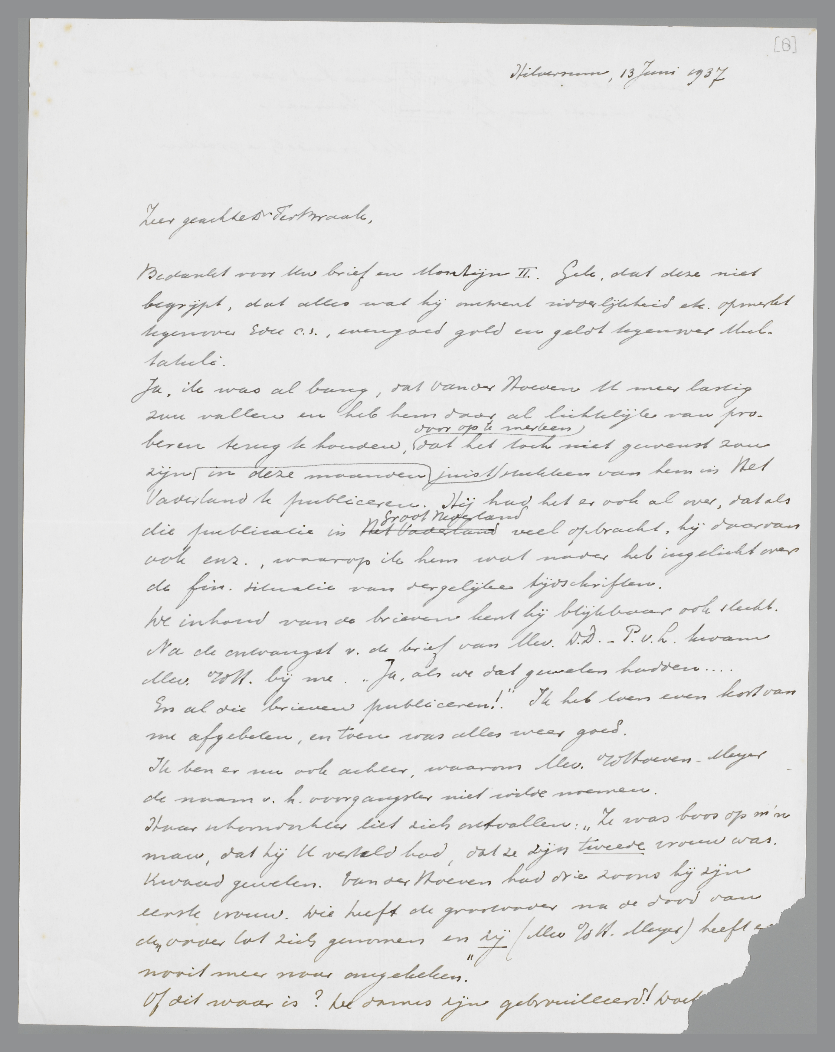 Ja, ik was al bang, dat VanderHoeven U meer lastig zou vallen en heb hem daar al lichtelijk van proberen terug te houden, door op te merken dat het toch niet gewenst zou zijn juist in deze maanden stukken van hem in Het Vaderland te publiceren. Hij had het er ook al over, dat als die publicatie in Groot Nederland veel opbracht, hij daarvan ook enz., waarop ik hem wat nader heb ingelicht over de fin. situatie van dergelijke tijdschriften.