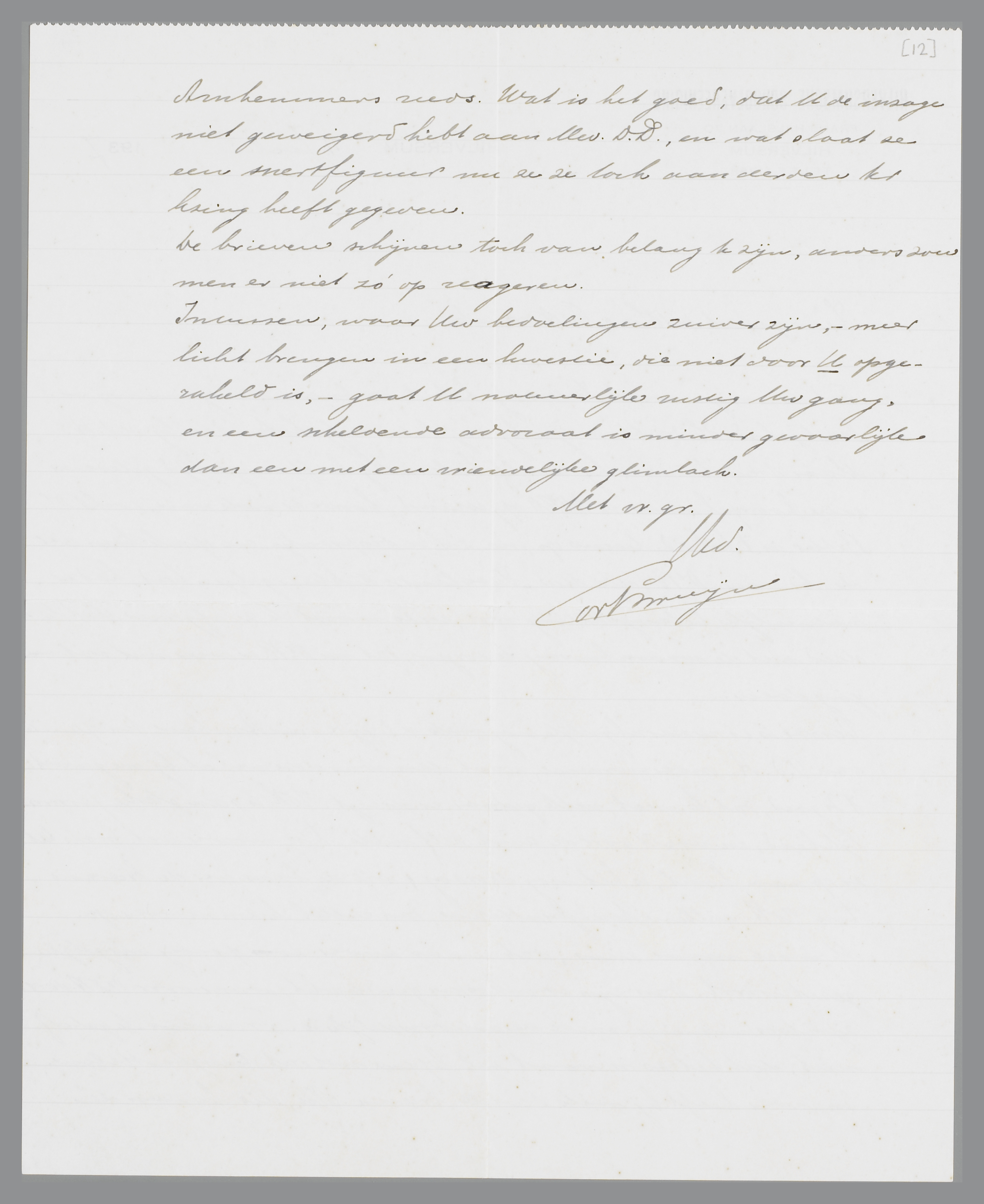 U moet maar zien, dat een en ander zo spoedig mogelijk gezet wordt. Dan zijn er onkosten gemaakt, waarvoor v/dH. door zijn toestemming medeverantwoordelijk is. Trouwens ik geloof niet, dat het zo'n vaart zal lopen met dat terugkrabbelen. En verder heeft hij niets dan de brieven. Nou, die kennen de Arnhemmers reeds. Wat is het goed, dat U de inzage niet geweigerd hebt aan Mevr. D.D., en wat slaat ze een snertfiguur nu ze ze toch aan derden ter lezing heeft gegeven.