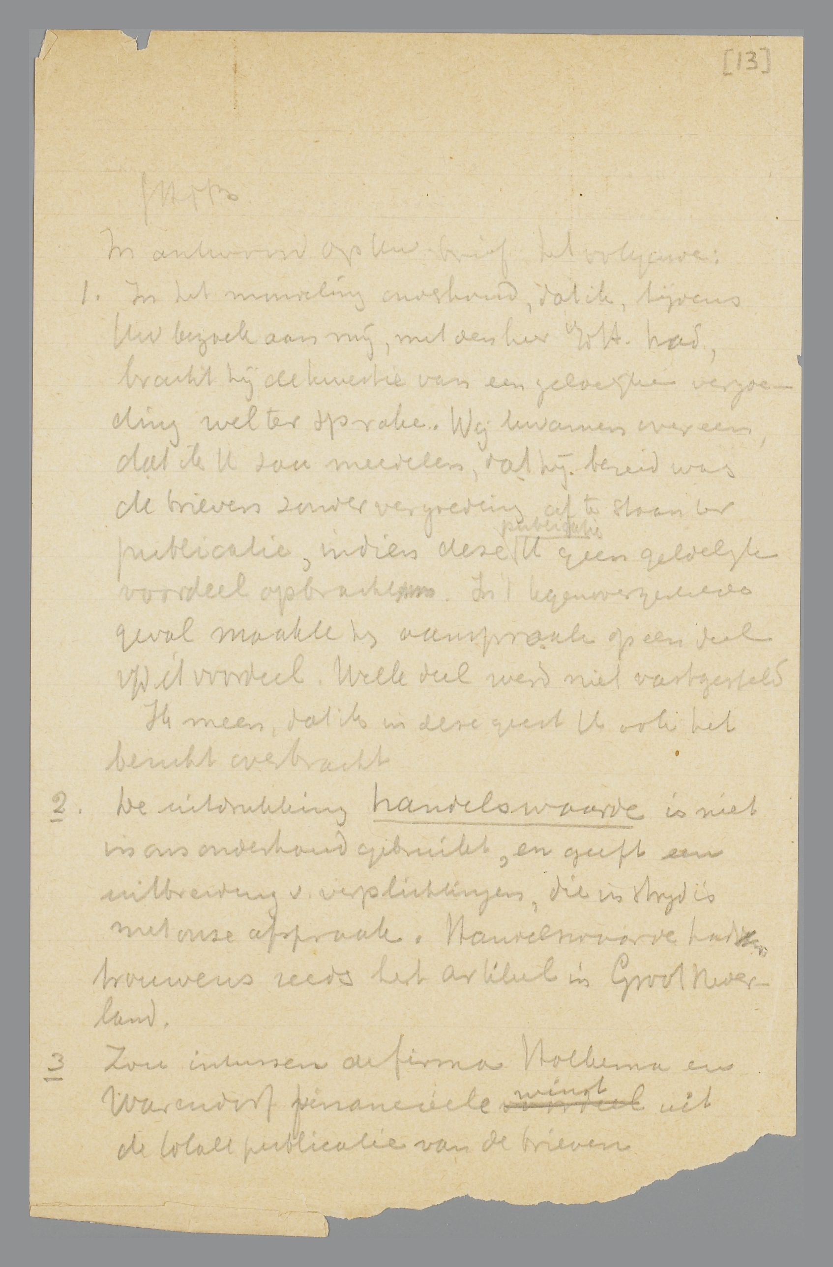 | 1. | In het mondeling onderhoud, dat ik, tijdens Uw bezoek aan mij, met den heer v/dH. had, bracht hij de kwestie van een geldelijke vergoeding wel ter sprake. Wij kwamen overeen, dat ik U zou meedelen, dat hij bereid was de brieven zonder vergoeding af te staan ter publicatie, indien deze publicatie U geen geldelijk voordeel opbracht. In 't tegenovergestelde geval maakte hij aanspraak op een deel v/h evt. voordeel. Welk deel werd niet vastgesteld. Ik meen, dat ik in deze geest U ook het bericht overbracht. |