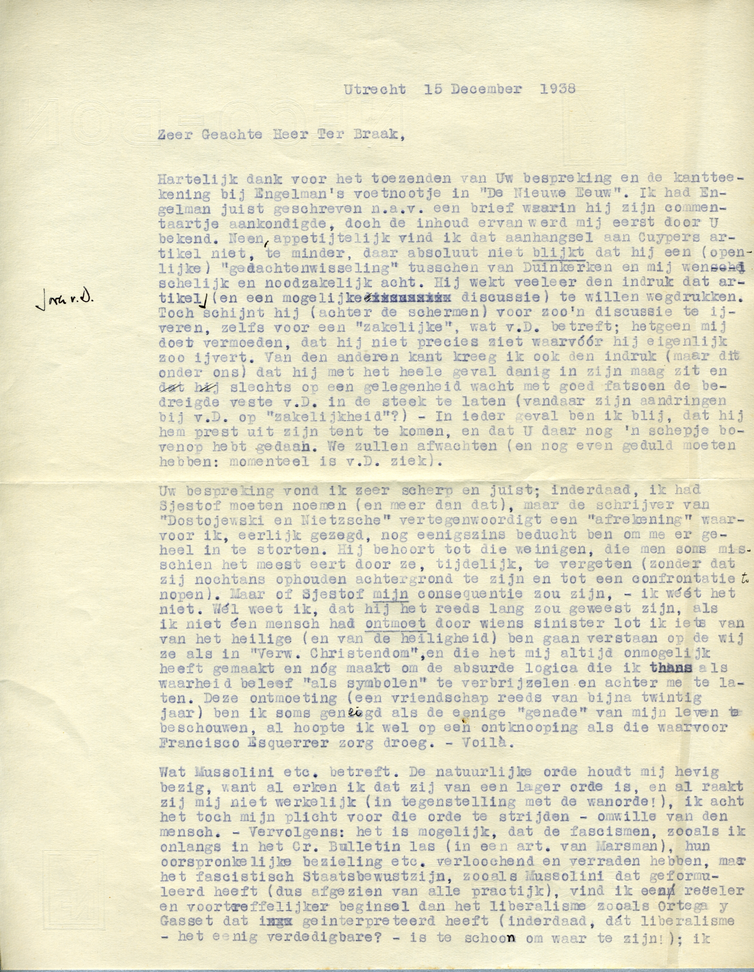 Uw bespreking vond ik zeer scherp en juist; inderdaad, ik had Sjestof moeten noemen (en meer dan dat), maar de schrijver van ‘Dostojewski en Nietzsche’ vertegenwoordigt een ‘afrekening’ waarvoor ik, eerlijk gezegd, nog eenigszins beducht ben om me er geheel in te storten. Hij behoort tot die weinigen, die men soms misschien het meest eert door ze, tijdelijk, te vergeten (zonder dat zij nochtans ophouden achtergrond te zijn en tot een confrontatie nopen). Maar of Sjestof mijn consequentie zou zijn, - ik wéét het niet. Wél weet ik, dat hij het reeds lang zou geweest zijn, als ik niet éen mensch had ontmoet door wiens sinister lot ik iets van het heilige (en van de heiligheid) ben gaan verstaan op de wijze als in ‘Verw. Christendom’, en die het mij altijd onmogelijk heeft gemaakt en nóg maakt om de absurde logica die ik thans als waarheid beleef ‘als symbolen’ te verbrijzelen en achter me te laten. Deze ontmoeting (een vriendschap reeds van bijna twintig jaar) ben ik soms geneigd als de eenige ‘genade’ van mijn leven te beschouwen, al hoopte ik wel op een ontknooping als die waarvoor Francisco Esquerrer zorg droeg. - Voilà.