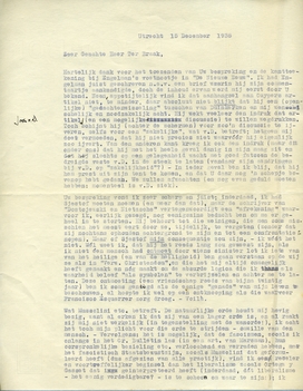 Hartelijk dank voor het toezenden van Uw bespreking en de kantteekening bij Engelman's voetnootje in ‘De Nieuwe Eeuw’. Ik had Engelman juist geschreven n.a.v. een brief waarin hij zijn commentaartje aankondigde, doch de inhoud ervan werd mij eerst door U bekend. Neen, appetijtelijk vind ik dat aanhangsel aan Cuypers artikel niet, te minder, daar absoluut niet blijkt dat hij een (openlijke) ‘gedachtenwisseling’ tusschen van Duinkerken en mij wenschelijk en noodzakelijk acht. Hij wekt veeleer den indruk dat artikel <over v.D.> (en een mogelijke discussie) te willen wegdrukken. Toch schijnt hij (achter de schermen) voor zoo'n discussie te ijveren, zelfs voor een ‘zakelijke’, wat v.D. betreft; hetgeen mij doet vermoeden, dat hij niet precies ziet waarvóór hij eigenlijk zoo ijvert. Van den anderen kant kreeg ik ook den indruk (maar dit onder ons) dat hij met het heele geval danig in zijn maag zit en slechts op een gelegenheid wacht met goed fatsoen de bedreigde veste v.D. in de steek te laten (vandaar zijn aandringen bij v.D. op ‘zakelijkheid’?) - In ieder geval ben ik blij, dat hij hem prest uit zijn tent te komen, en dat U daar nog 'n schepje bovenop hebt gedaan. We zullen afwachten (en nog even geduld moeten hebben: momenteel is v.D. ziek).