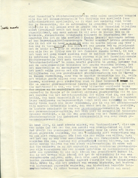 Wat Mussolini etc. betreft. De natuurlijke orde houdt mij hevig bezig, want al erken ik dat zij van een lager orde is, en al raakt zij mij niet werkelijk (in tegenstelling met de wanorde!), ik acht het toch mijn plicht voor die orde te strijden - omwille van den mensch. - Vervolgens: het is mogelijk, dat de fascismen, zooals ik onlangs in het Cr. Bulletin las (in een art. van Marsman), hun oorspronkelijke bezieling etc. verloochend en verraden hebben, maar het fascistisch Staatsbewustzijn, zooals Mussolini dat geformuleerd heeft (dus afgezien van alle practijk), vind ik een reëeler en voortreffelijker beginsel dan het liberalisme zooals Ortega y Gasset dat geinterpreteerd heeft (inderdaad, dát liberalisme - het eenig verdedigbare? - is te schoon om waar te zijn!); ik vind Mussolini's Staatsbewustzijn ook een vele malen completer bewustzijn dan het klasse-bewustzijn dat Maritain zoo opvijzelt (zoo anti-thomistisch opvijzelt), en ik vind het oneindig veel beter dan de democratie, die de ontkenning is geworden van elk bewustzijn <[...]tte anarchie> (als ik mij schaam over de groote bek die Mussolini bijwijlen opzet (overigens heeft dat toch ook wel iets aardigs op sommige oogenblikken), nog meer schaam ik mij over de kleine bek en de krakende, rheumatische bewegingen waarmede de kopstukken der democratie (en let op hún smoelen!) Koning Leopold ontvangen hebben of hun Regeeringsjubileumsvreugde ‘onder woorden’ hebben gebracht; als ik dat zie en hoor - maar we zien en hooren helaas nog meer - dan zeg ik toch: dan maar liever met een groote bek en regelrecht met de heel zaak naar de verdommenis). Neen, als ik anti-fascist zou zijn (en om Hitler zou ik het fascisme kunnen haten), ik zou het toch met geen woord opnemen voor de huidige democratie. En als ik politicus was, zou mijn eenig streven zijn het Mussoliniaansche Staatsbewustzijn (dat noch theoretisch, noch practisch iets met ‘staatsabsolutisme’ te maken heeft) gestalte te geven, hoezeer dan ook de oorspronkelijke bezielers het zouden verraden hebben. Dat het onhebbelijke en onaangename kanten zou hebben, ongetwijfeld; het heeft zulks gemeen met elk ander regime. Maar de mogelijke onbillijkheden van een gerealiseerd Staatsbewustzijn zou ik durven en kunnen verdedigen, maar van de huidige democratie kan ik, zelfs het weinige goede alleen maar verachten. Ik vind de 400 000 werkloozen, waarover geen sterveling zich au fond bekommert en die we zonder gewetensbezwaar zouden laten crepeeren als het niet zoo onfatsoenlijk was, een heel wat bitterder aanklacht tegen óns regime en de mentaliteit die de democratie kweekt, dan de burgeroorlog in Spanje of de zooveel millioen gecrepeerden die de inzet vormden van het Sovjet-paradijs; dat alles vind ik, zoo niet heilig, dan toch menschelijk bij de werkelijkheid die dat lugubere leger werkloozen vertegenwoordigt (want welk een ellendig en miezerig drama vormt elk dezer menschen). Als ik aan het Staatsbewustzijn zooveel beteekenis hecht, dan omdat het de laatste gestalte, de laatste conclusie is van een gemeenschaps-bewustzijn, en van een gemeenschapsbewustzijn, dat zich niet in onmogelijke toekomstdroomen verliest. - En aan den grondslag van het Mussoliniaansche Staatsbewustzijn lag inderdaad oorspronkelijk een zeer sterk gemeenschapsbewustzijn.
