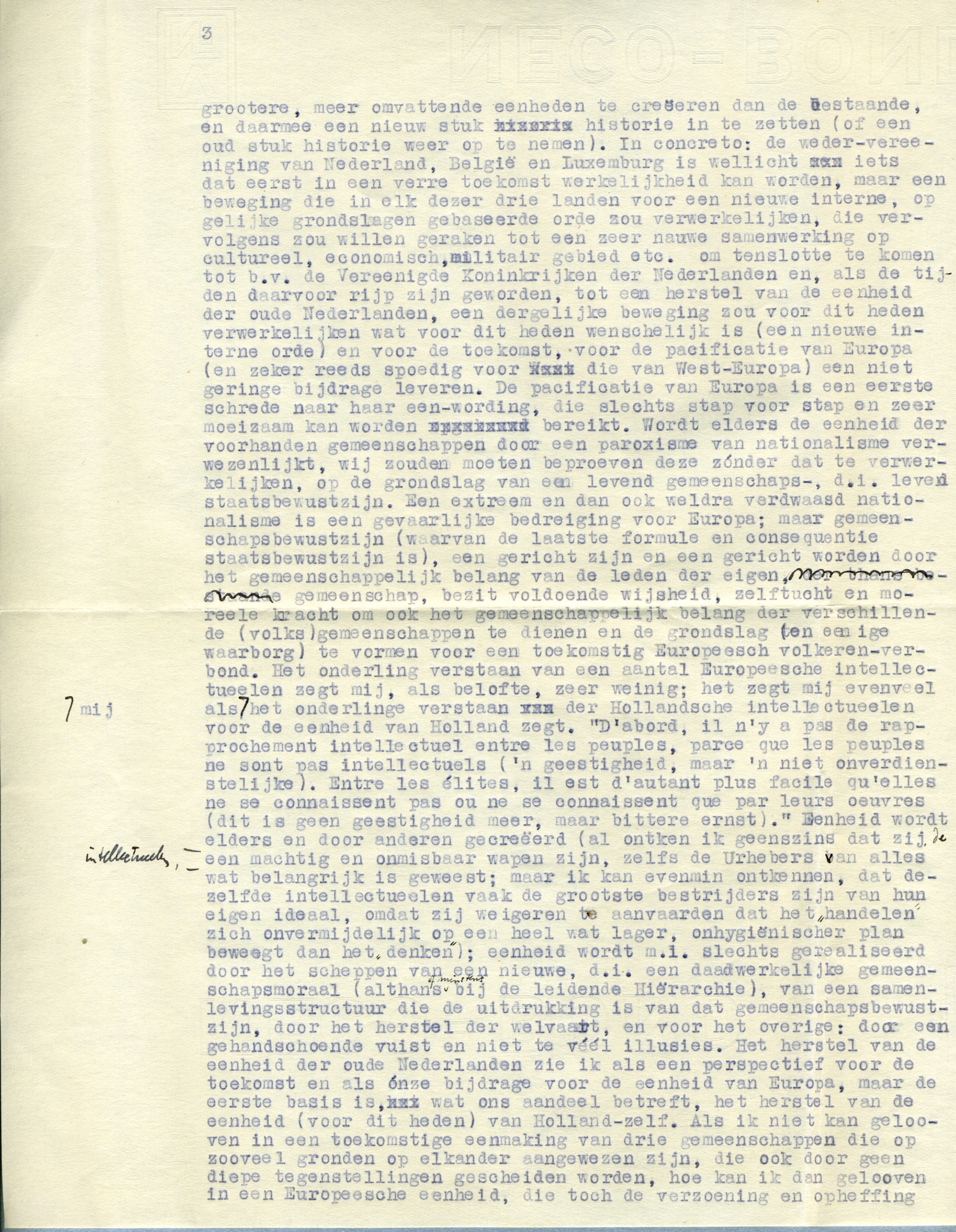 Ik houd niet, ik houd steeds minder, van ‘nationalisme’, als ware een natie (of wat men dan zoo noemt) een eeuwig-durend en door God gewild (en geschapen!) verschijnsel; maar ik erken wél historisch gegroeide eenheden, die men voorloopig niet vernietigen mag en ook niet vernietigen kán (ook als men zulks zou willen, b.v. met het oog op een meer omvattende i.c. een Europeesche eenheid), eenheden die men, zoolang zij gehandhaafd moeten blijven, ook bezield moeten blijven van een sterk zelfbewustzijn; ik erken ook dat die eenheden de op dit oogenblik eenig voorhanden gemeenschappen zijn waarbinnen men een nieuwe politieke en maatschappelijke orde kan opbouwen; en als mijn ideaal een geunifieerd Europa is, dan is het tevens mijn ideaal dat het de uitdrukking is van een verantwoorde pol. soc. orde, doch déze moet reeds nu en in de voorhanden gemeenschappen worden ingezet (terwille van de thans-levenden). Erken ik, als het product van eeuwen historie, het bestaan van historisch gegroeide eenheden, een historisch bepaalde lotsverbondenheid, ik erken tevens het recht (den plicht ook soms) grootere, meer omvattende eenheden te creëeren dan de bestaaande, en daarmee een nieuw stuk historie in te zetten (of een oud stuk historie weer op te nemen). In concreto: de weder-vereeniging van Nederland, België en Luxemburg is wellicht iets dat eerst in een verre toekomst werkelijkheid kan worden, maar een beweging die in elk dezer drie landen voor een nieuwe interne, op gelijke grondslagen gebaseerde orde zou verwerkelijken, die vervolgens zou willen geraken tot een zeer nauwe samenwerking op cultureel, economisch, militair gebied etc. om tenslotte te komen tot b.v. de Vereenigde Koninkrijken der Nederlanden en, als de tijden daarvoor rijp zijn geworden, tot een herstel van de eenheid der oude Nederlanden, een dergelijke beweging zou voor dit heden verwerkelijken wat voor dit heden wenschelijk is (een nieuwe interne orde) en voor de toekomst, voor de pacificatie van Europa (en zeker reeds spoedig voor die van West-Europa) een niet geringe bijdrage leveren. De pacificatie van Europa is een eerste schrede naar haar een-wording, die slechts stap voor stap en zeer moeizaam kan worden bereikt. Wordt elders de eenheid der voorhanden gemeenschappen door een paroxisme van nationalisme verwezenlijkt, wij zouden moeten beproeven deze zónder dat te verwerkelijken, op de grondslag van een levend gemeenschaps-, d.i. levend staatsbewustzijn. Een extreem en dan ook weldra verdwaasd nationalisme is een gevaarlijke bedreiging voor Europa; maar gemeenschapsbewustzijn (waarvan de laatste formule en consequentie staatsbewustzijn is), een gericht zijn en een gericht worden door het gemeenschappelijk belang van de leden der eigen gemeenschap, bezit voldoende wijsheid, zelftucht en moreele kracht om ook het gemeenschappelijk belang der verschillende (volks)gemeenschappen te dienen en de grondslag (en eenige waarborg) te vormen voor een toekomstig Europeesch volkeren-verbond. Het onderling verstaan van een aantal Europeesche intellectueelen zegt mij, als belofte, zeer weinig; het zegt mij evenveel als mij het onderlinge verstaan der Hollandsche intellectueelen voor de eenheid van Holland zegt. ‘D'abord, il n'y a pas de rapprochement intellectuel entre les peuples, parce que les peuples ne sont pas intellectuels ('m geestigheid, maar 'n niet onverdienstelijke). Entre les élites, il est d'autant plus facile qu'elles ne se connaissent pas ou ne se connaissent que par leurs oeuvres (dit is geen geestigheid meer, maar bittere ernst).’ Eenheid wordt elders en door anderen gecreëerd (al ontkent ik geenszins dat zij<, intellectueelen,> een machtig en onmisbaar wapen zijn, zelfs de Urhebers van alles wat belangrijk is geweest; maar ik kan evenmin ontkennen, dat dezelfde intellectueelen vaak de grootste bestrijders zijn van hun eigen ideaal, omdat zij weigeren te aanvaarden dat het ‘handelen’ zich onvermijdelijk op een heel wat lager, onhygiënischer plan beweegt dan het ‘denken’); eenheid wordt m.i. slechts gerealiseerd door het scheppen van een nieuwe, d.i. een daadwerkelijke gemeenschapsmoraal (althans <of minstens> bij de leidende Hiërarchie), van een samenlevingsstructuur die de uitdrukking is van dat gemeenschapsbewustzijn, door het herstel der welvaart, en voor het overige: door een gehandschoende vuist en niet te véél illusies. Het herstel van de eenheid der oude Nederlanden zie ik als een perspectief voor de toekomst en als ónze bijdrage voor de eenheid van Europa, maar de eerste basis is, wat ons aandeel betreft, het herstel van de eenheid (voor dit heden) van Holland-zelf. Als ik niet kan gelooven in een toekomstige eenmaking van drie gemeenschappen die op zooveel gronden op elkander aangewezen zijn, die ook door geen diepe tegenstellingen gescheiden worden, hoe kan ik dan gelooven in een Europeesche eenheid, die toch de verzoening en opheffing eischt van zeer diepe tegenstellingen.