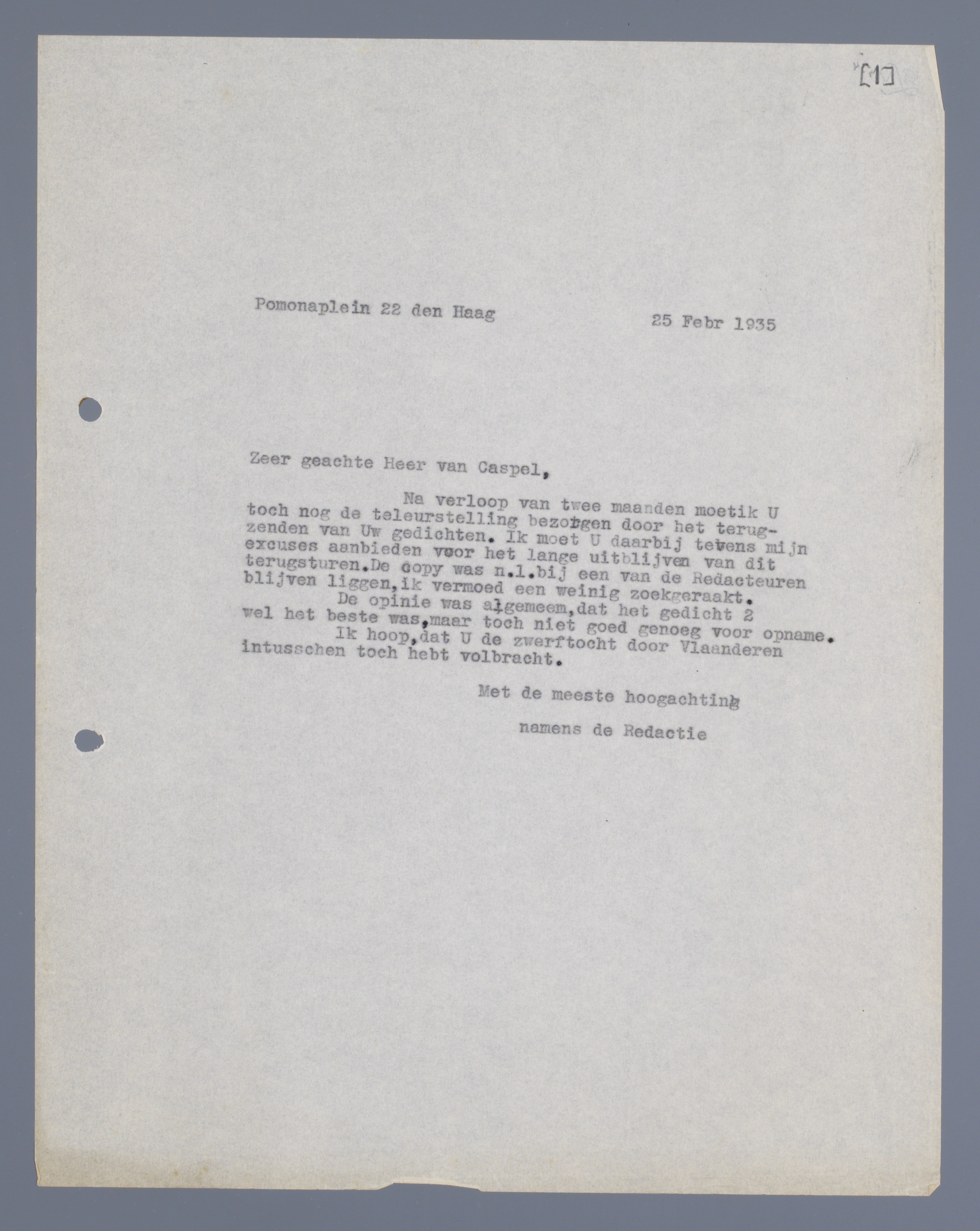 Na verloop van twee maanden moet ik U toch nog de teleurstelling bezorgen door het terugzenden van uw gedichten. Ik moet U daarbij tevens mijn excuses aanbieden voor het lange uitblijven van dit terugsturen. De copy was n.l. bij een van de Redacteuren blijven liggen, ik vermoed een weinig zoekgeraakt.