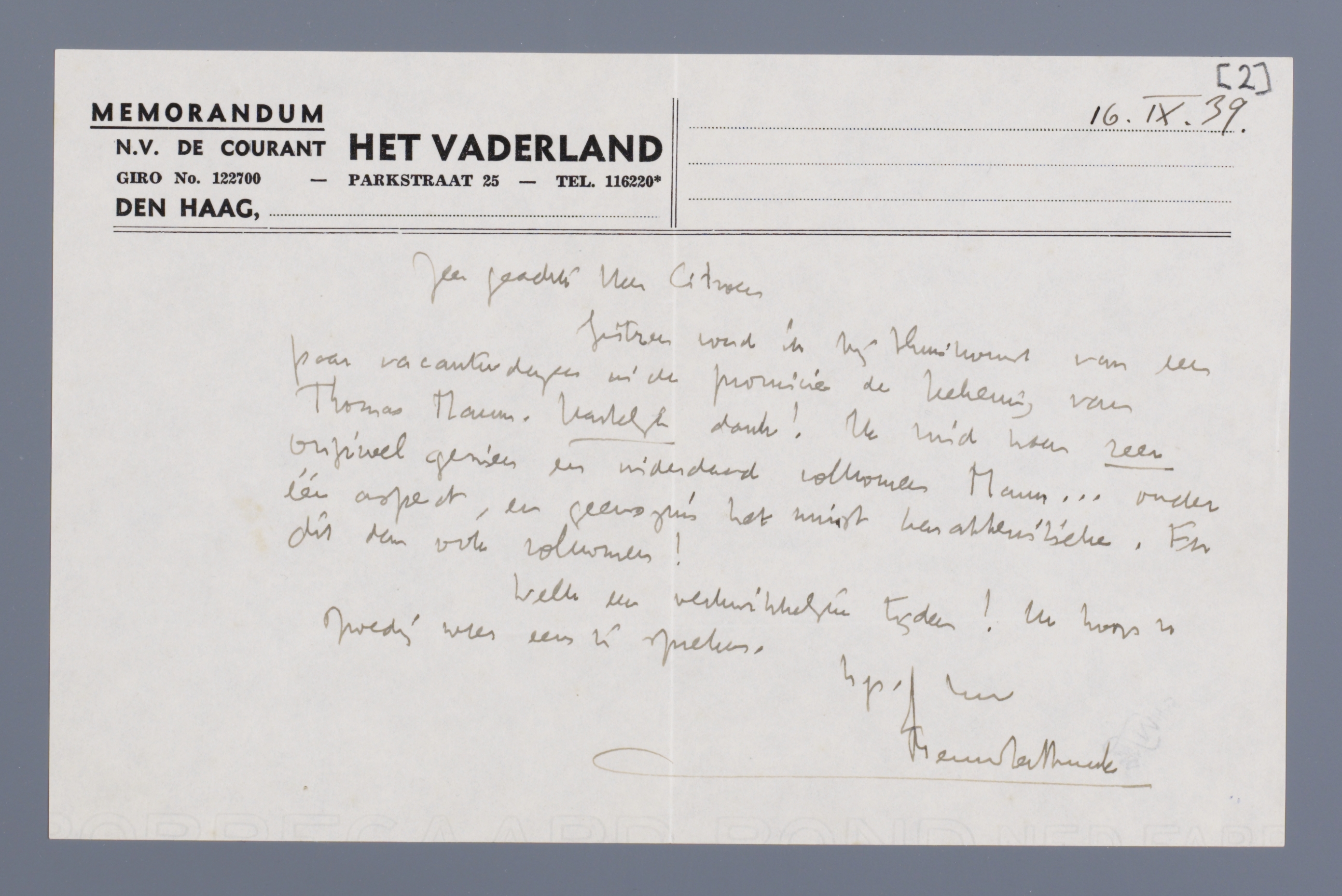 Gisteren vond ik bij thuiskomst van een paar vacantiedagen in de provincie de teekening van Thomas Mann. Hartelijk dank! Ik vind haar zeer origineel gezien en inderdaad volkomen Mann... onder één aspect, en geenszins het minst karakteristieke. En dit dan ook volkomen!