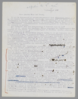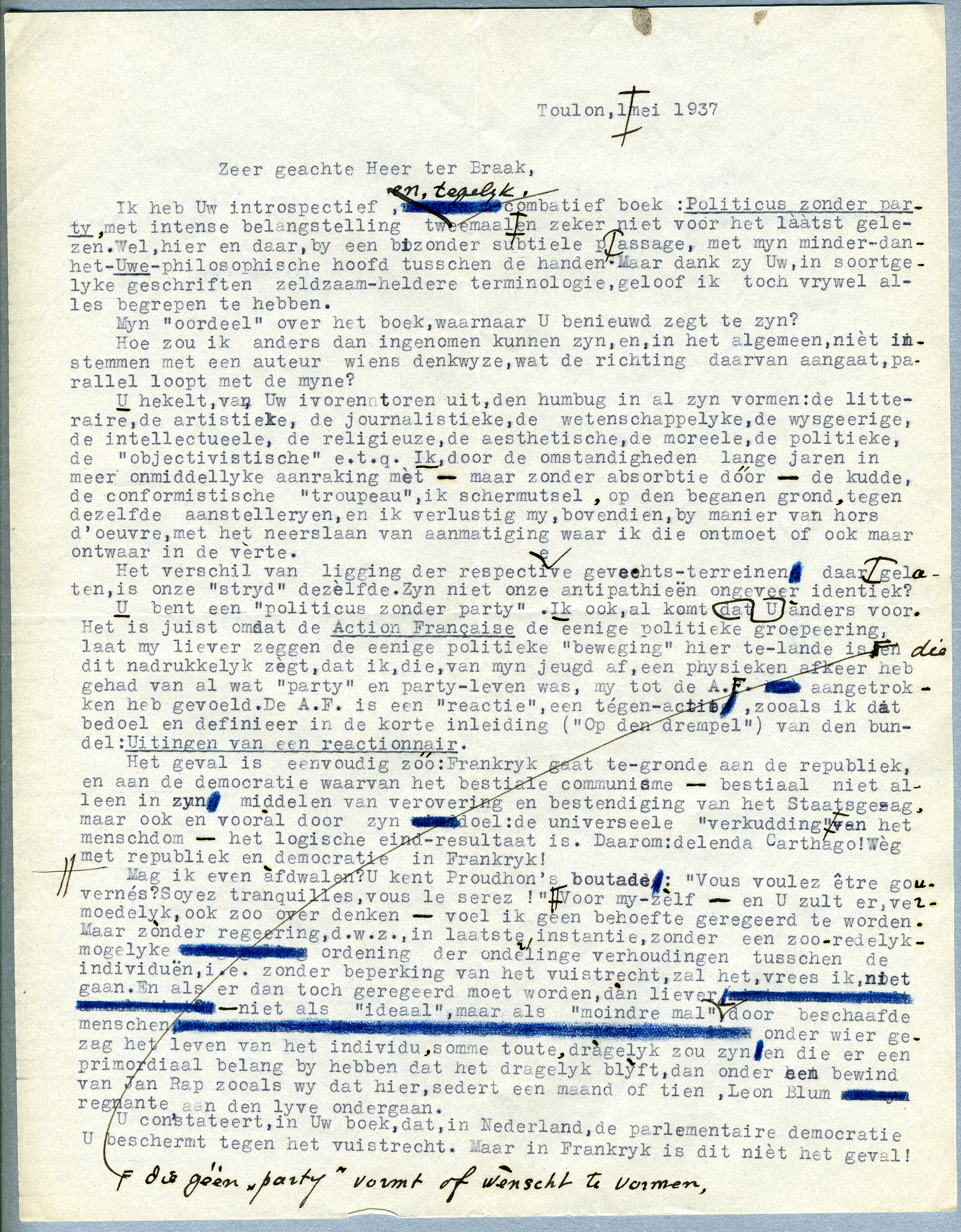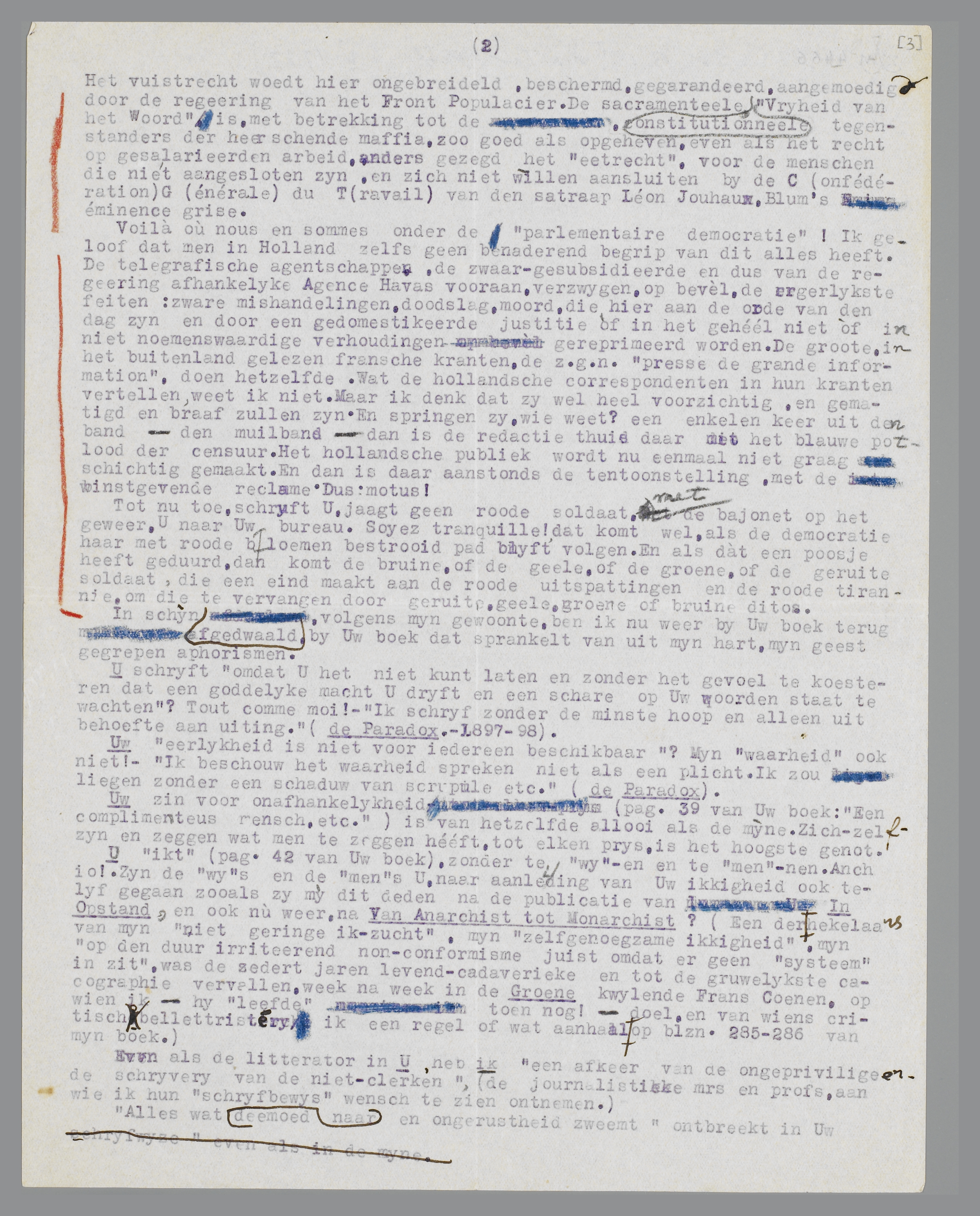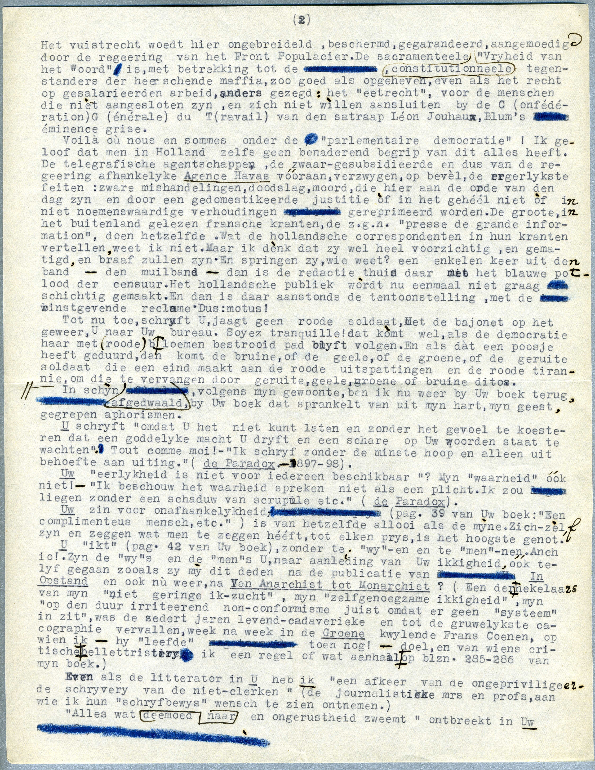 U constateert, in Uw boek, dat in Nederland, de parlementaire democratie U beschermt tegen het vuistrecht. Maar in Frankryk is dit nièt het geval! Het vuistrecht woedt hier ongebreideld, beschermd, gegarandeerd, aangemoedigd door de regeering van het Front Populacier. De sacramenteele, constitutionneele ‘Vryheid van het Woord’ is, met betrekking tot de tegenstanders der heerschende maffia, zoo goed als opgeheven, even als het recht op gesalarieerden arbeid, anders gezegd: het ‘eetrecht’, voor de menschen die nièt aangesloten zyn, en zich niet wìllen aansluiten by de C (onfédération) G (énérale) du T (ravail) van den satraap Léon Jouhaux, Blum's éminence grise.