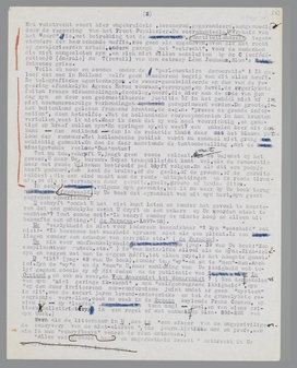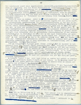 Voilà où nous en sommes onder de ‘parlementaire democratie’! Ik geloof dat men in Holland zelfs geen benaderend begrip van dit alles heeft. De telegrafische agentschappen, de zwaar-gesubsidieerde en dus van de regering afhankelyke Agence Havas vóóraan, verzwygen, op bevèl, de ergerlykste feiten: zware mishandelingen, doodslag, moord, die hier aan de orde van den dag zyn en door een gedomestikeerde justitie òf in het gehéél niet òf in niet noemenswaardige verhoudingen gereprimeerd worden. De groote, in het buitenland gelezen fransche kranten, de z.g.n. ‘presse de grande information’, doen hetzelfde. Wat de hollandsche correspondenten in hun kranten vertellen, weet ik niet. Maar ik dènk dat zy wel heel voorzichtig, en gematigd, en braaf zullen zyn. En springen zy, wie weet? een enkelen keer uit den band - den muilband - dan is de redactie thuis daar met het blauwe potlood der censuur. Het hollandsche publiek wòrdt nu eenmaal niet graag schichtig gemaakt. En dan is daar aanstonds de tentoonstelling, met de winstgevende reclame. Dus: motus!