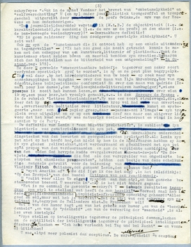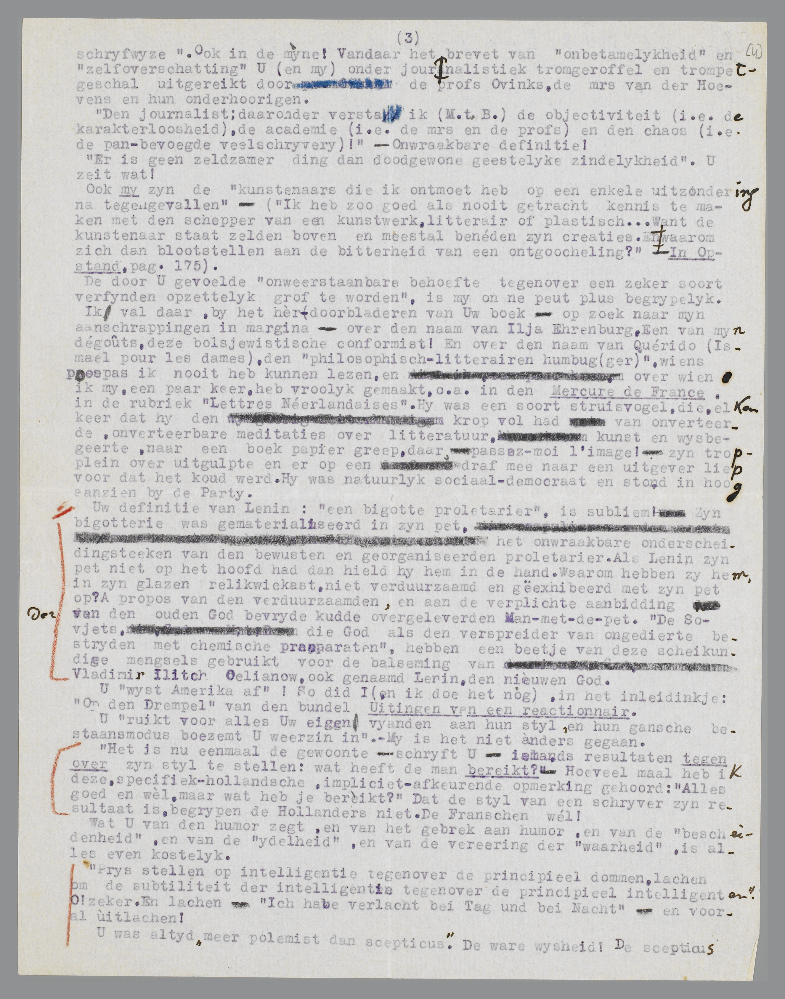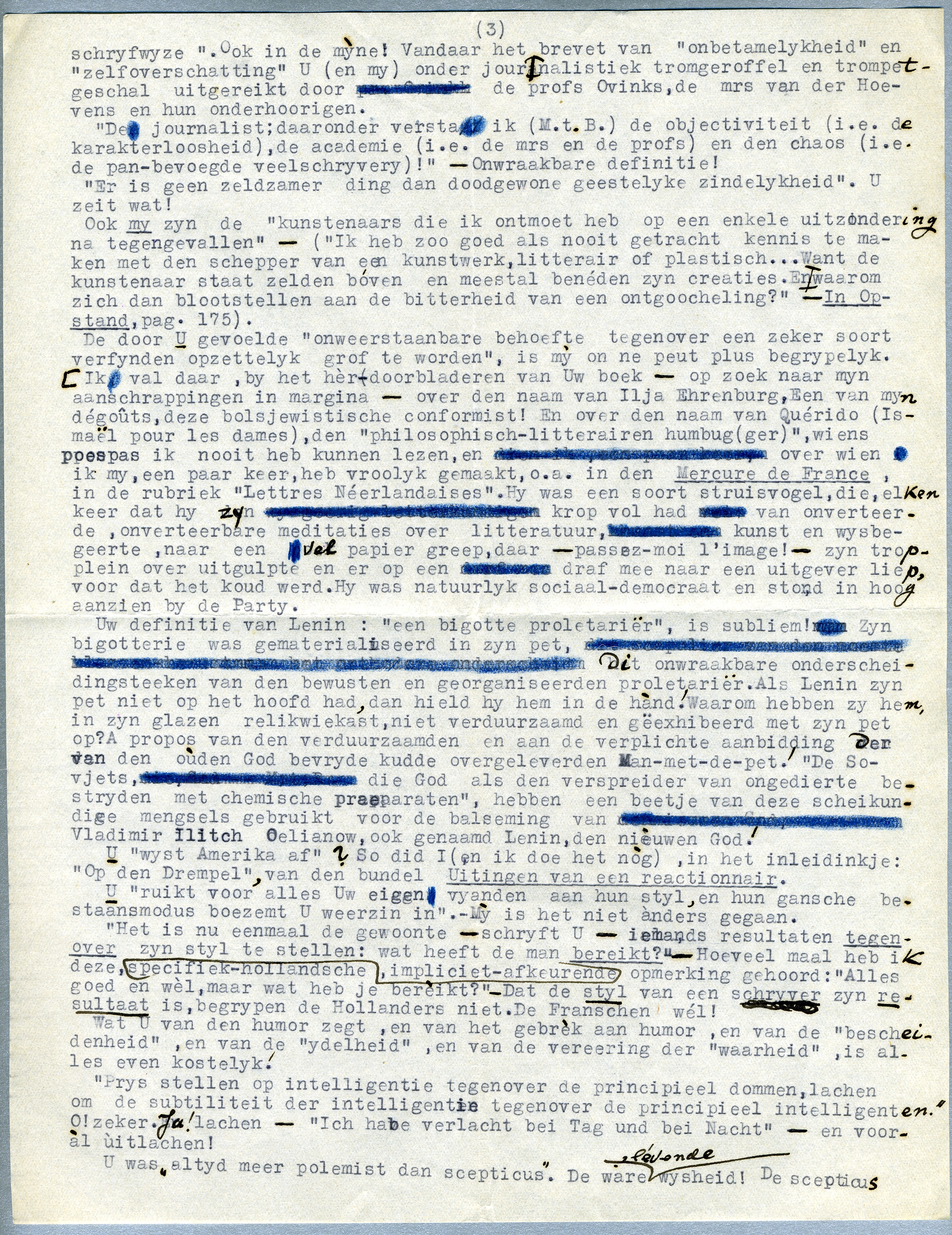 De door U gevoelde ‘onweerstaanbare behoefte tegenover een zeker soort verfynden opzettelyk grof te worden’, is my on ne peut plus begrypelyk. Ik val daar, bij het hèr-doorbladeren van Uw boek - op zoek naar myn aanschrappingen in margine - over den naam van Ilja Ehrenburg. Een van myn dégoûts, deze bolsjewistische conformist! En over den naam van Quérido (Ismael pour les dames), den ‘philosophisch-litterairen humbug(ger)’, wiens poespas ik nooit heb kunnen lezen, en over wien ik my, een paar keer, heb vroolyk gemaakt, o.a. in den Mercure de France, in de rubriek ‘Lettres Néerlandaises’. Hy was een soort struisvogel, die, elken keer dat hy den krop vol had van onverteerde, onverteerbare meditaties over litteratuur, kunst en wysbegeerte, naar een vel papier greep, daar - passez-moi l'image! - zyn trop-plein over uitgulpte en er op een draf mee naar een uitgever liep, voor dat het koud werd. Hy was natuurlyk sociaal-democraat en stond hoog in aanzien bij de Party.