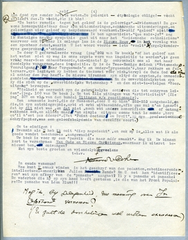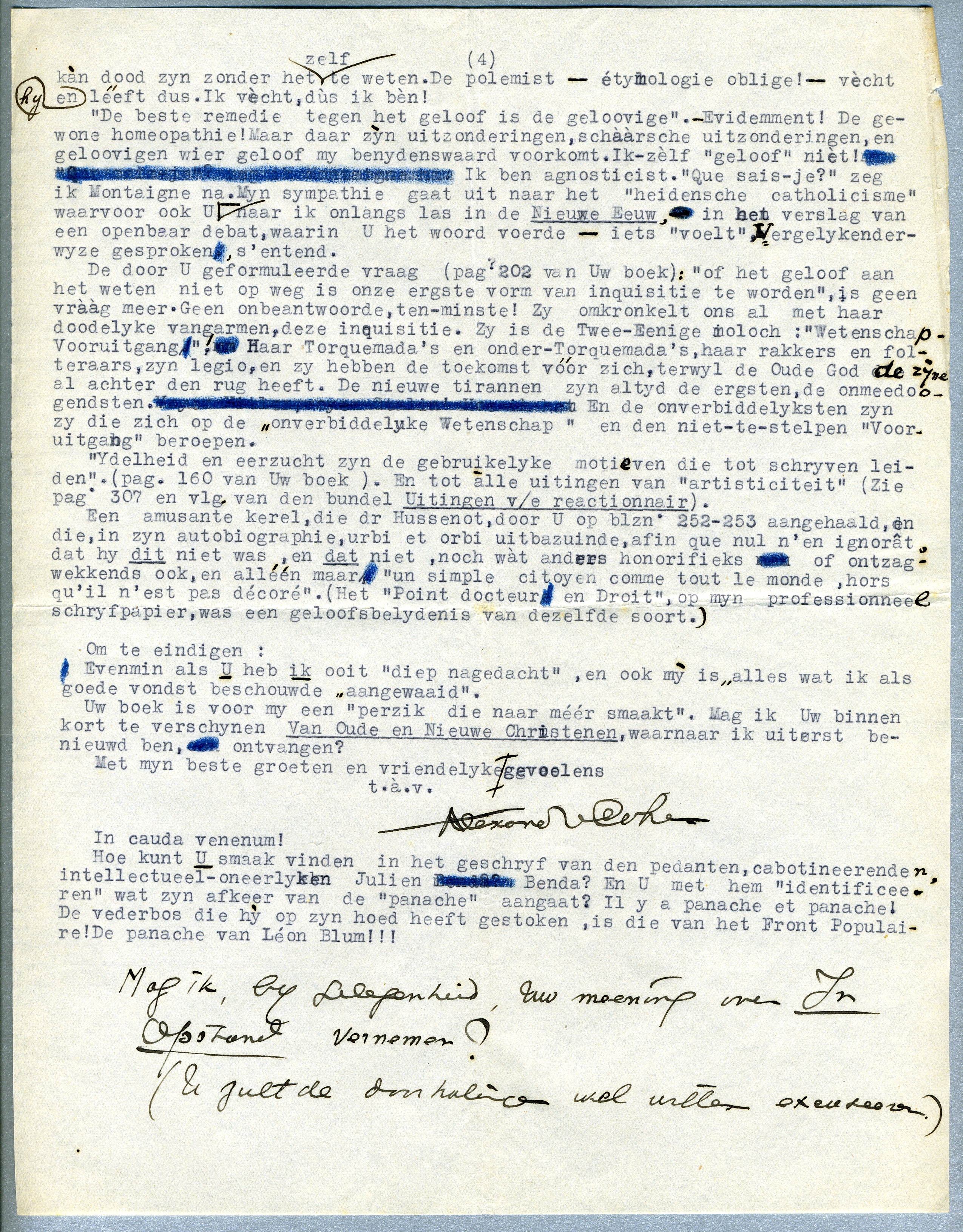 ‘De beste remedie tegen het geloof is de geloovige’. - Evidemment! De gewone homeopathie! Maar daar zyn uitzonderingen, schààrsche uitzonderingen, en geloovigen wier geloof my benydenswaard voorkomt. Ik-zèlf ‘geloof’ niet! Ik ben agnosticist. ‘Que sais-je?’ zeg ik Montaigne na. Myn sympathie gaat uit naar het ‘heidense catholicisme’ waarvoor ook U - naar ik onlangs las in de Nieuwe eeuw, in het verslag van een openbaar debat, waarin U het woord voerde - iets ‘voelt’, vergelykenderwyze gesproken, s' entend.