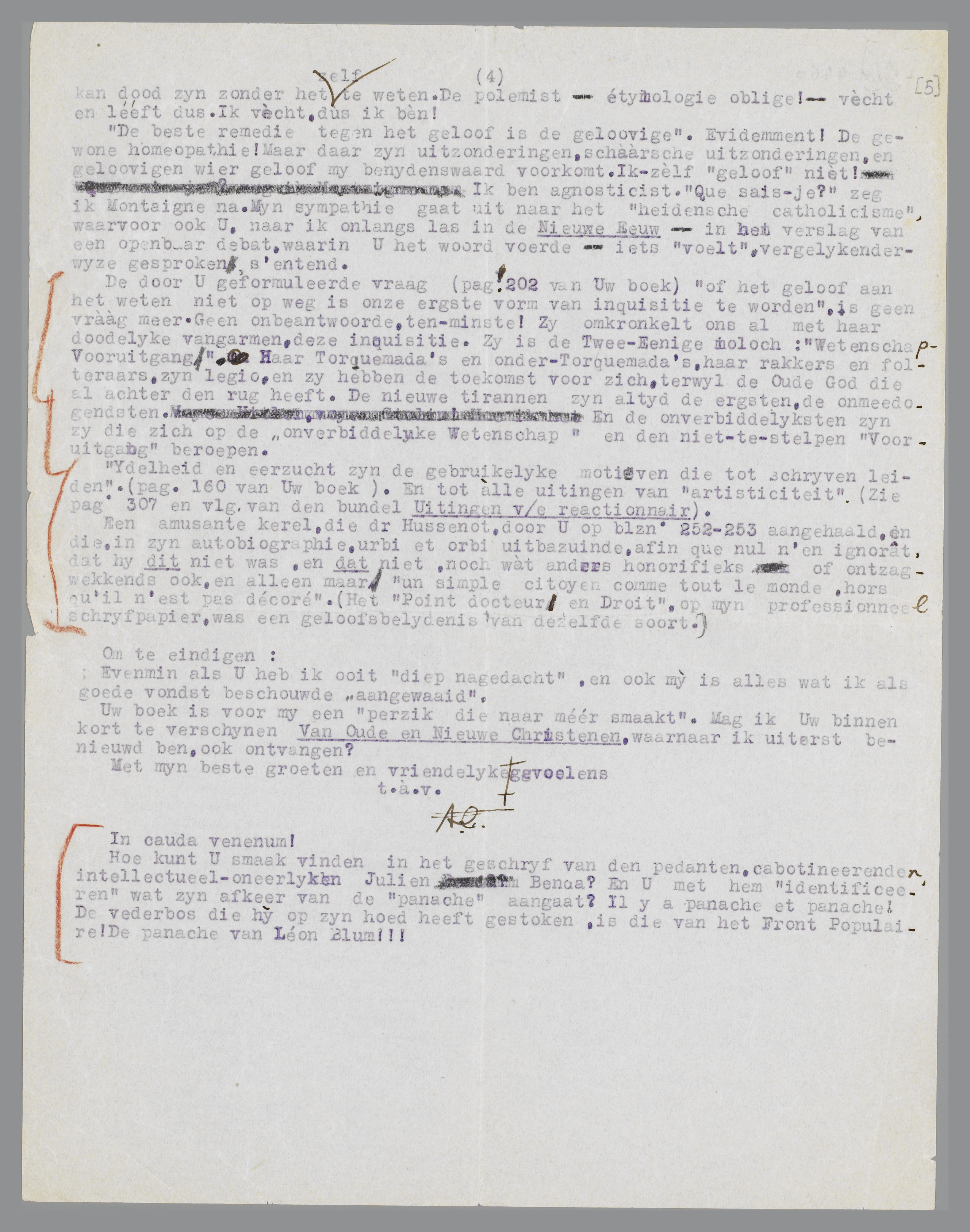 Hoe kunt U smaak vinden in het geschryf van den pedanten, cabotineerenden intellectueel-oneerlyken Julien Benda? En U met hem ‘identificeeren’ wat zyn afkeer van de ‘panache’ aangaat? Il y a panache et panache! De vederbos die hy op zyn hoed heeft gestoken, is die van het Front Populaire! De panache van Léon Blum!!!