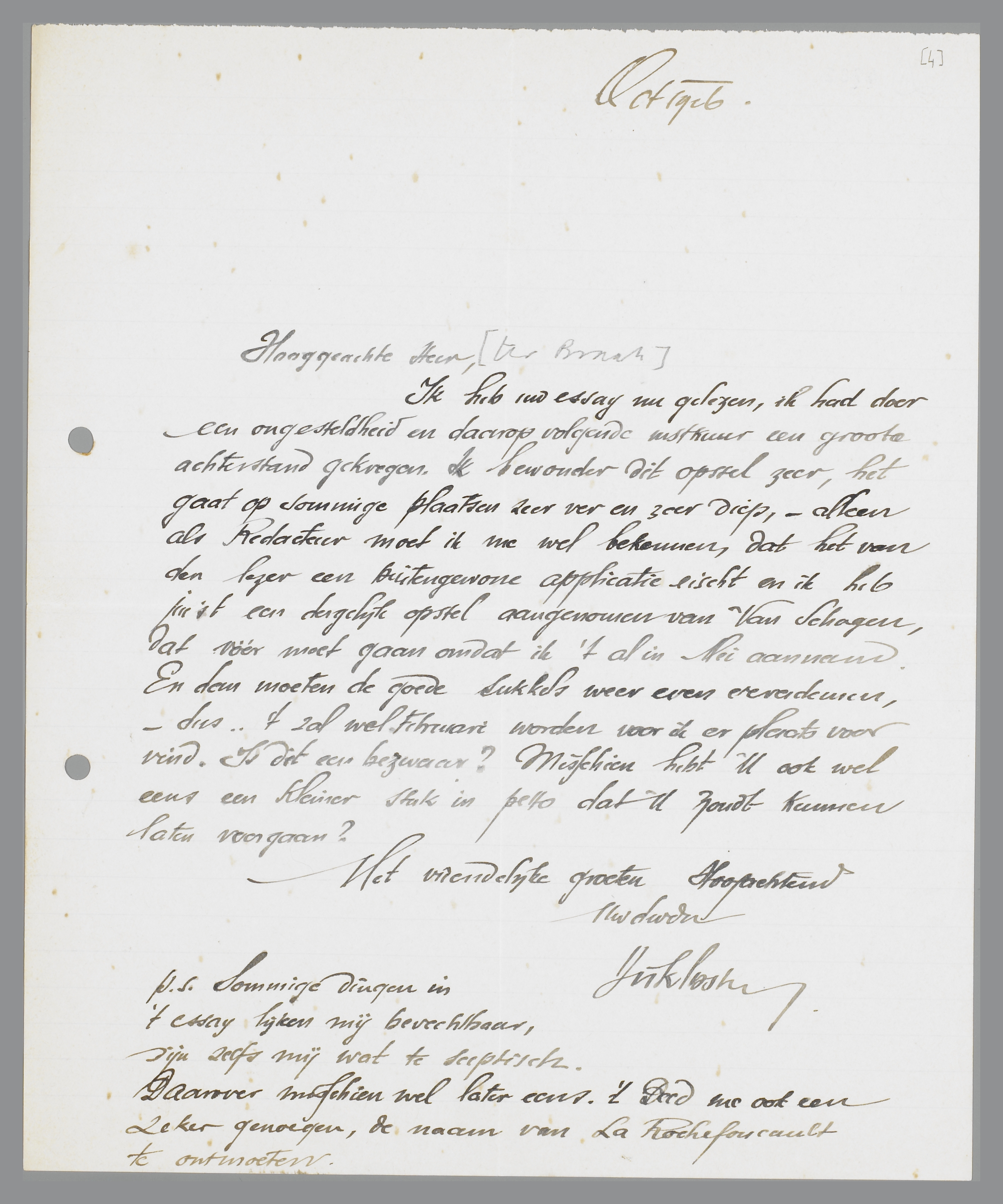 Ik heb uw essay nu gelezen, ik had door een ongesteldheid en daarop volgende rustkuur een groote achterstand gekregen. Ik bewonder dit opstel zeer, het gaat op sommige plaatsen zeer ver en zeer diep, - alleen als Redacteur moet ik me wel bekennen, dat het van den lezer een buitengewone applicatie eischt en ik heb juist een dergelijk opstel aangenomen van Van Schagen, dat vóór moet gaan omdat ik 't al in Mei aannam. En dan moeten de goede sukkels weer even verademen, - dus... 't zal wel Februari worden voor ik er plaats voor vind. Is dit een bezwaar? Misschien hebt U ook wel eens een kleiner stuk in petto dat U zoudt kunnen laten voorgaan?