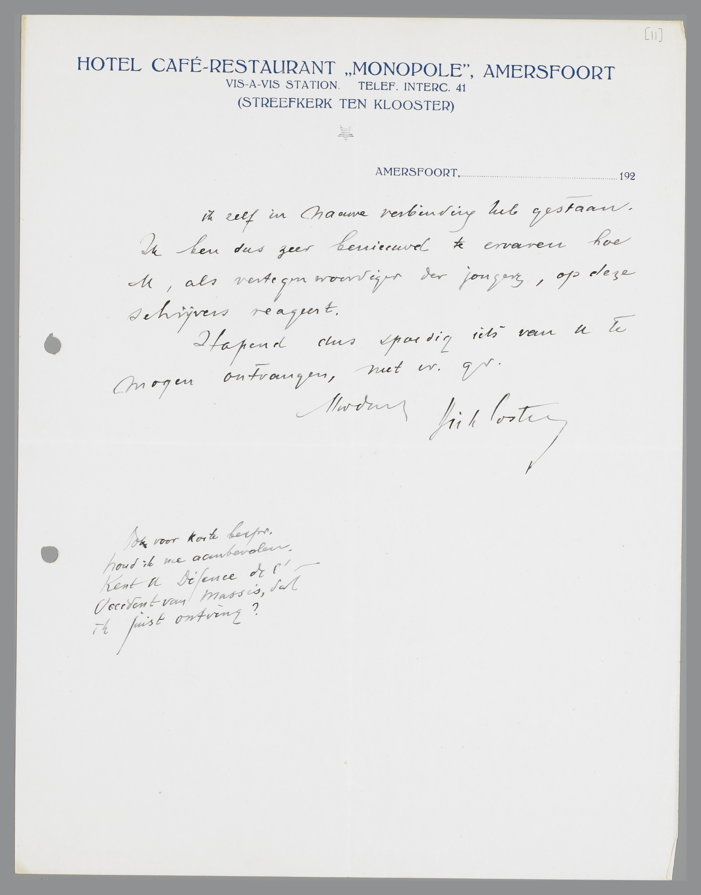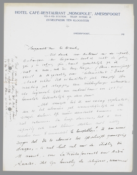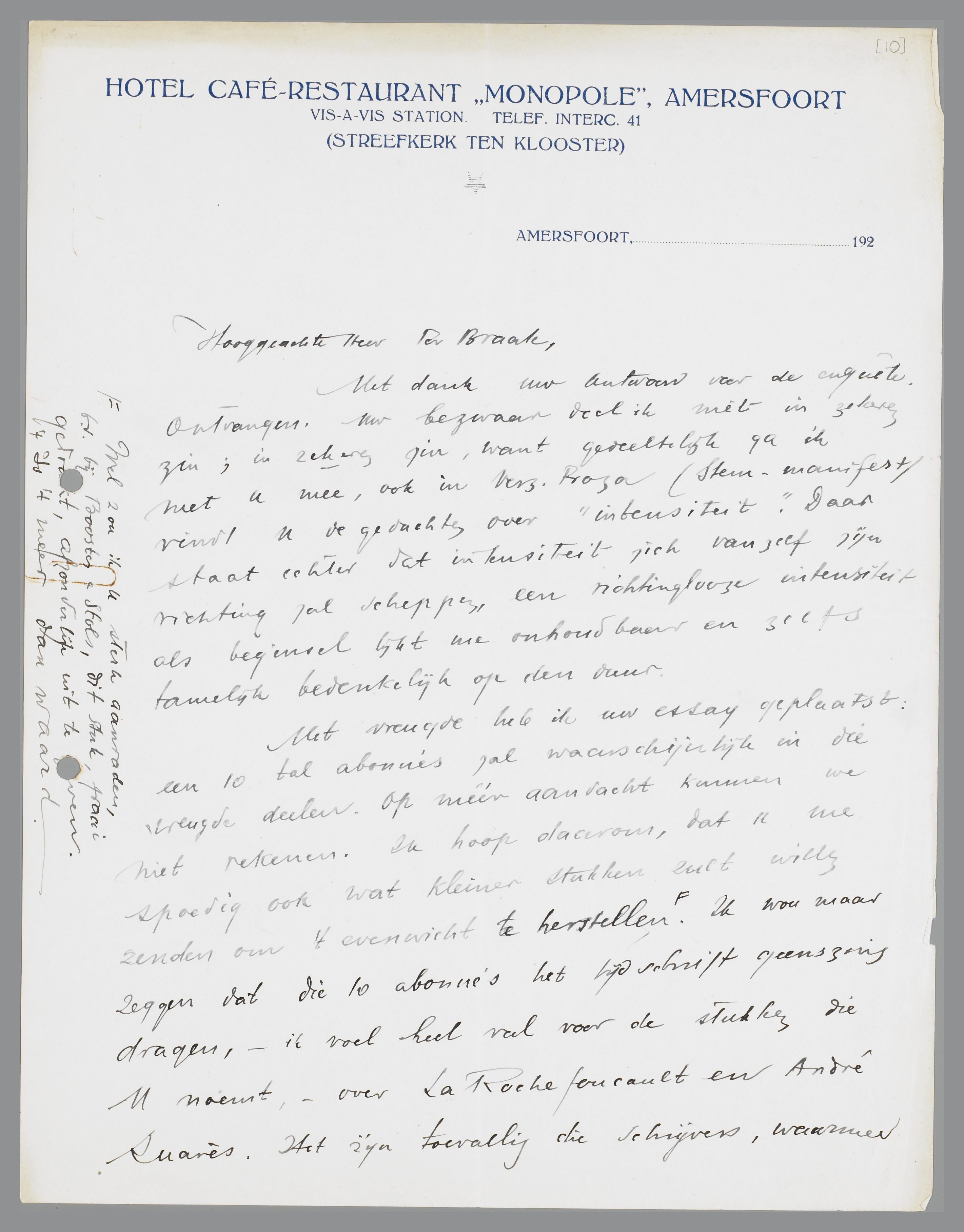 Met vreugde heb ik uw essay geplaatst: een 10 tal abonnés zal waarschijnlijk in die vreugde deelen. Op méér aandacht kunnen we niet rekenen. Ik hoop daarom, dat u me spoedig ook wat kleiner stukken zult willen zenden om 't evenwicht te herstellen. Wel zou ik u sterk aanraden, b.v. bij Boosten en Stols, dit stuk, fraai gedrukt, afzonderlijk uit te geven. 't Is 't meer dan waard. Ik wou maar zeggen dat die 10 abonnés het tijdschrift geenszins dragen, - ik voel heel veel voor de stukken die U noemt, - over La Rochefoucault en André Suarès. Het zijn toevallig die schrijvers, waarmee ik zelf in nauwe verbinding heb gestaan.