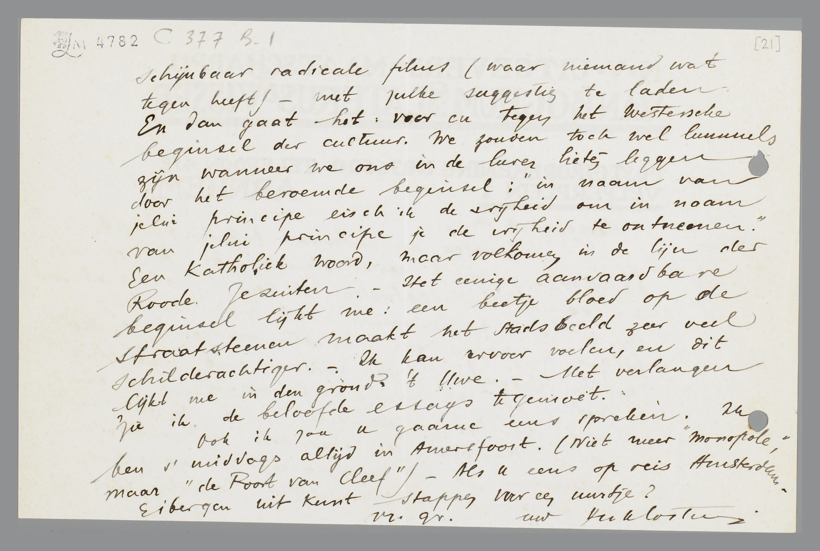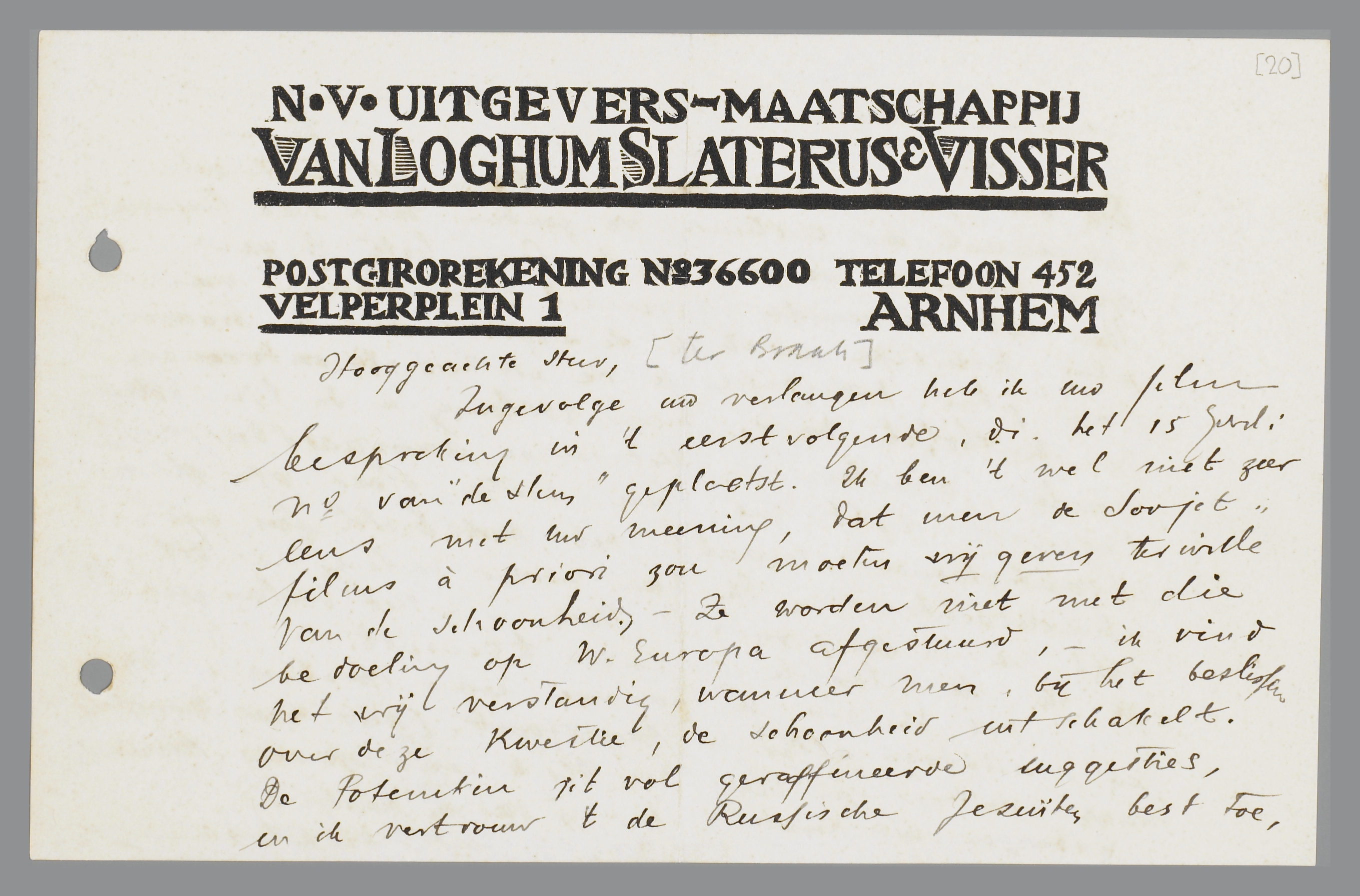 Ingevolge uw verlangen heb ik uw filmbespreking in 't eerstvolgende, d.i. het 15 Juni-No. van ‘de Stem’ geplaatst. Ik ben 't wel niet zeer eens met uw meening, dat men de Sovjetfilms à priori zou moeten vrij geven ter wille van de schoonheid. - Ze worden niet met die bedoeling op W. Europa afgestuurd, - ik vind het vrij verstandig, wanneer men, bij het beslissen over deze kwestie, de schoonheid uitschakelt. De Potemkin zit vol geraffineerde suggesties, en ik vertrouw 't de Russische Jezuïten best toe, schijnbaar radicale films (waar niemand wat tegen heeft) - met zulke suggesties te laden. En dan gaat het: voor en tegen het westersche beginsel der cultuur. We zouden toch wel lummels zijn wanneer we ons in de luren lieten leggen door het beroemde beginsel: ‘in naam van jelui principe eisch ik de vrijheid om in naam van jelui principe je de vrijheid te ontnemen.’ Een Katholiek woord, maar volkomen in de lijn der Roode Jezuiten. - Het eenige aanvaardbare beginsel lijkt me: een beetje bloed op de straatsteenen maakt het stadsbeeld zeer veel schilderachtiger. - Ik kan ervoor voelen, en dit lijkt me in den grond 't Uwe. - Met verlangen zie ik de beloofde essays tegemoet.