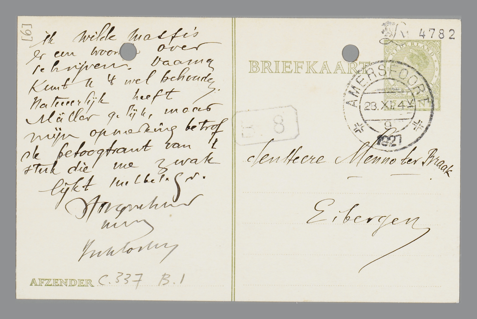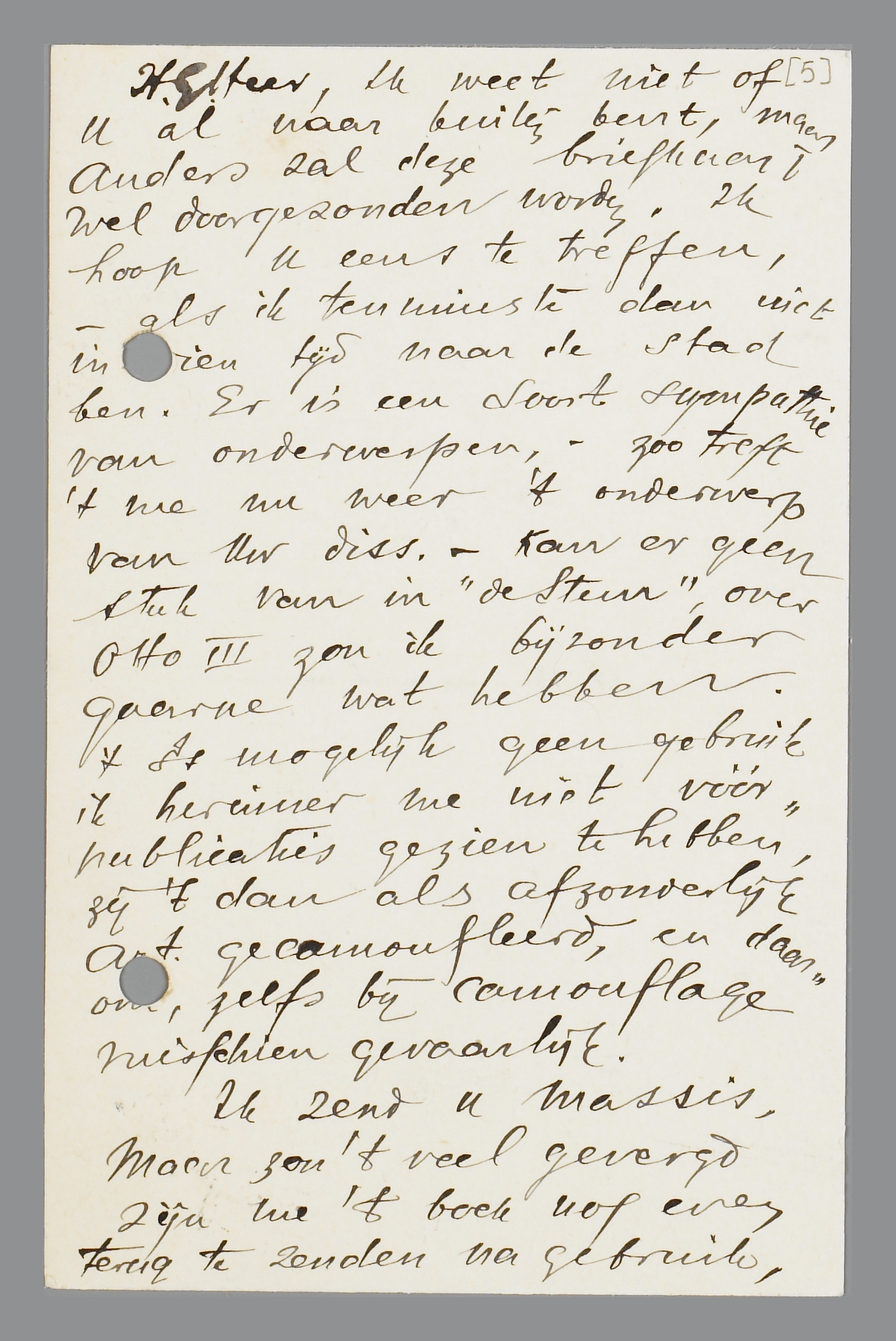 Ik weet niet of U al naar buiten bent, maar anders zal deze briefkaart wel doorgezonden worden. Ik hoop U eens te treffen, - als ik tenminste dan niet in dien tijd naar de stad ben. er is een soort sympathie van onderwerpen, - zoo treft 't me nu weer 't onderwerp van Uw diss. - Kan er geen stuk van in ‘de Stem’, over Otto III zou ik bijzonder gaarne wat hebben. 't Is mogelijk geen gebruik, ik herinner me niet vóórpublicaties gezien te hebben, zij het dan als afzonderlijk art. gecamoufleerd, en daarom, zelfs bij camouflage misschien gevaarlijk.