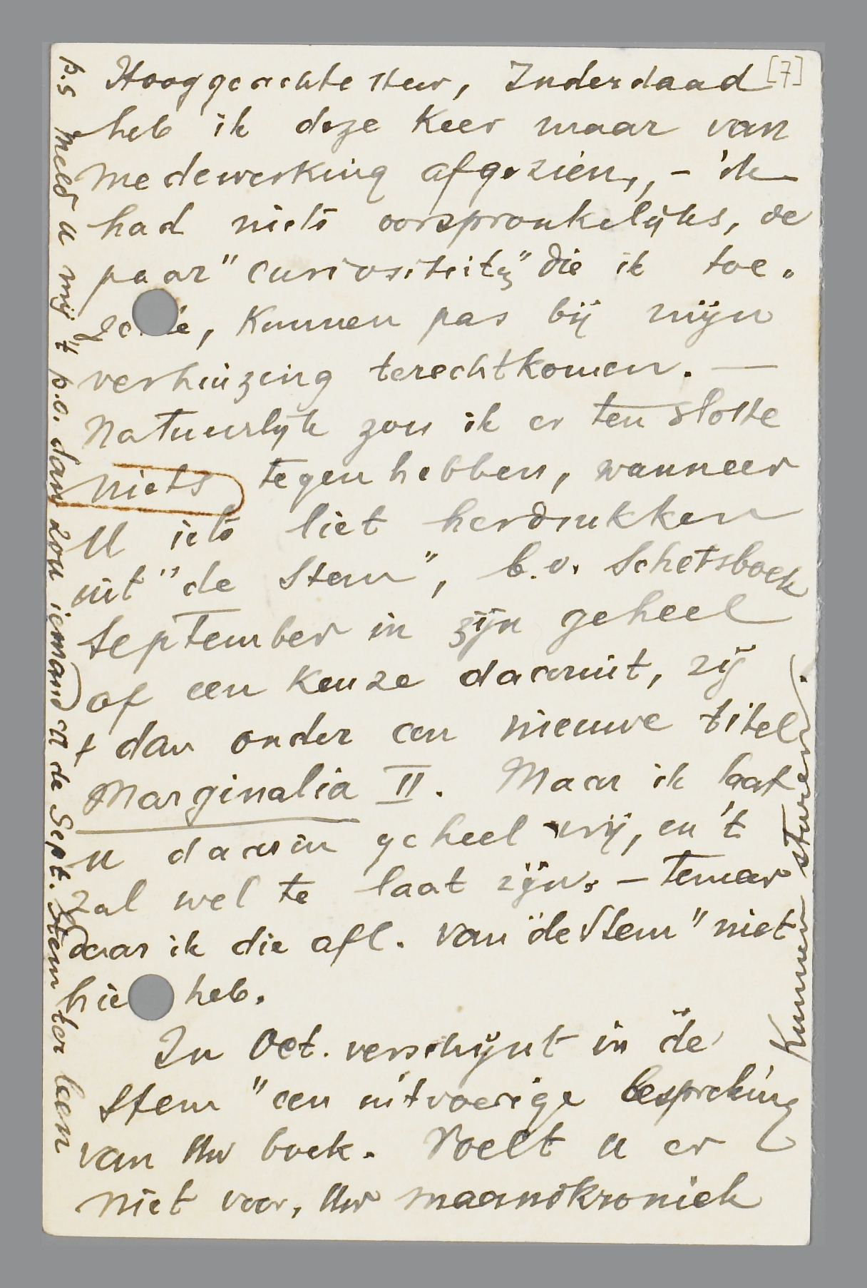 Natuurlijk zou ik er ten slotte niets tegen hebben, wanneer U iets liet herdrukken uit ‘de Stem’, b.v. Schetsboek September in zijn geheel of een keuze daaruit, zij 't dan onder een nieuwe titel Marginalia II. Maar ik laat U daarin geheel vrij, en 't zal wel te laat zijn. - Temeer daar ik die afl. van ‘de Stem’ niet hier heb.